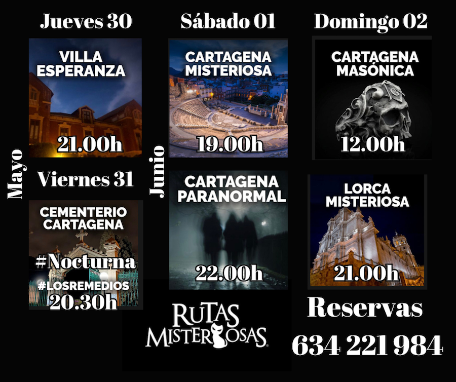 Sábado, 1 de junio: Cartagena Misteriosa (19.00 h) y Cartagena Paranormal (22.00 h).