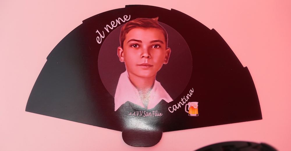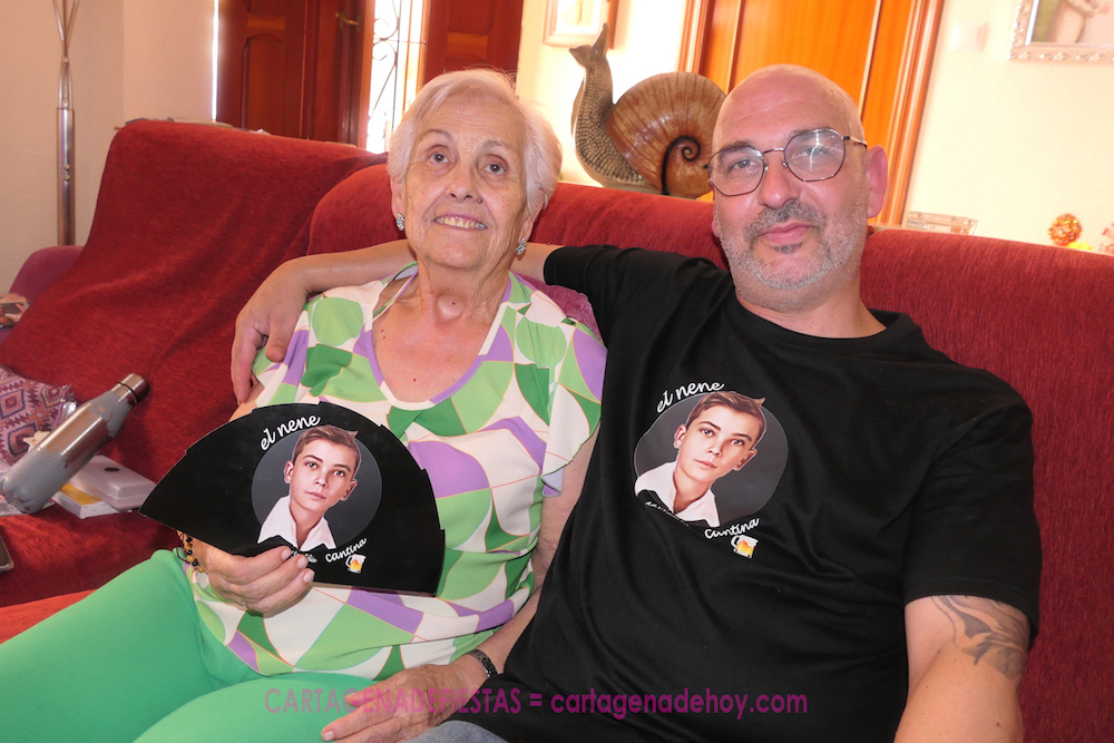 Antonio Belzunce Gómez lleva desde hace dos años y medio la cantina del local social de la barriada de Sán Félix, al cual puso el apodo de su padre, 'El Nene', quien había fallecido poco antes y al que de esta manera tributa un permanente recuerdo. En la foto, posa con su madre, María Luisa Lorca Andrés, y con los abanicos que regala con la imagen de su progenitor en edad juvenil.