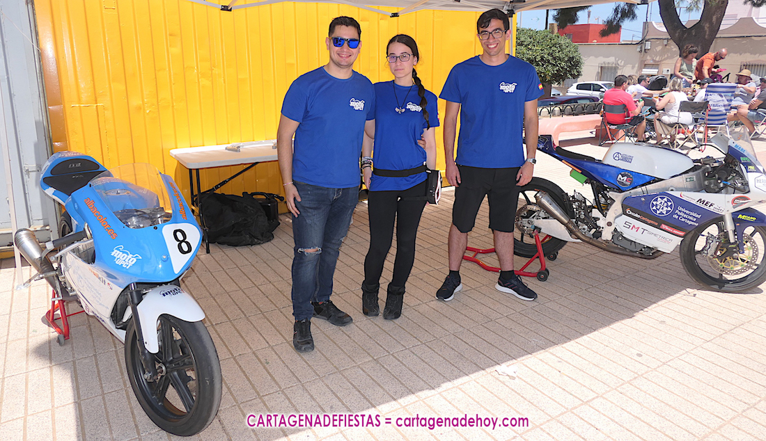 David, Patricia y Fran, estudiantes de la Escuela de Industriales de la Universidad Politécnica de Cartagena, ofrecieron en la jornada de convivencia de Vista Alegre de una exposición de prototipos de Moto3 de competición creados por los alumnos, ofreciendo también la posibilidad a empresas a que se sumen al equipo de patrocinadores.