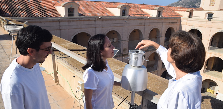 El grupo de Aerobiología de la Politécnica detecta, a través de los análisis de aerosoles de la UPCT, recurrentemente desde 2017 pólenes de la floración del cannabis en Murcia, Cartagena y Lorca. Imagen del grupo de Aerobiología sustituyendo el cabezal del captador instalado en la Escuela de Industriales.