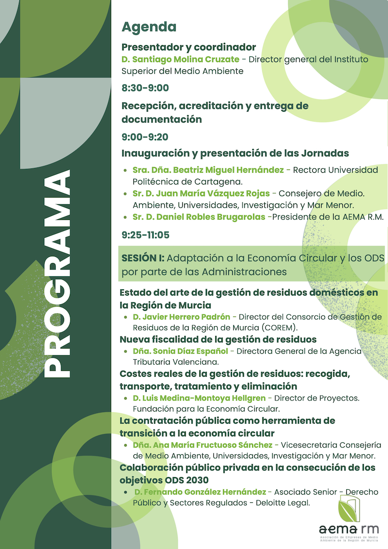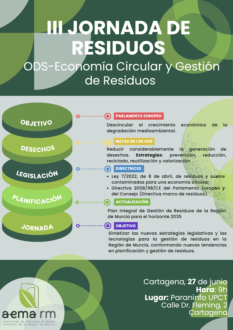 La tercera edición se celebrará el jueves de la próxima semana, día 27 de junio, a partir de las nueve horas en el Paraninfo de la Universidad Politécnica de Cartagena, bajo la organización de la Asociación de Empresas de Medio Ambiente de la Región de Murcia. El encuentro pretende sintetizar las nuevas estrategias legislativas referentes a la gestión de los residuos.