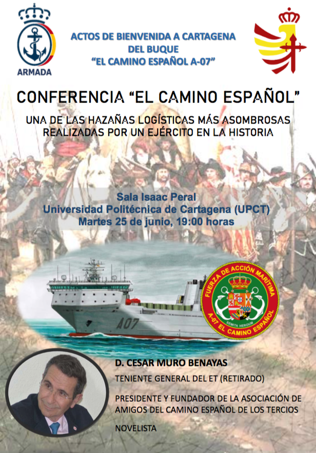 Con motivo de los actos de bienvenida a Cartagena del nuevo buque de transporte logístico “El Camino Español”, D. César Muro Benayas, Teniente General (Retirado) del Ejército de Tierra impartirá una conferencia sobre el Camino Español, la ruta que, desde la actual Italia hasta los Países Bajos, atravesando el corazón de Europa, permitió abastecer logísticamente a las tropas españolas en el norte de Europa, y cuya construcción y mantenimiento supuso un desafío de ingeniería y transporte verdaderamente asombroso.La conferencia tendrá lugar miércoles 25 de junio a las 19:00 en la sala Isaac Peral de la Universidad Politécnica de Cartagena (UPTC) y la entrada será gratuita, limitada al aforo existente.