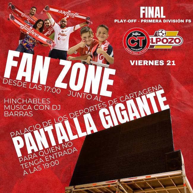 El club Jimbee Cartagena inicia a las cinco de la tarde una fiesta previa al decisivo partido por el título de la Liga Nacional de Fútbol Sala frente a ElPozo Murcia con música, hinchables y barras en la explanada exterior donde se disputará el partido a las 19 horas, donde también instalará una pantalla gigante para todos los que se han quedado sin entrada al cubrirse desde hace días todo el aforo.