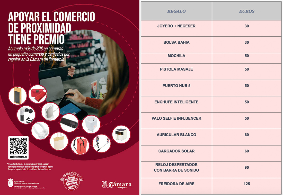 La Cámara de Comercio de Cartagena lanza 'Regalo por tiques' en el que por compras acumuladas de entre 30 y 125 euros se pueden conseguir regalos directos en los establecimientos tradicionales de la comarca. La campaña dará inicio el día uno de julio de 2024 y durará hasta el fin de existencias.