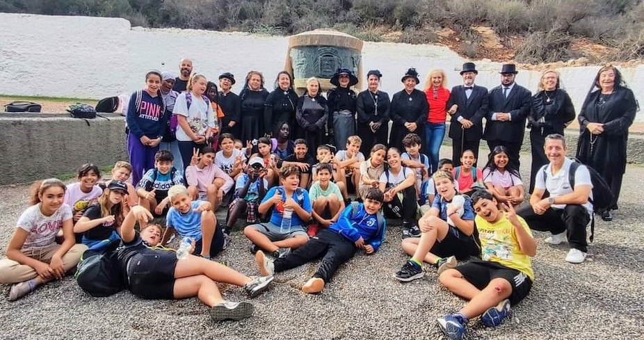 La asociación de mujeres ha realizado una visita para los alumnos del colegio de educación Infantil y Primaria de La Asomada al camposanto de Santa Lucía-Lo Campano con la finalidad de explicar a los chavales las riquezas del Modernismo que alberga, algunas todavía muy desconocidas. En la foto posan ante la tumba de Isaac Peral.