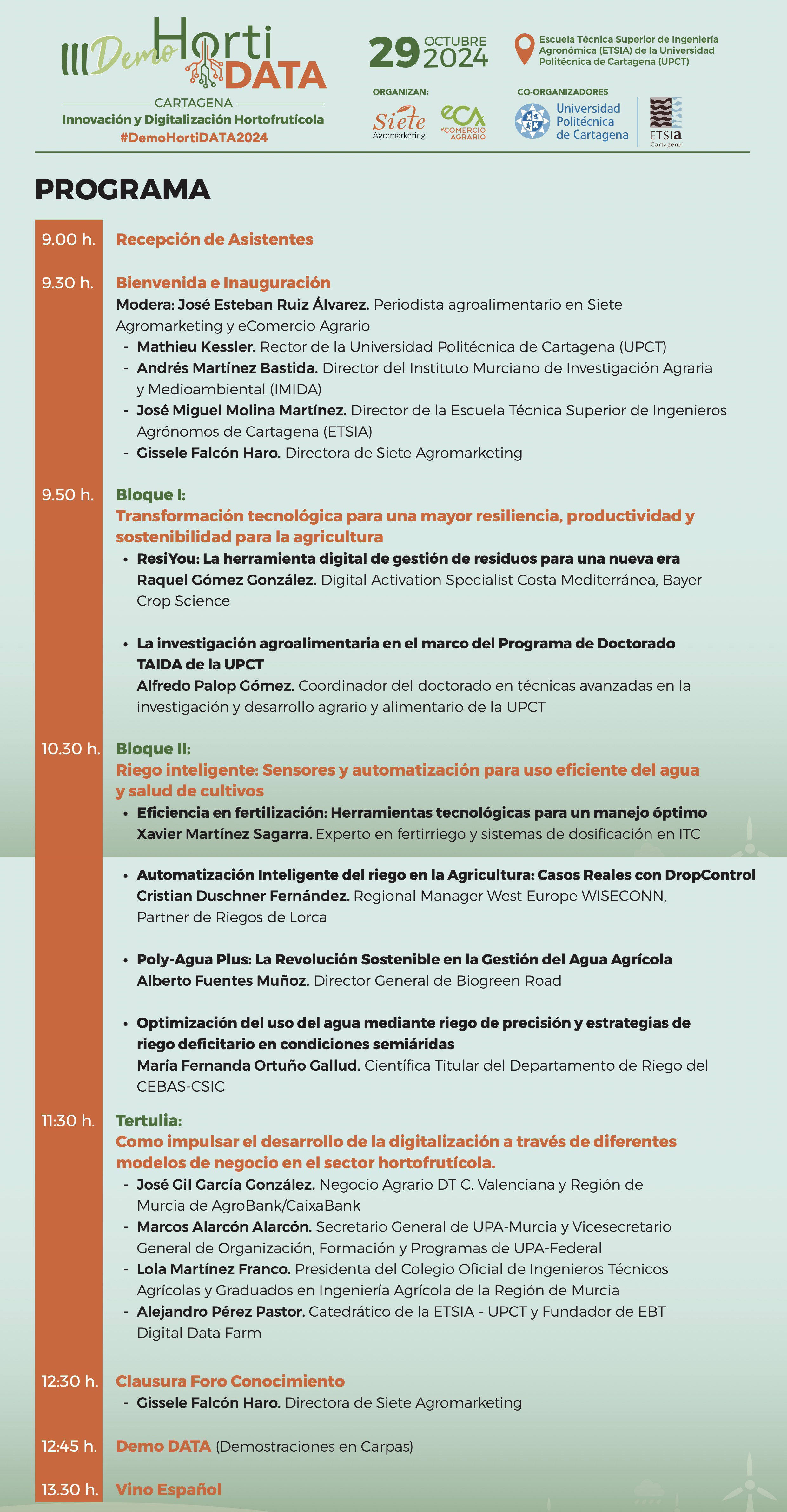 Además de la Escuela Técnica Superior de Ingeniería Agronómica (ETSIA) de la Universidad Politécnica de Cartagena (UPCT), esta III Demo HortiDATA 2024 cuenta con la colaboración de organizaciones agrarias como la Asociación de Jóvenes Agricultores (ASAJA Murcia) y la Unión de Pequeños Agricultores y Ganaderos (UPA Murcia); así como la de asociaciones y federaciones empresariales, tales como la Federación de Cooperativas Agrarias de Murcia (FECOAM); y la Asociación de Productores-Exportadores de Frutas y Hortalizas de la Región de Murcia (PROEXPORT), se suman como colaboradores a la III Demo HortiDATA Murcia 2024. También apoyan este evento tecnológico Asociación para la Promoción del Consumo de Frutas y Hortalizas ‘5 al día’, referente nacional en iniciativas relacionadas con la promoción del consumo de productos hortofrutícolas y el Consejo de Agricultura Ecológica de la Región de Murcia (CAERM).