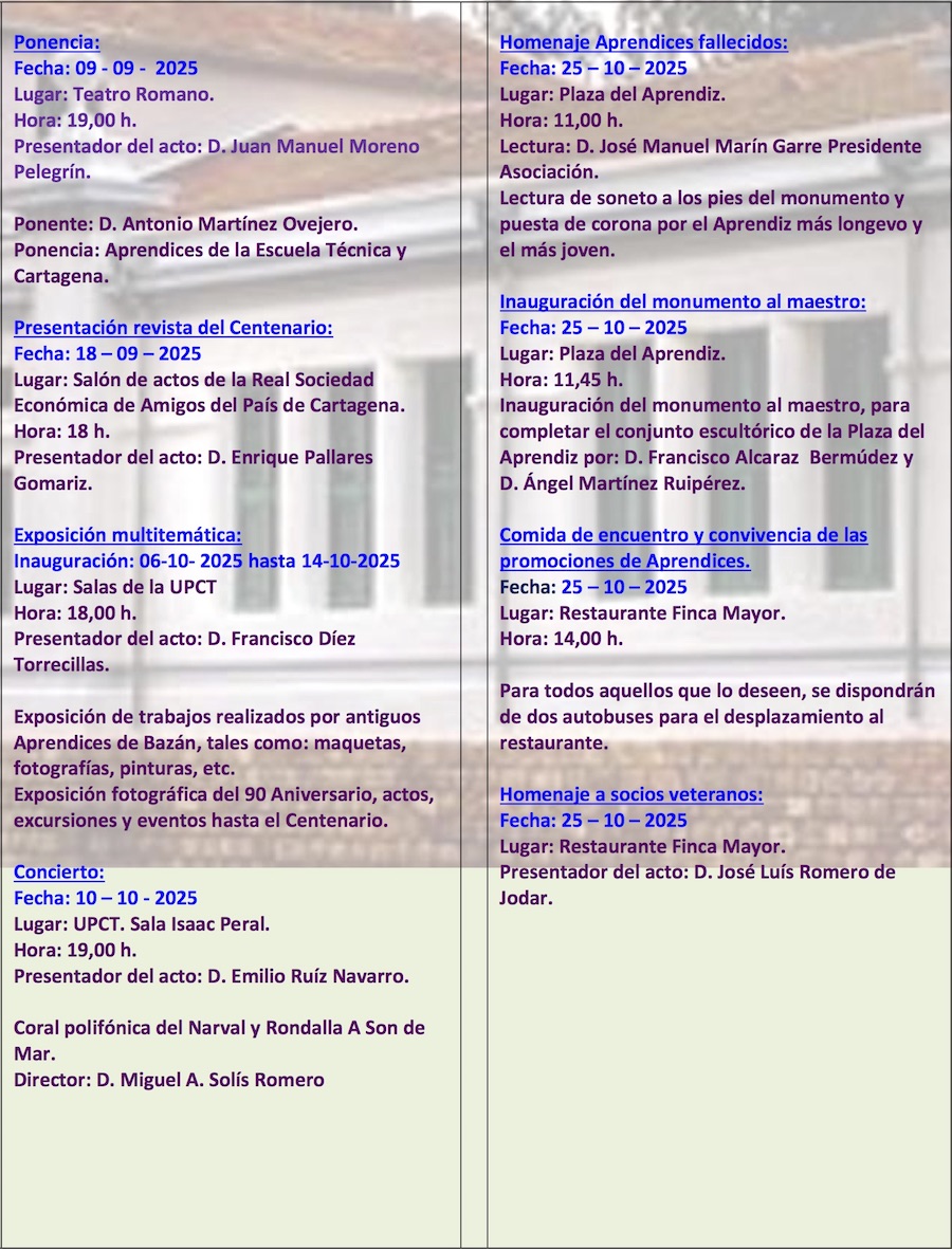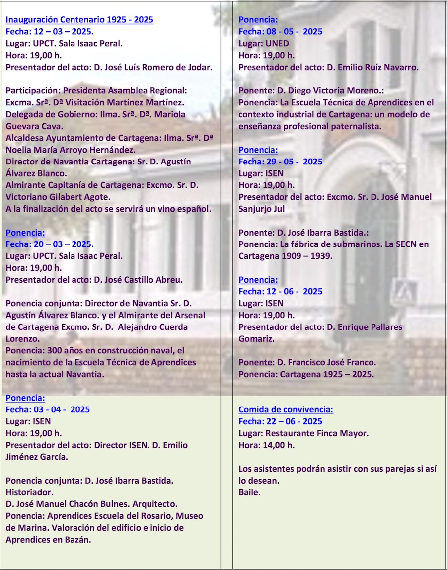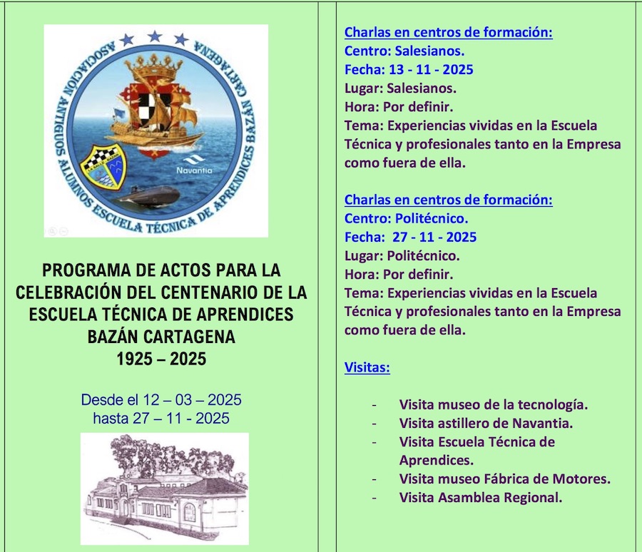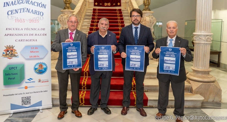 La Escuela Técnica de Aprendices de Bazán celebra su 100 aniversario con una serie de actividades que se desarrollarán en Cartagena durante este 2025. El concejal de Empresa y Formación, Álvaro Valdés, se ha reunido con los antiguos alumnos para refrendar el impulso del Consistorio a esta efeméride de la primera escuela de formación profesional que transformó el tejido industrial de Cartagena.