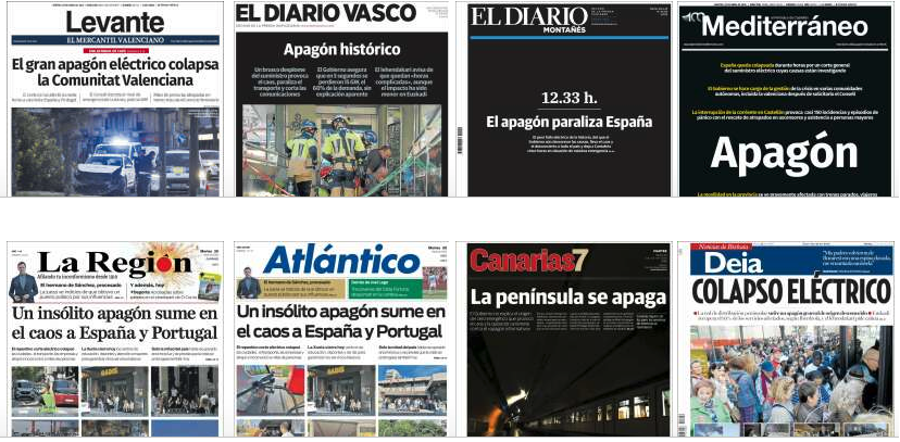 Es uno de los titulares que la prensa escrita ofrece sobre el inesperado corte del suministro eléctrico que afecta a la península ibérica y cuyo origen se desconoce. Otros diarios apuestan por introducir palabras como caos, colapso, paralización o desconexión.