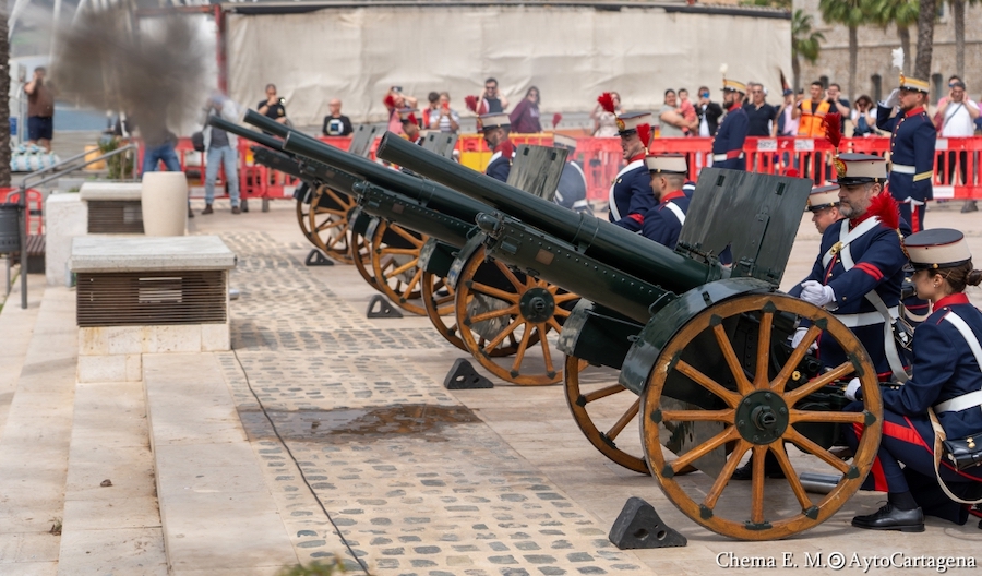 Cartagena conmemora con los artilleros el 2 de mayo. El primer teniente alcalde, Diego Salinas, junto al presidente de la Autoridad Portuaria, Pedro Pablo Hernández; el concejal delegado de Nuevas Tecnologías, Administración Electrónica y Transparencia, Diego Lorente, y ediles de la corporación municipal han asistido al acto militar celebrado en el puerto junto a la bandera nacional.