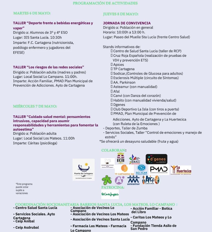 Desde este martes y hasta el jueves se desarrollan diversos talleres en locales de Lo Campano, Los Mateos y el instituto de 'a Isla', teniendo lugar el jueves por la mañana una convivencia en el paseo del muelle, frente al centro de salud con estand informativos de una quince de colectivos, además de actividades y un desayuno saludable.