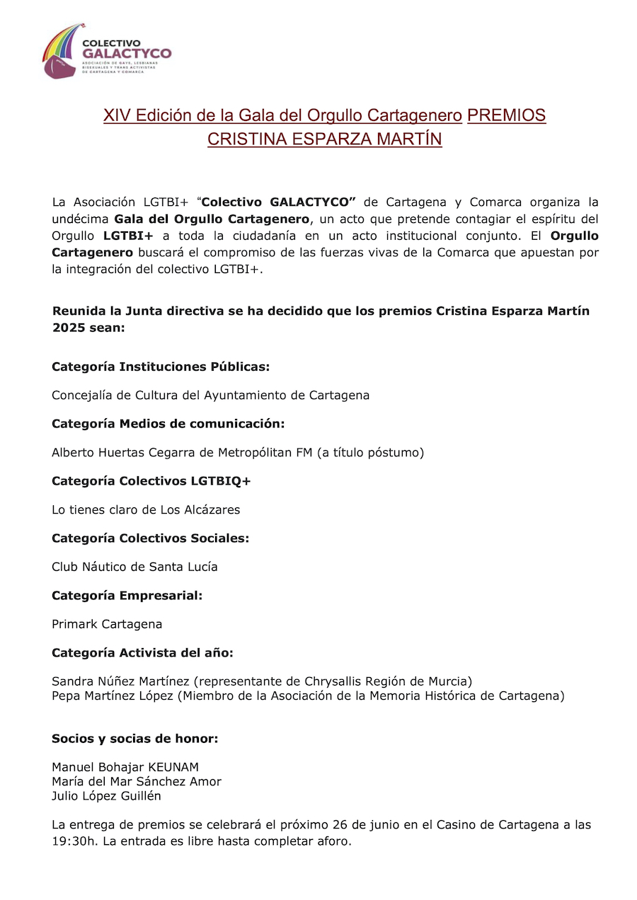 El próximo 26 de junio, la Asociación de lesbianas, gays, trans y bisexuales activistas de Cartagena y Comarca “Colectivo GALACTYCO” celebrará la XIV Gala del Orgullo Cartagenero. Este acto en el que se entregan los premios Cristina Esparza Martín, tendrá lugar en el Casino de Cartagena a las 19:30h