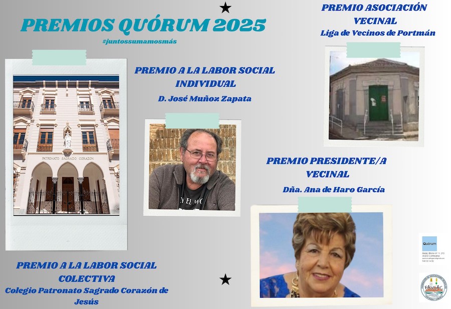 'Premios Quórum', que concede la Federación de Asociaciones de Vecinos de Cartagena y Comarca 'Fernando Garrido', aumentan a cuatro categorías en la edición de este año con la incorporación del reconocimiento a un presidente vecinal, siendo Ana de Haro, del Ensanche-Almarjal, la elegida para su estreno Los otros distinguidos de esta edición son la Liga de Vecinos de Portmán, el colegio del Patronato del Sagrado Corazón de Cartagena y José Muñoz Zapata.