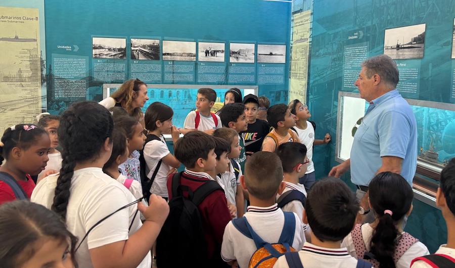 La jornada comenzó con una visita muy especial a la Sala Isaac Peral, donde los escolares premiados pudieron conocer de cerca el emblemático submarino Peral y profundizar en su historia y significado para la ciudad. Durante la visita, los alumnos tuvieron la oportunidad de adentrarse en el despacho original de Isaac Peral, fielmente conservado en el museo, donde fueron recibidos —con gran sorpresa y entusiasmo— por el propio Isaac Peral, representado por Jesualdo Lisón. Allí, Peral compartió con los asombrados alumnos detalles sobre la construcción de su submarino y el impacto que tuvo en su época.