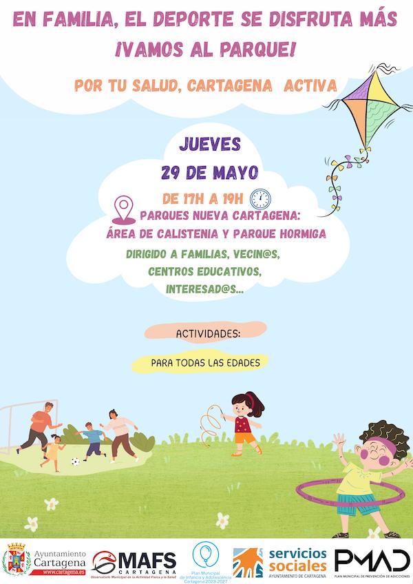Esta actividad se realiza en colaboración la Unidad de Infancia con el Observatorio Municipal de la Actividad física y la Salud de Política Social del Ayuntamiento de Cartagena y la Federación de Asociaciones Vecinales de Cartagena y Comarca (FAVCAC). El objetivo es motivar a las personas a utilizar su tiempo de ocio en familia realizando actividad física en los equipamientos biosaludables del barrio.