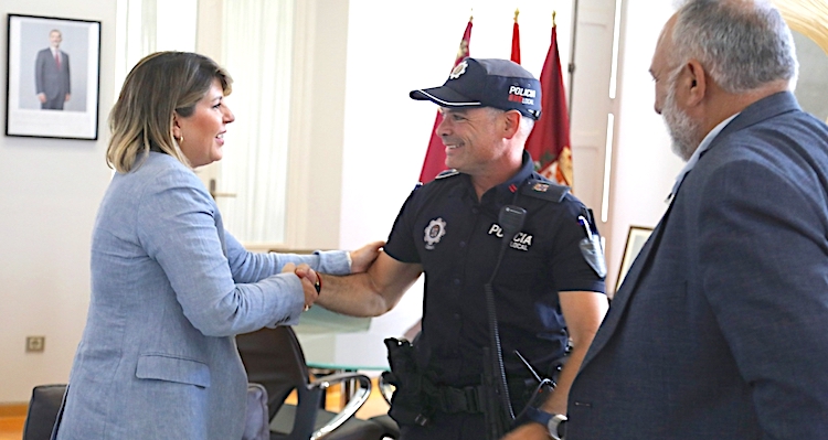 La alcaldesa de Cartagena, Noelia Arroyo, ha felicitado esta mañana al agente Manuel Parga del Castillo, el policía local que salvó ayer la vida de una mujer con discapacidad atrapada en el incendio de su casa.