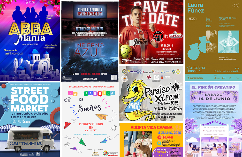La propuestas se suceden entre hoy y el domingo con el mercado de comida callejera, las representaciones de la escuela municipal de teatro, flamenco en Santa Lucía y en el Museo Arqueológico, proyección inmersiva de película en la Cortina y de documental sobre la naturaleza en Fundación Mediterráneo, 'El rincón creativo' en Plaza Castellini, visita teatralizada al Palacio de Aguirre, 'Paraíso Xtrem' junto al Mar Menor, partido decisivo de Jimbee de fútbol sala, musical sobre Abba en El Algar, marcha canina...
