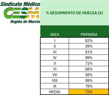 El paro, convocado por la Confederación Española de Sindicatos Médicos CESM y el Sindicato Médico Andaluz SMA, se ha acompañado de concentraciones a puertas de hospitales y centros de salud con una afluencia numerosa de profesionales que han dicho “no” al texto del ministerio. A nivel regional el paro ha sido del 72%, bajando al 59% en el área que abarca Cartagena, La Unión, Fuente Álamo y Mazarrón.