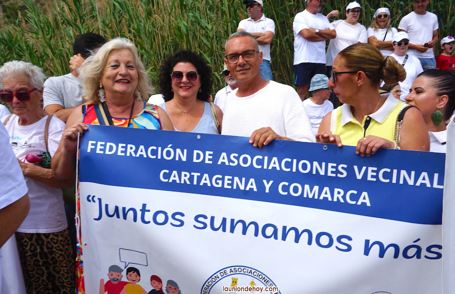 Vecinos de varios puntos de la geografía cartagenera se han sumado hoy a la concentración y cadena humana llevada a cabo en la playa de Portmán para exigir al gobierno de España que descarte el sellado y acometa la regeneración de la bahía de Portmán.