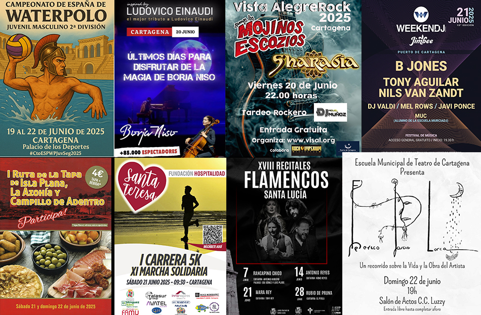 'Vistalegre Rock' y 'WeekenDJ' son las dos grandes apuestas musicales y en ambos casos con entrada gratuita. También hay citas con el pianista Borja Niso, con las 'Joyas sonoras renacentistas' y con el flamenco en Santa Lucía. En el oeste se estrena ruta de la tapa y comienzas las fiestas populares en varias localidades del amplio municipio cartagenero. En el deporte, waterpolo y balonmano son los grandes protagonistas, además de la carrera para ayudar a la Hospitalidad de Santa Teresa.