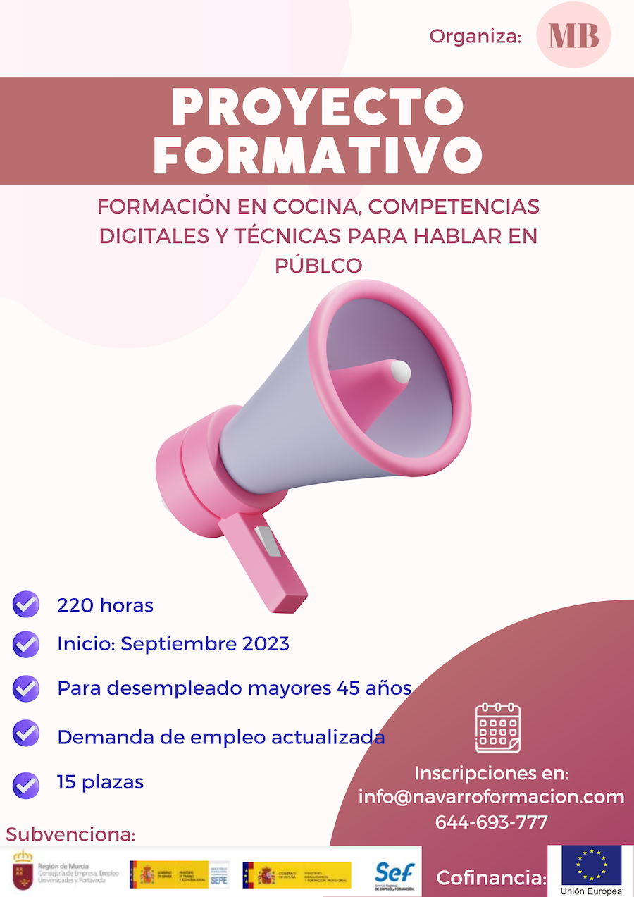 'Proyecto formativo' abarca la formación en cocina, la formación en competencias digitales y las técnicas para hablar en público. Es gratuito y consta de 220 horas, estando dirigido a personas sin empleo de más de 45 años de edad. Comenzará en septiembre, pero hay sólo 15 plazas, por lo que te aconsejamos que no tardes en inscribirte.
