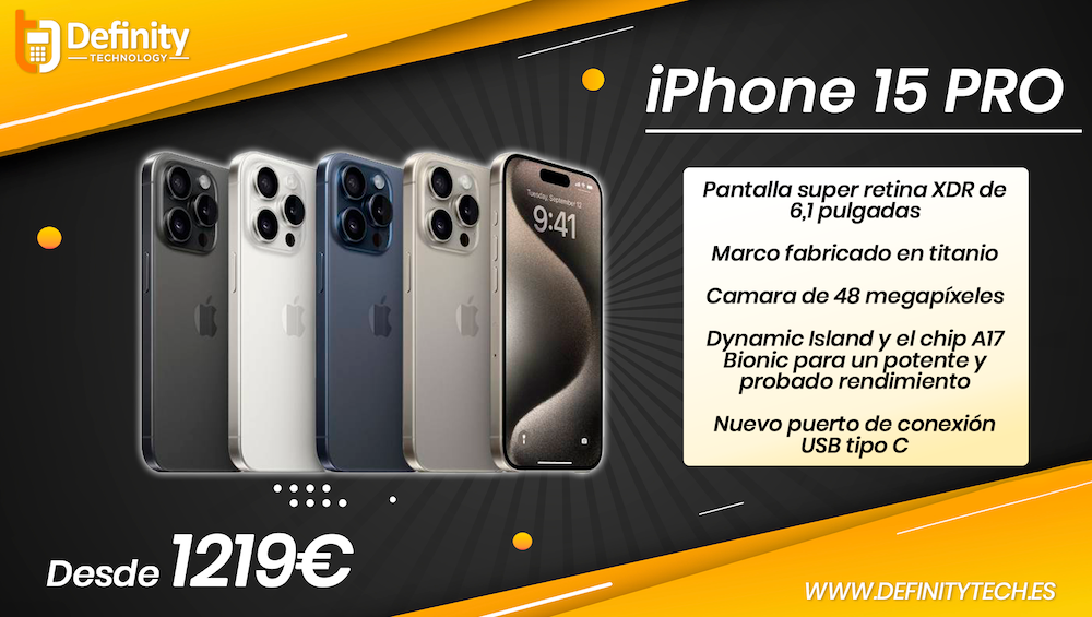 iPhone 15 PRO ya está aquí con un chip A17 rompedor. Robusto y ligero. Forjado en titanio con calidad aeroespacial. Incorpora un nuevo botón 'Ación', el mayor zoom óptico (120 mm), grabaciones mágicas, 29 horas de reproducción de vídeo, para jugar a los bestia... Con este móvil tienes la mayor autonomía posible. Lo tienes por un precio genial en Definity Technology a través de internet o en la tienda física de La Unión.