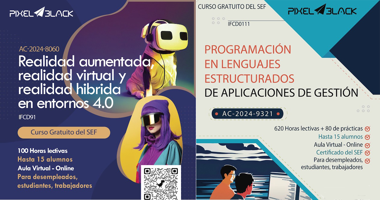 'Realidad aumentada, realidad virtual y realidad híbrida en entornos 4.0' y 'Programación en lenguajes estructuras de aplicaciones de gestión' son las propuestas del SEF que canaliza el centro de formación para desempleados, estudiantes y trabajadores, en general. Quince plazas máximos en cada uno. No tardes en apuntarte.