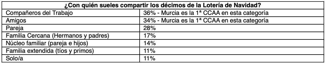 Compartir décimos es una de una tradición de la Lotería de Navidad, y en Murcia, este hábito alcanza cifras destacadas. Un 36% de los murcianos juega con sus compañeros de trabajo y un 34% lo hace con amigos, muy por encima de la media nacional, que se limita al 17% y 18%, respectivamente.