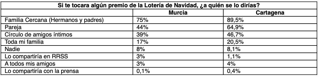 A pesar de esta alta participación colectiva, la prudencia prevalece en caso de ganar. Un 75% de los encuestados en la región asegura que solo compartiría la noticia con su familia más cercana (hermanos, padres, hijos y pareja). Datos especialmente altos en Cartagena: