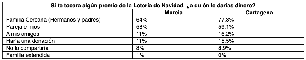 Murcia se posiciona también como una de las comunidades más generosas. Un 92% de los murcianos afirma que compartirían su premio, independientemente de su cuantía, de los cuales un 11% estaría dispuesto a donar parte del premio a causas benéficas.