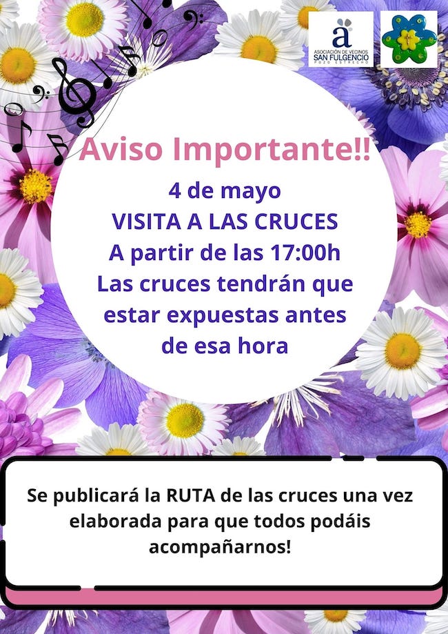 La asociación de vecinos ‘San Fulgencio’ informa que el recorrido por las cruces de mayo en el pueblo se llevará a cabo este próximo sábado por la tarde, por lo que deben estar expuestas antes de las 17 horas.
