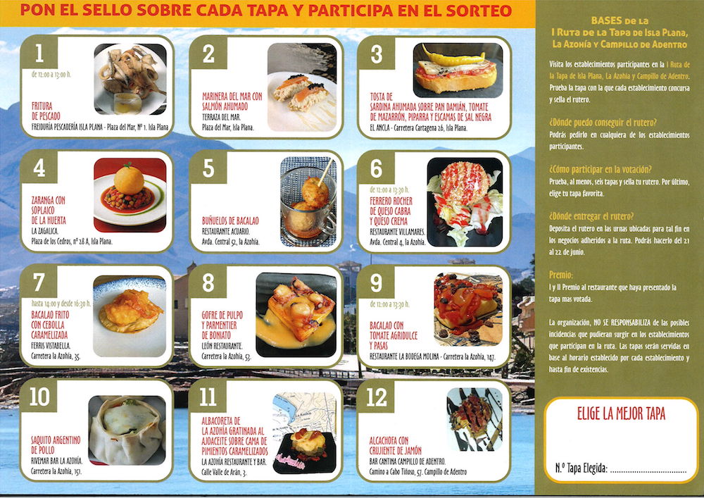 La clientela podrá votar para elegir la mejor tapa, con premios para los hosteleros con mayor número de votos. Los negocios participantes son los siguientes: Freiduría Pescadería Isla Plana, Terraza del Mar, El Ancla, La Zagalica, Restaurante Acuario, Restaurante Vellamares, Ferris Vistabella, León Restaurante, La Bodega Molina, Rivemar Bar, La Azohía Restaurante y Bar, y la Cantina de Campillo de Adentro. En las imágenes adjuntas a la noticia se incluye el rutero con la descripción e imágenes de todas las tapas.