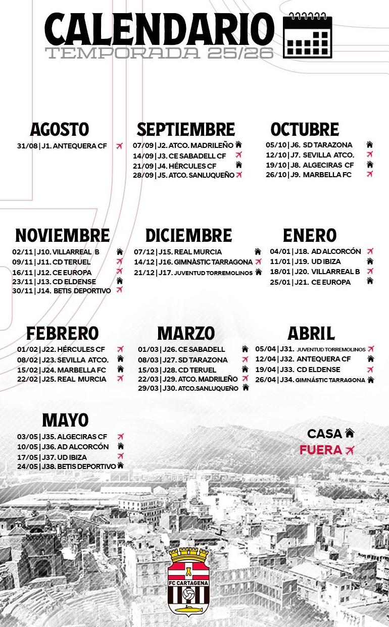 El retorno del equipo blanquinegro al fútbol no profesional comenzará el 31 de agosto visitando al equipo malagueño, que esta pasada temporada ha disputado la fase de ascenso, mientras que el filial del Altético de Madrid será el 7 de septiembre el primer visitante del Cartagonova. La liga regular acabará el 24 de mayo de 2025.