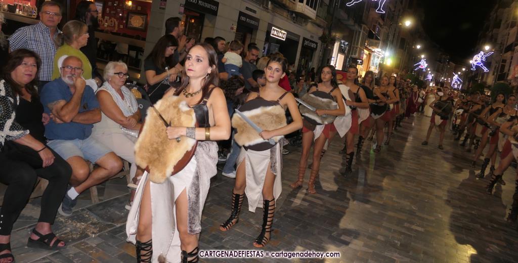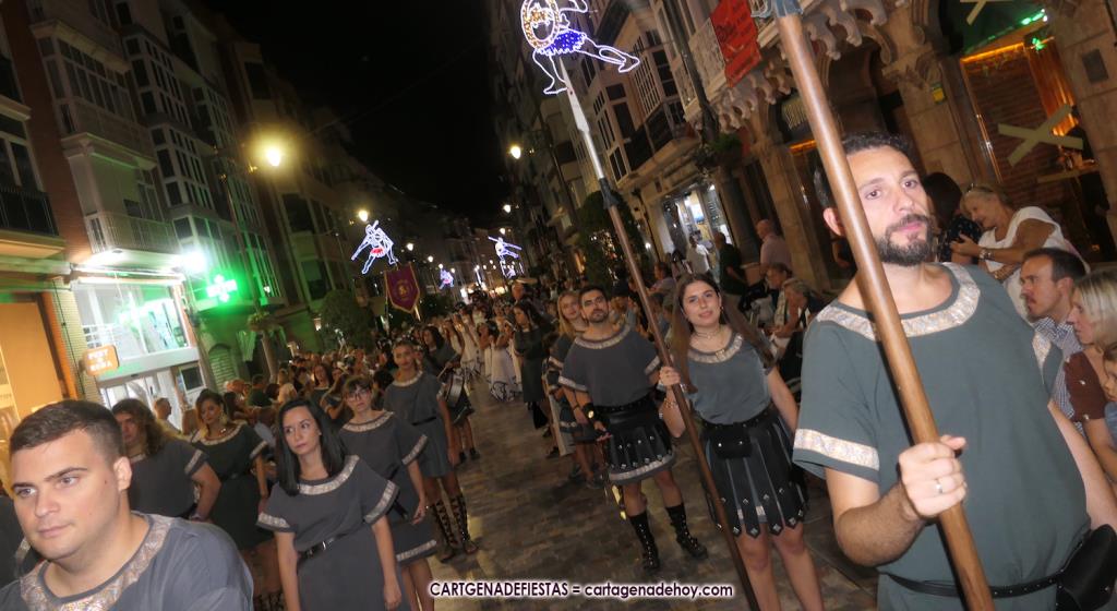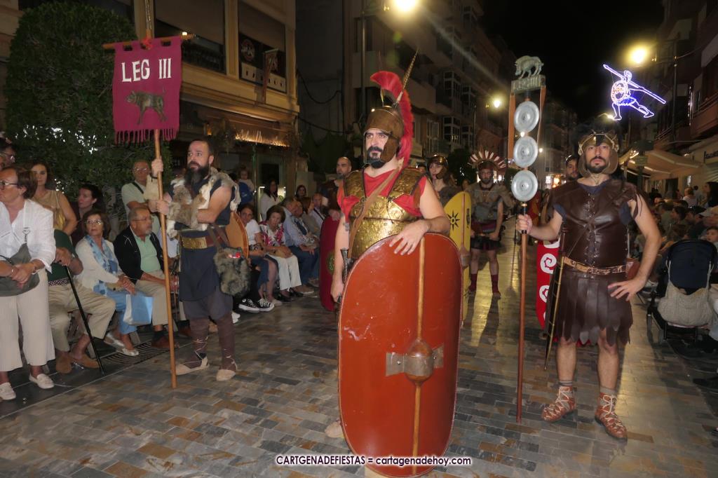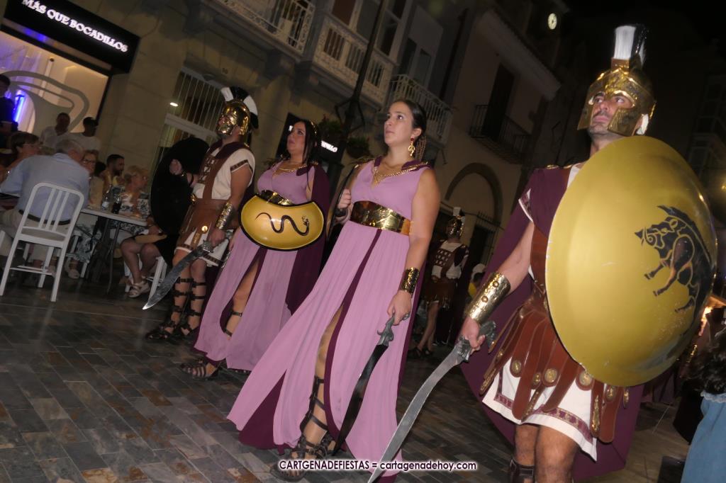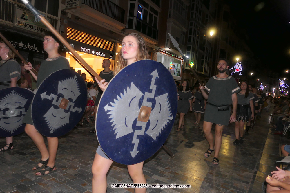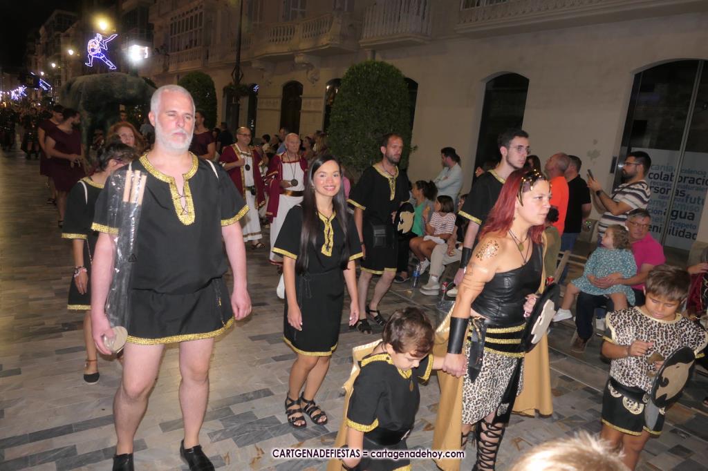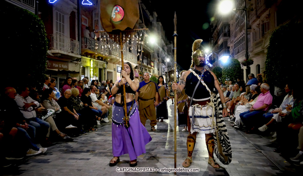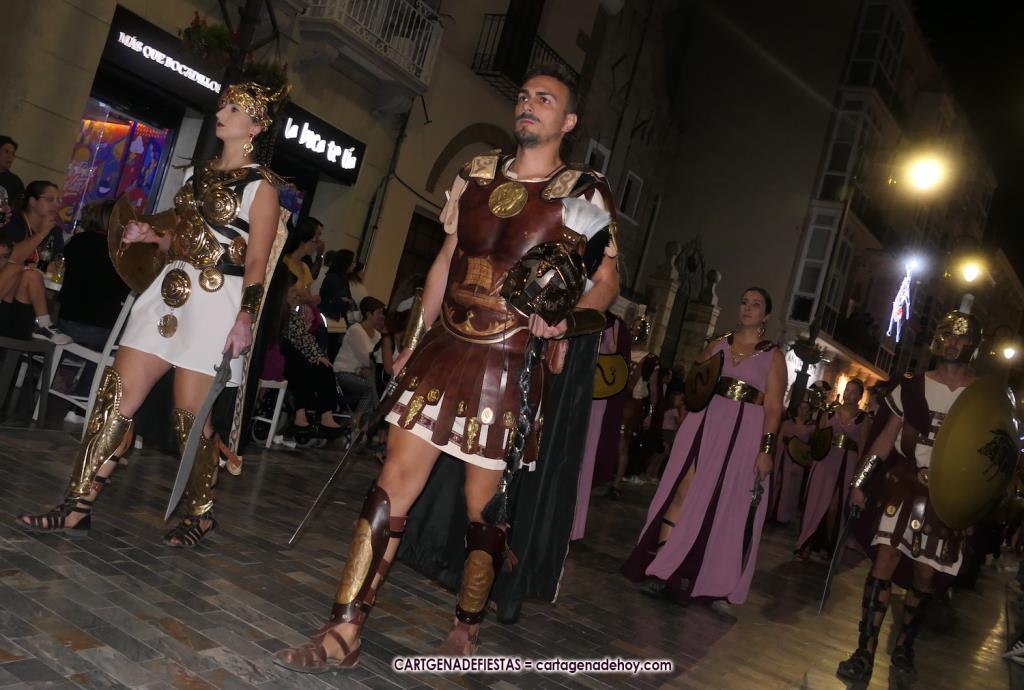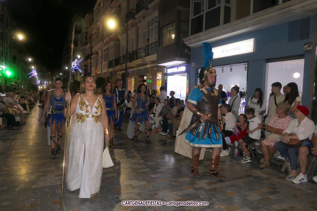 Unas cuatro mil personas (quizás más, pues hay 6.800 festeros) han desfilado por la ciudad con una gran variedad de vestuarios (todos con base histórica) y una amplia representación de personajes históricos y de dioses, unos en carne y hueso y otros a través de figuras que eran llevadas en movimiento. Durante unas tres horas, una infinidad de espectadores han disfrutado de paso de las tropas y legiones de Carthagineses y Romanos, que iban en turnos mezclados y aderezados por algunos grupos de animación. El destino ha sido el campamento.