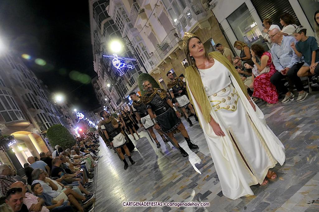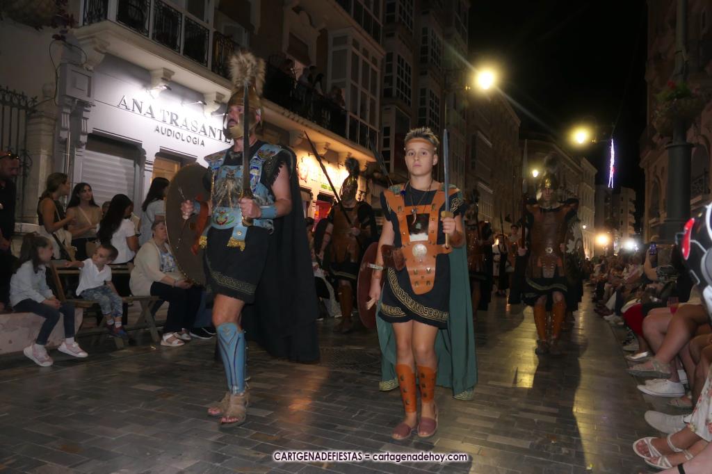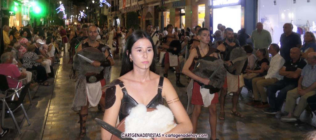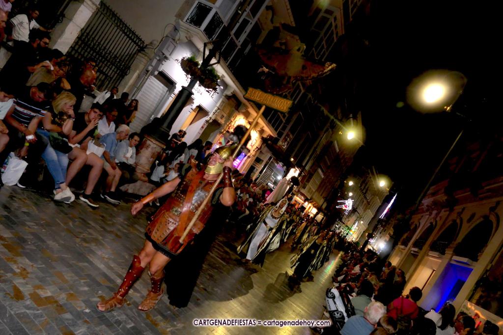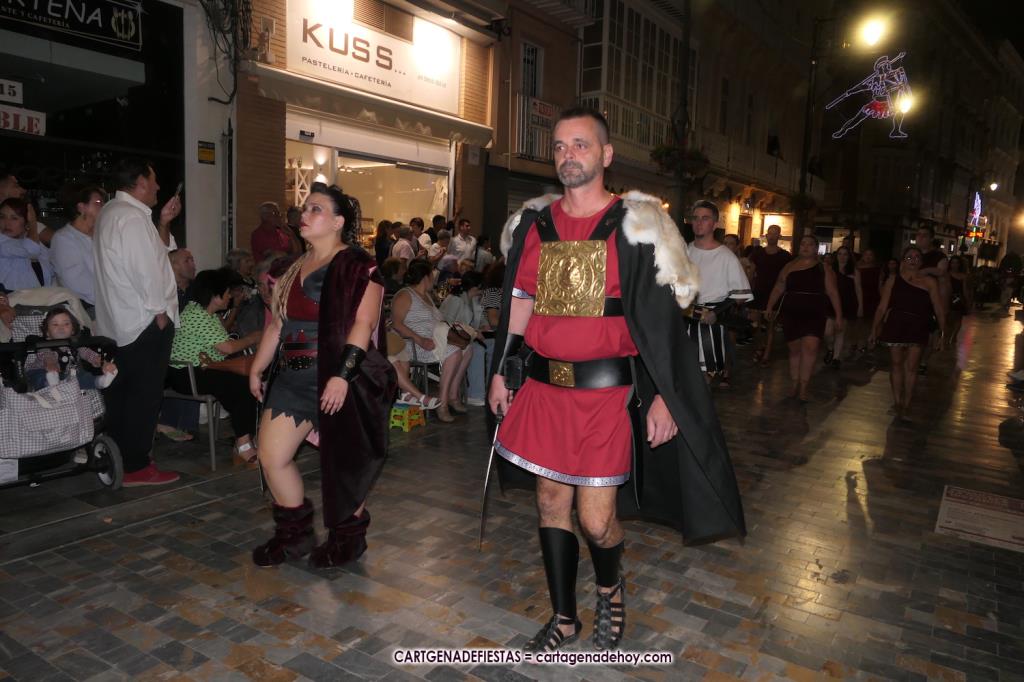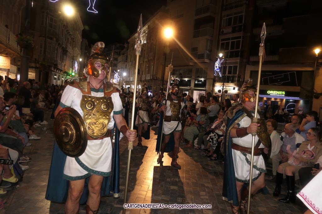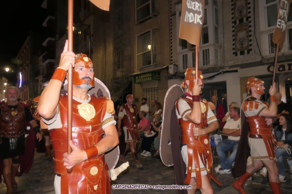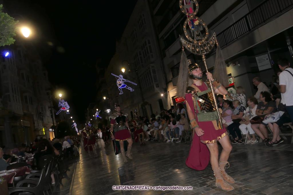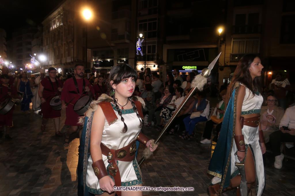 Unas cuatro mil personas (quizás más, pues hay 6.800 festeros) han desfilado por la ciudad con una gran variedad de vestuarios (todos con base histórica) y una amplia representación de personajes históricos y de dioses, unos en carne y hueso y otros a través de figuras que eran llevadas en movimiento. Durante unas tres horas, una infinidad de espectadores han disfrutado de paso de las tropas y legiones de Carthagineses y Romanos, que iban en turnos mezclados y aderezados por algunos grupos de animación. El destino ha sido el campamento.