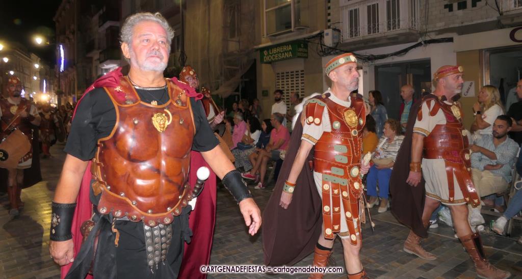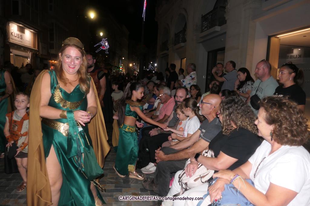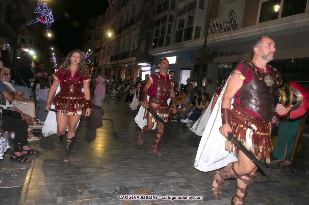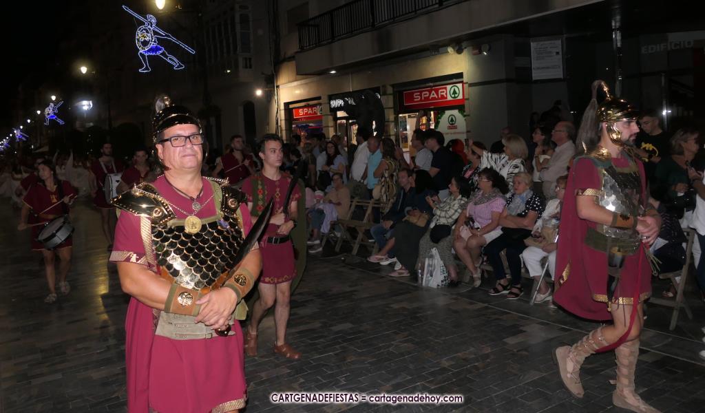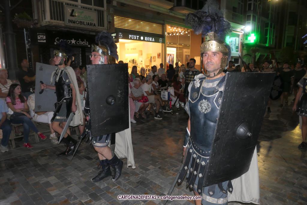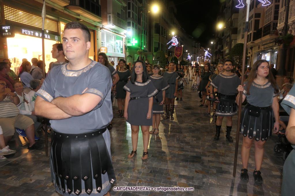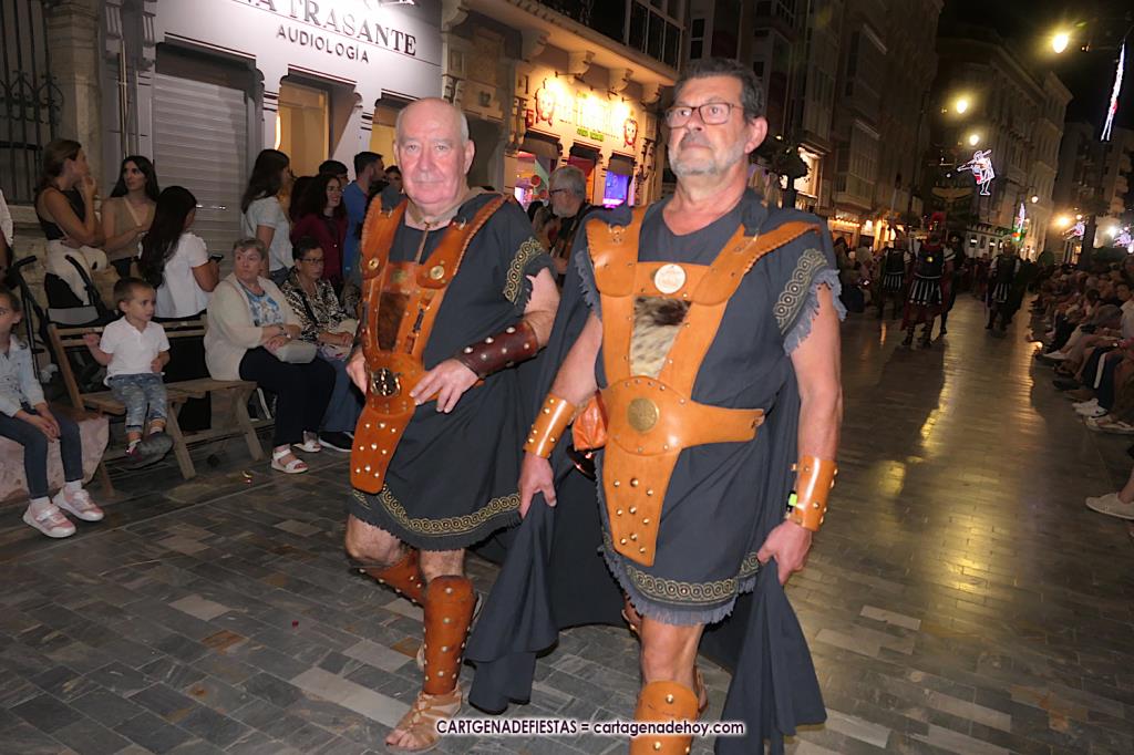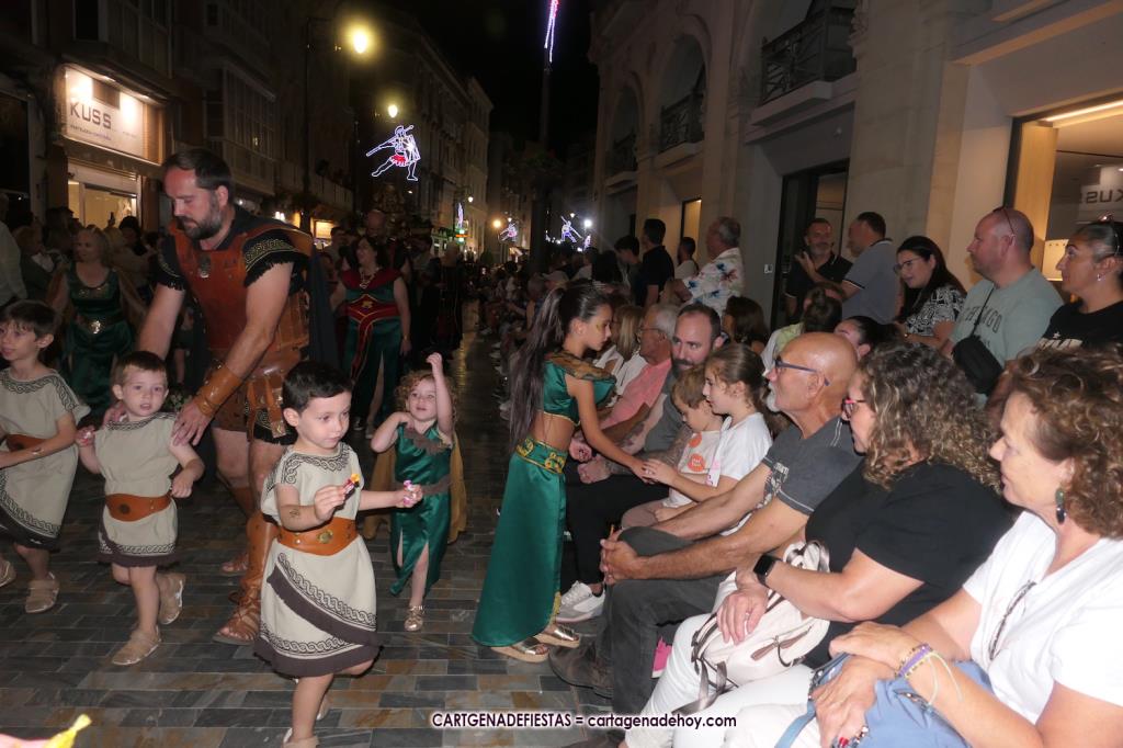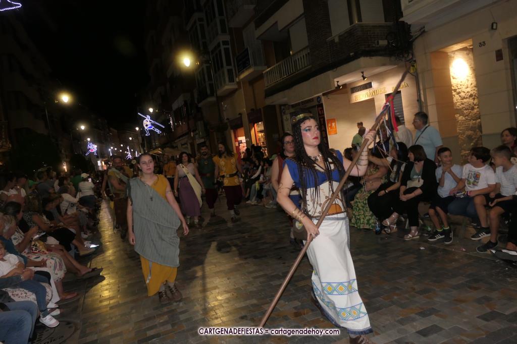 Unas cuatro mil personas (quizás más, pues hay 6.800 festeros) han desfilado por la ciudad con una gran variedad de vestuarios (todos con base histórica) y una amplia representación de personajes históricos y de dioses, unos en carne y hueso y otros a través de figuras que eran llevadas en movimiento. Durante unas tres horas, una infinidad de espectadores han disfrutado de paso de las tropas y legiones de Carthagineses y Romanos, que iban en turnos mezclados y aderezados por algunos grupos de animación. El destino ha sido el campamento.