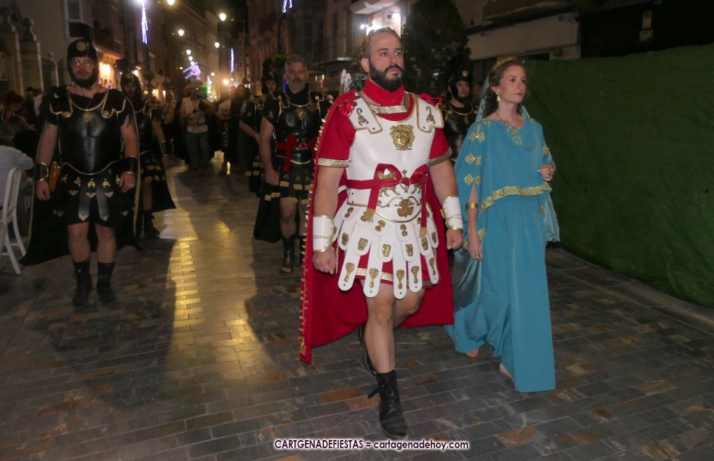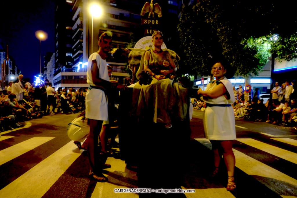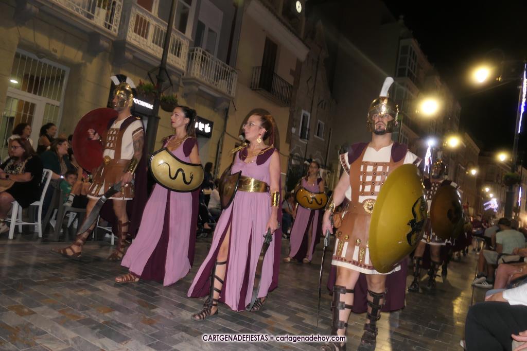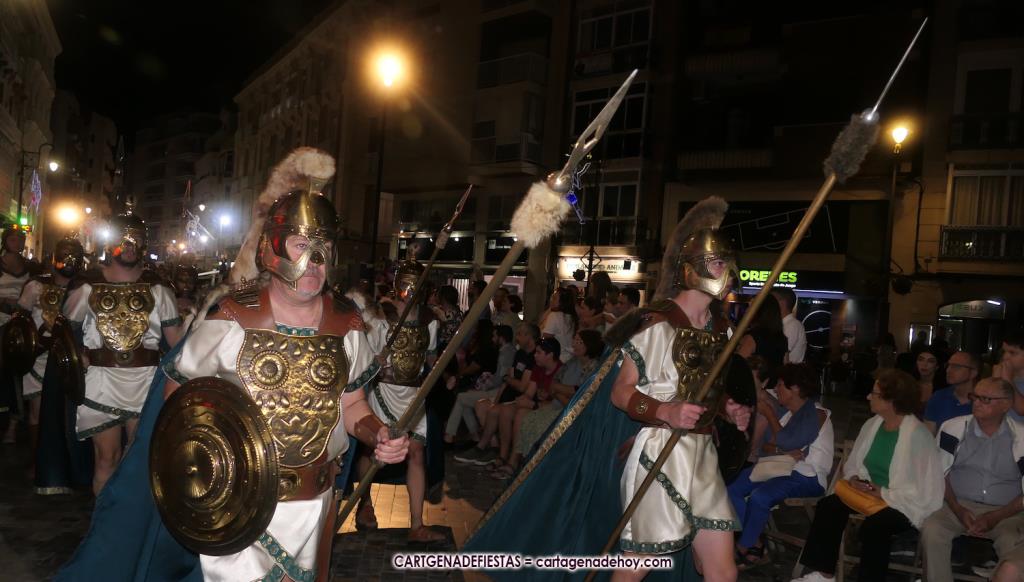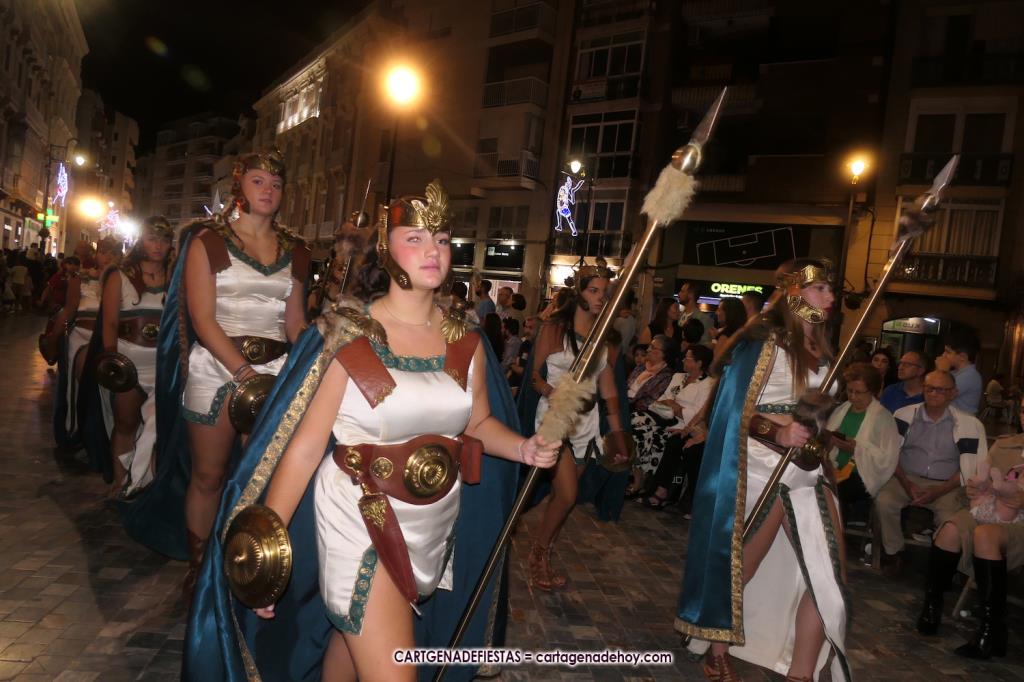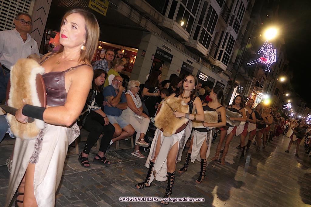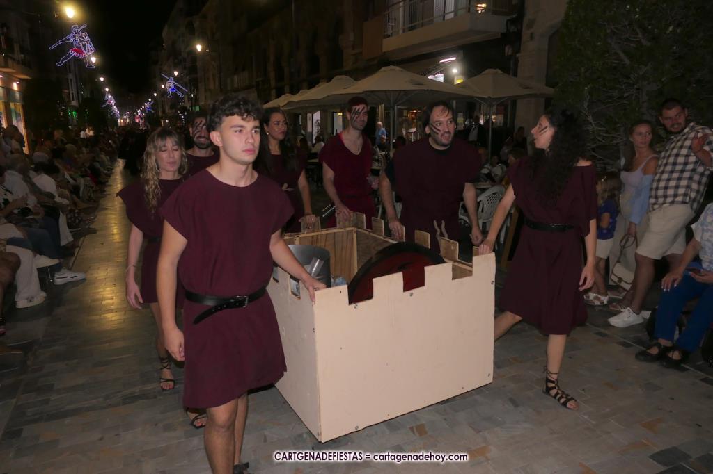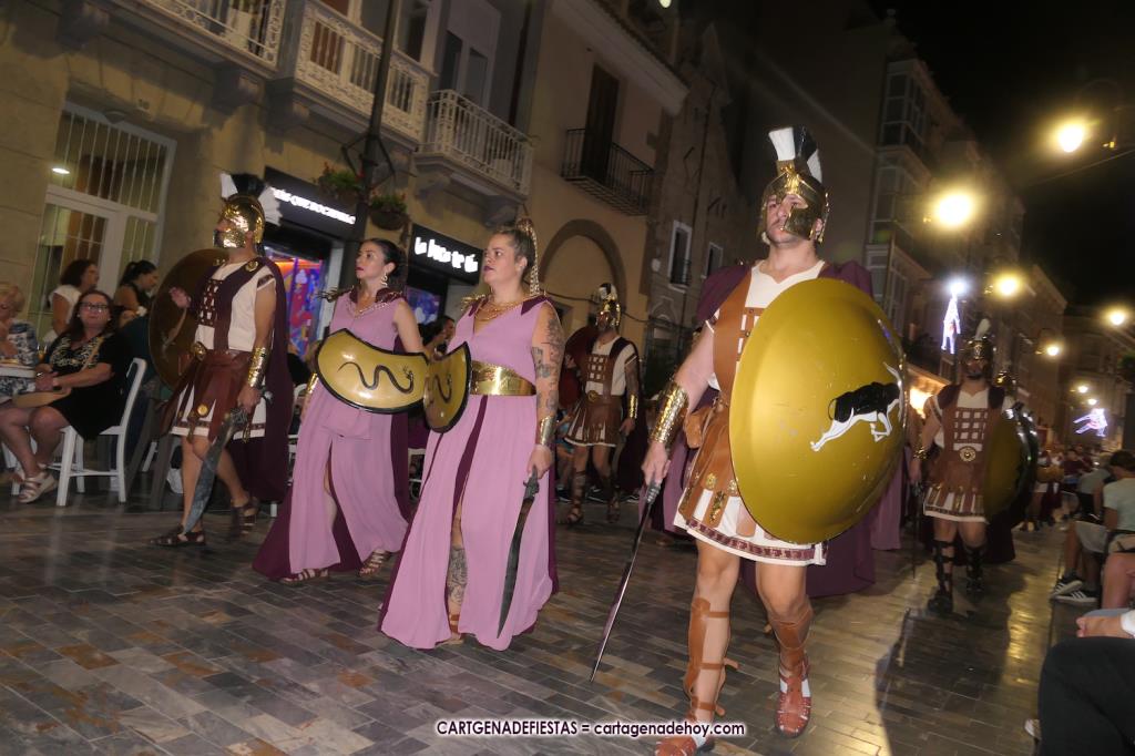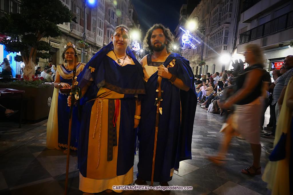 Unas cuatro mil personas (quizás más, pues hay 6.800 festeros) han desfilado por la ciudad con una gran variedad de vestuarios (todos con base histórica) y una amplia representación de personajes históricos y de dioses, unos en carne y hueso y otros a través de figuras que eran llevadas en movimiento. Durante unas tres horas, una infinidad de espectadores han disfrutado de paso de las tropas y legiones de Carthagineses y Romanos, que iban en turnos mezclados y aderezados por algunos grupos de animación. El destino ha sido el campamento.