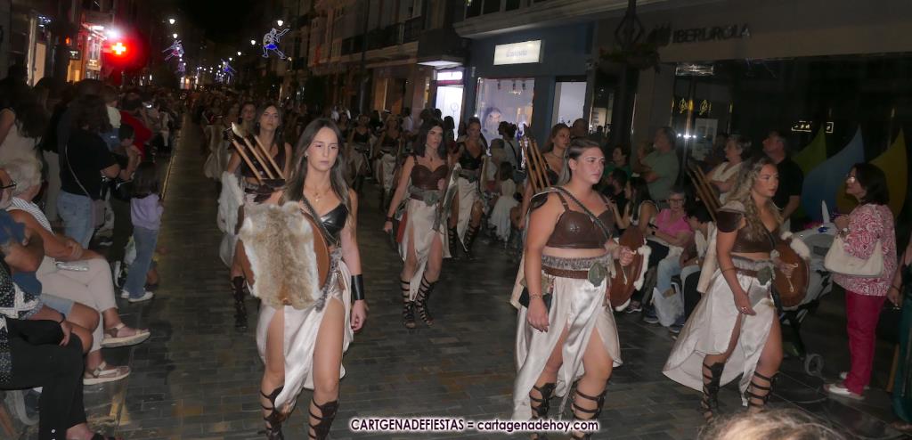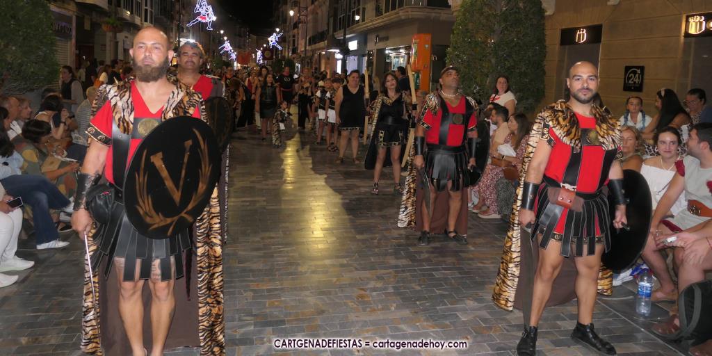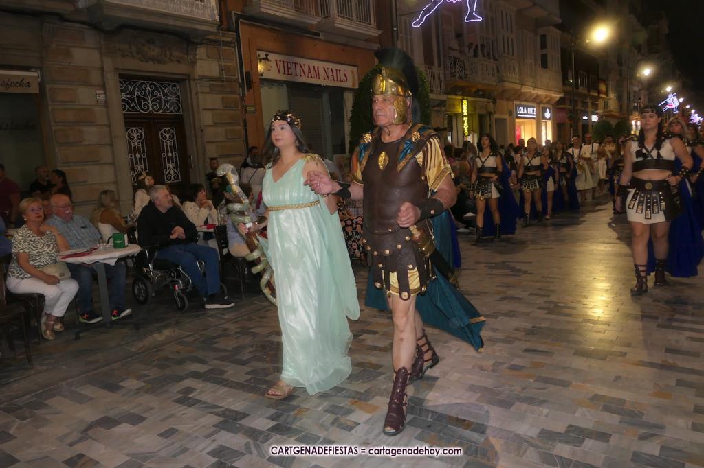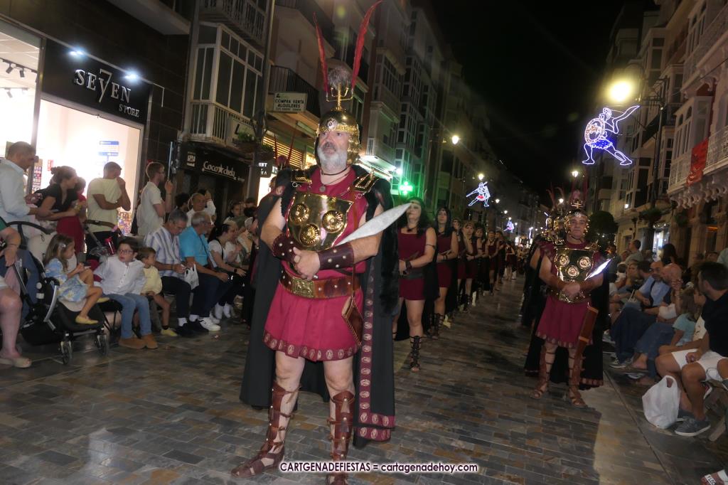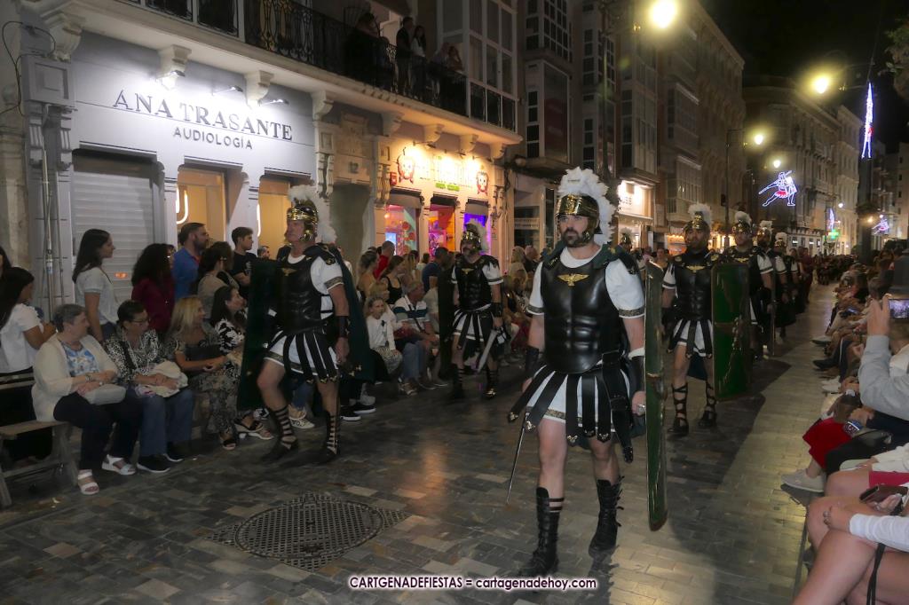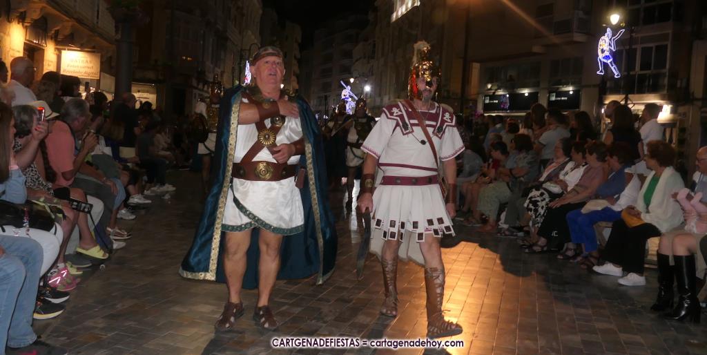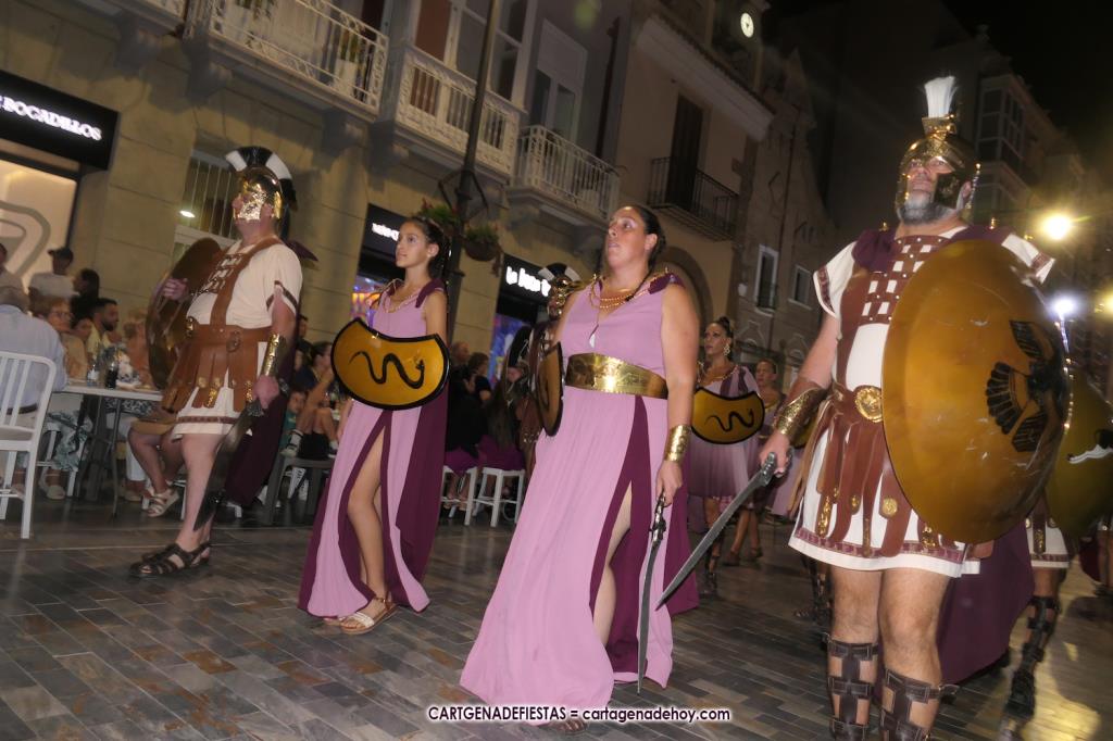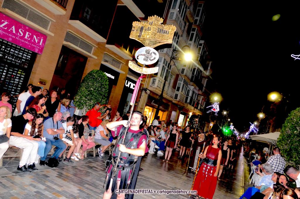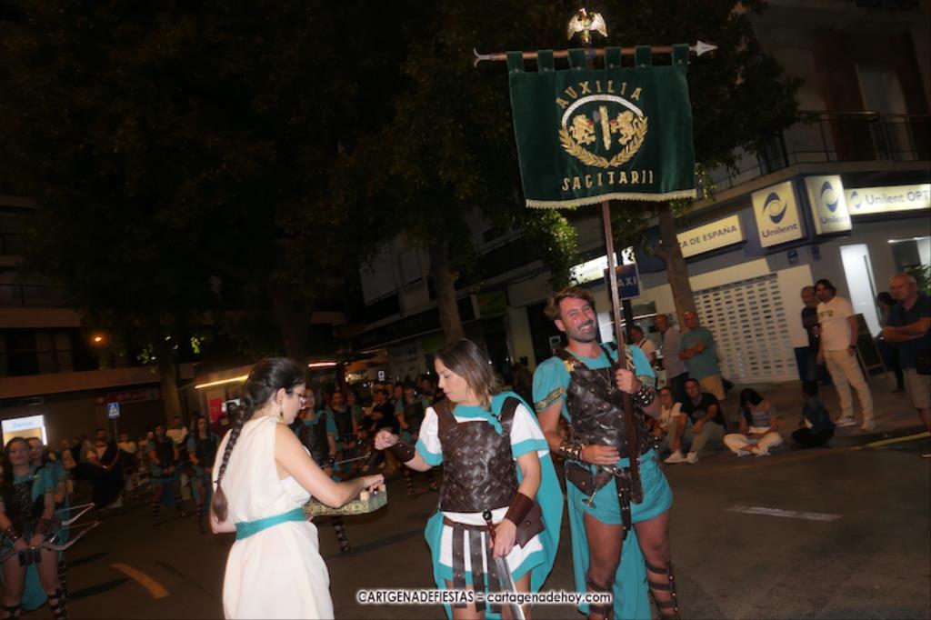 Unas cuatro mil personas (quizás más, pues hay 6.800 festeros) han desfilado por la ciudad con una gran variedad de vestuarios (todos con base histórica) y una amplia representación de personajes históricos y de dioses, unos en carne y hueso y otros a través de figuras que eran llevadas en movimiento. Durante unas tres horas, una infinidad de espectadores han disfrutado de paso de las tropas y legiones de Carthagineses y Romanos, que iban en turnos mezclados y aderezados por algunos grupos de animación. El destino ha sido el campamento.