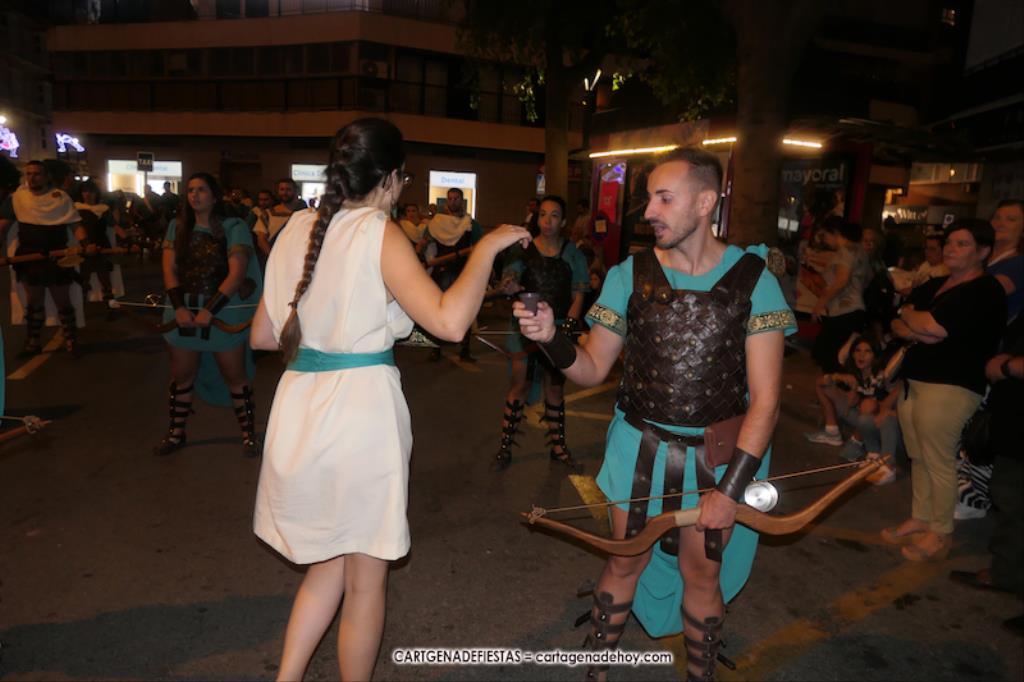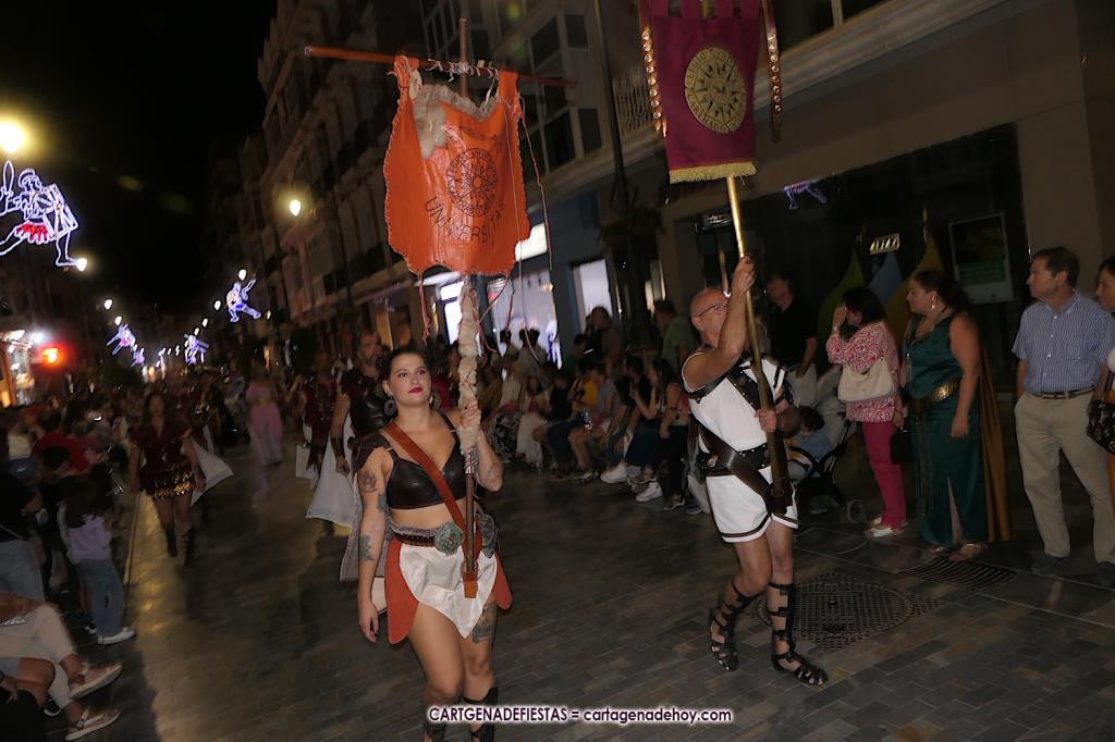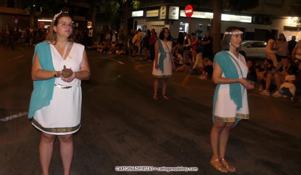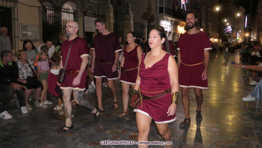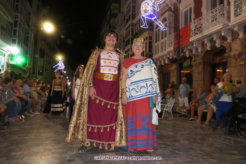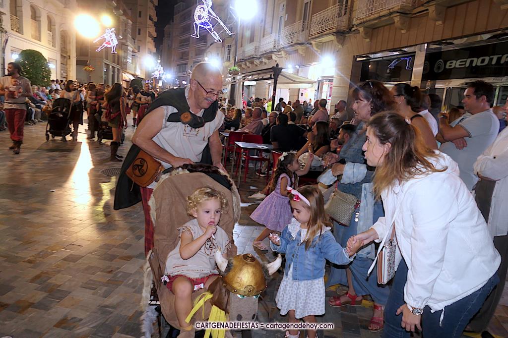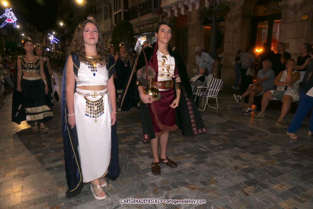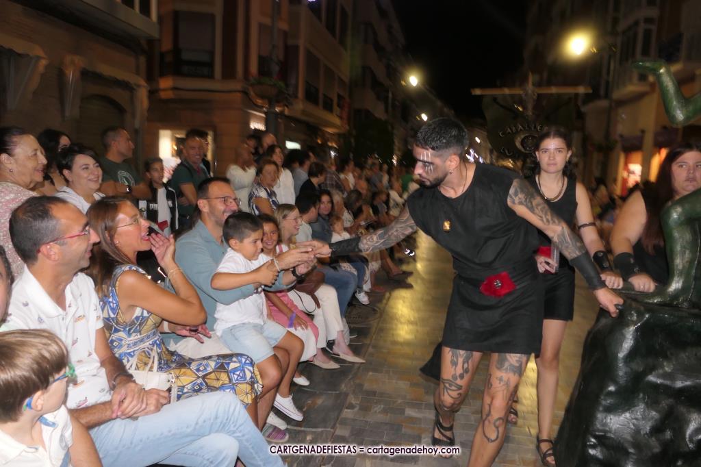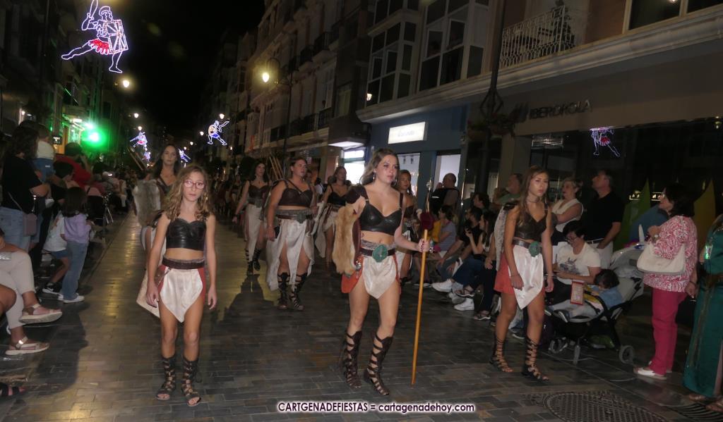 Unas cuatro mil personas (quizás más, pues hay 6.800 festeros) han desfilado por la ciudad con una gran variedad de vestuarios (todos con base histórica) y una amplia representación de personajes históricos y de dioses, unos en carne y hueso y otros a través de figuras que eran llevadas en movimiento. Durante unas tres horas, una infinidad de espectadores han disfrutado de paso de las tropas y legiones de Carthagineses y Romanos, que iban en turnos mezclados y aderezados por algunos grupos de animación. El destino ha sido el campamento.