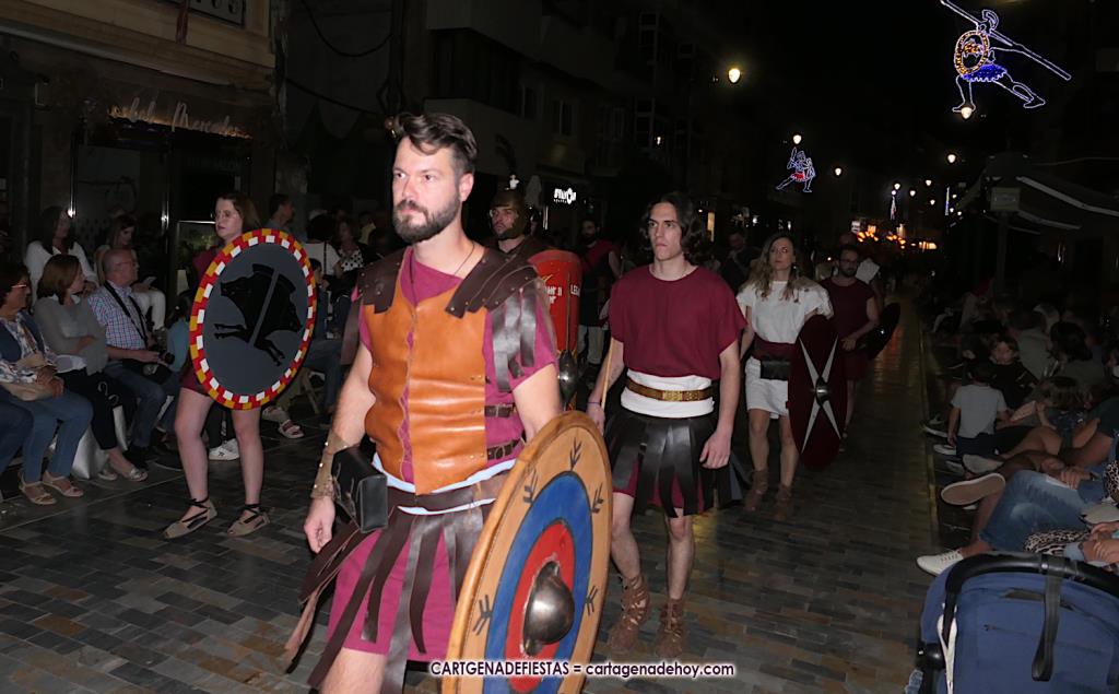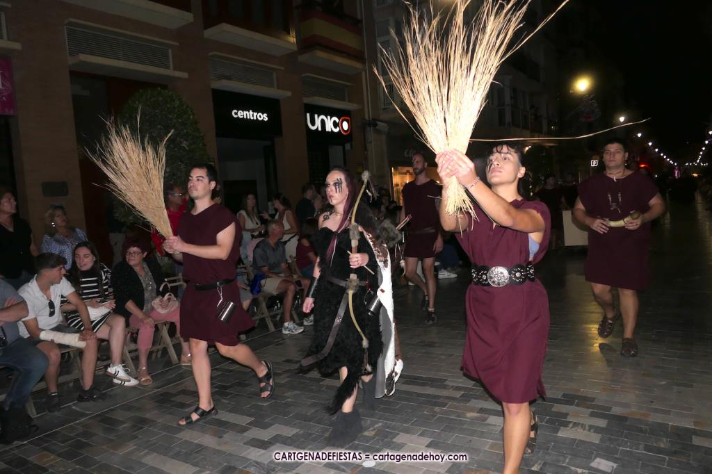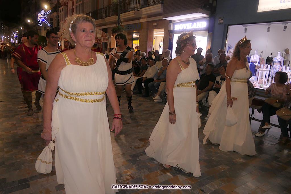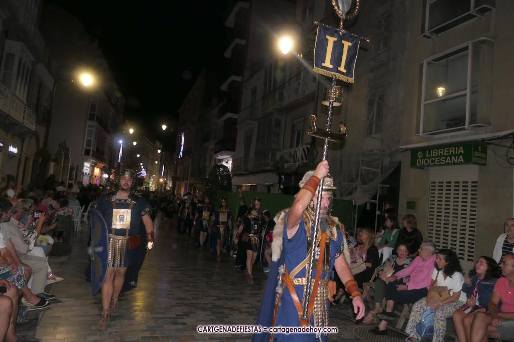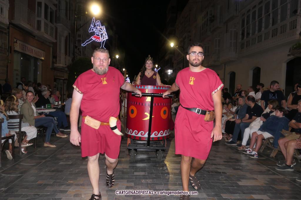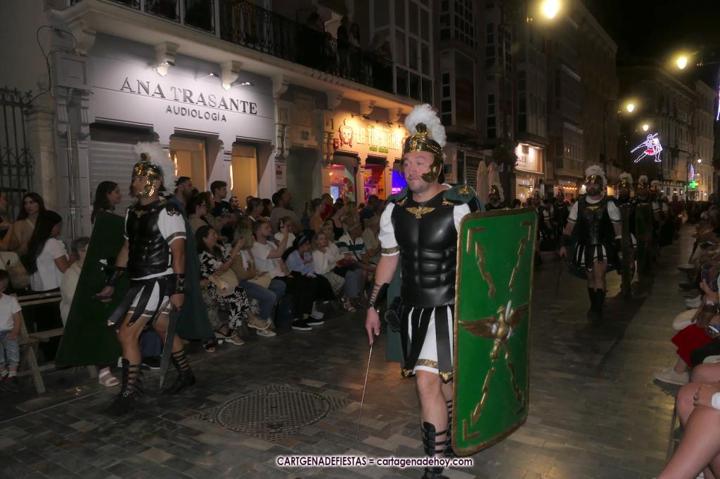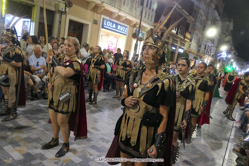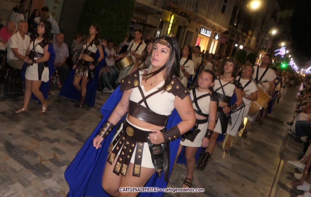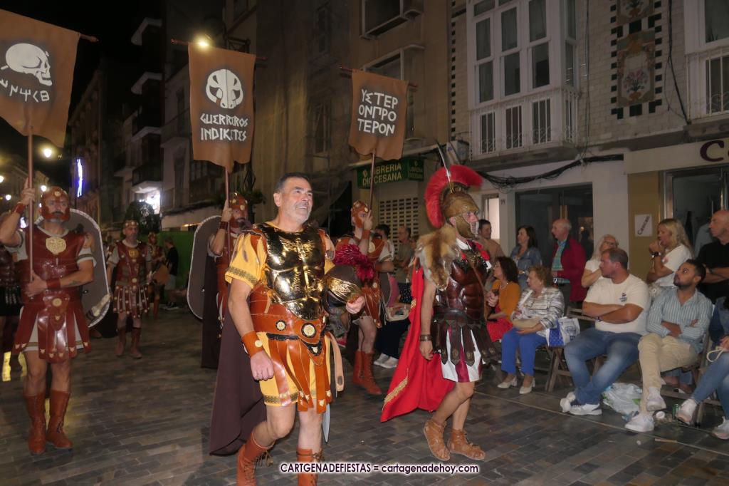 Unas cuatro mil personas (quizás más, pues hay 6.800 festeros) han desfilado por la ciudad con una gran variedad de vestuarios (todos con base histórica) y una amplia representación de personajes históricos y de dioses, unos en carne y hueso y otros a través de figuras que eran llevadas en movimiento. Durante unas tres horas, una infinidad de espectadores han disfrutado de paso de las tropas y legiones de Carthagineses y Romanos, que iban en turnos mezclados y aderezados por algunos grupos de animación. El destino ha sido el campamento.