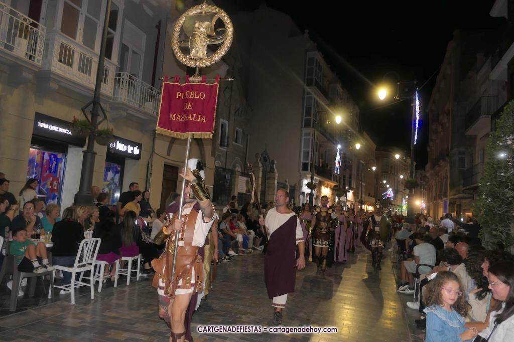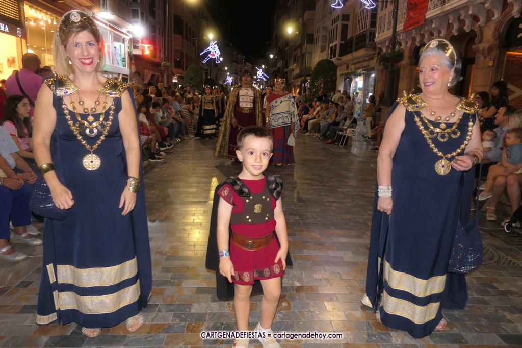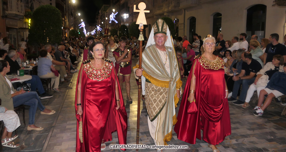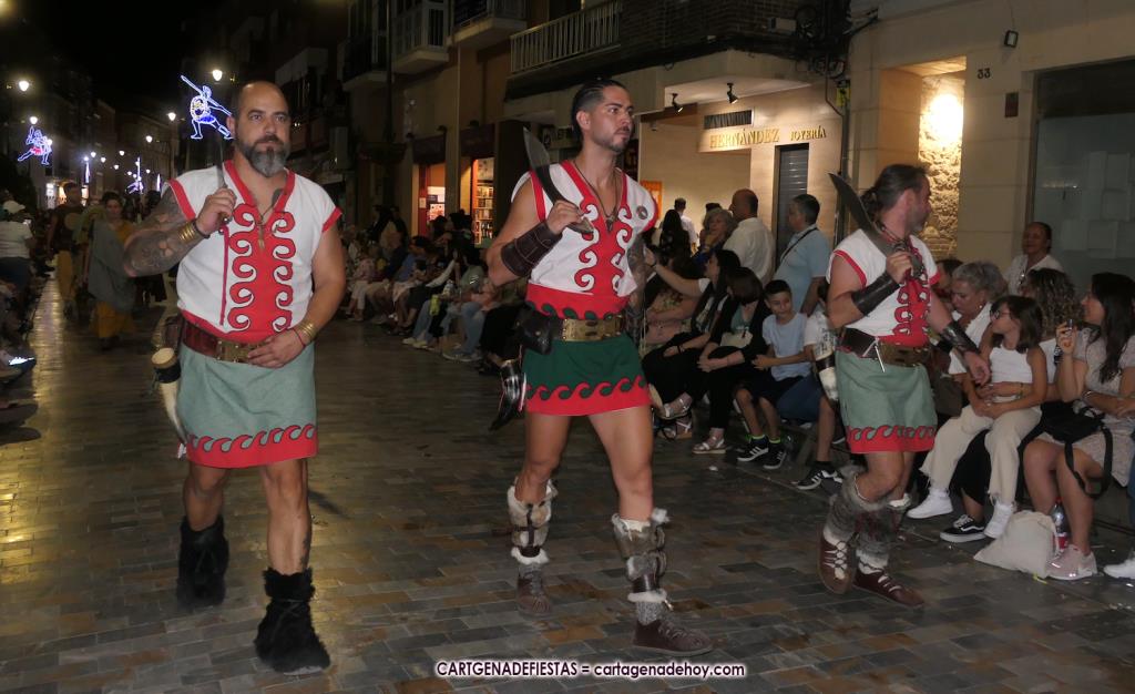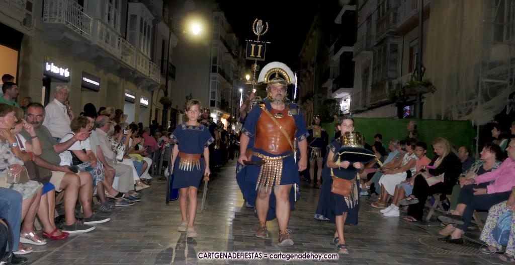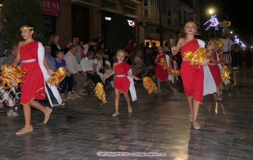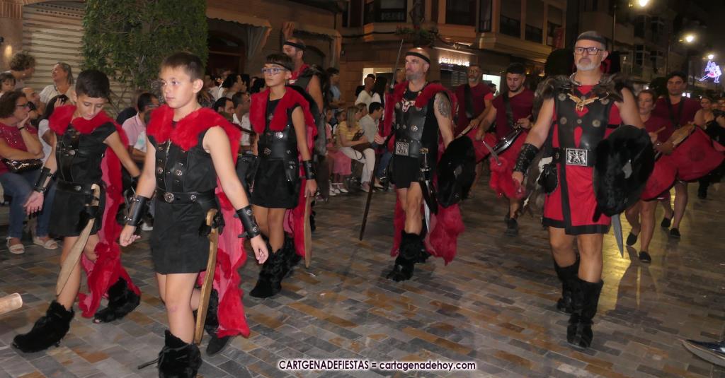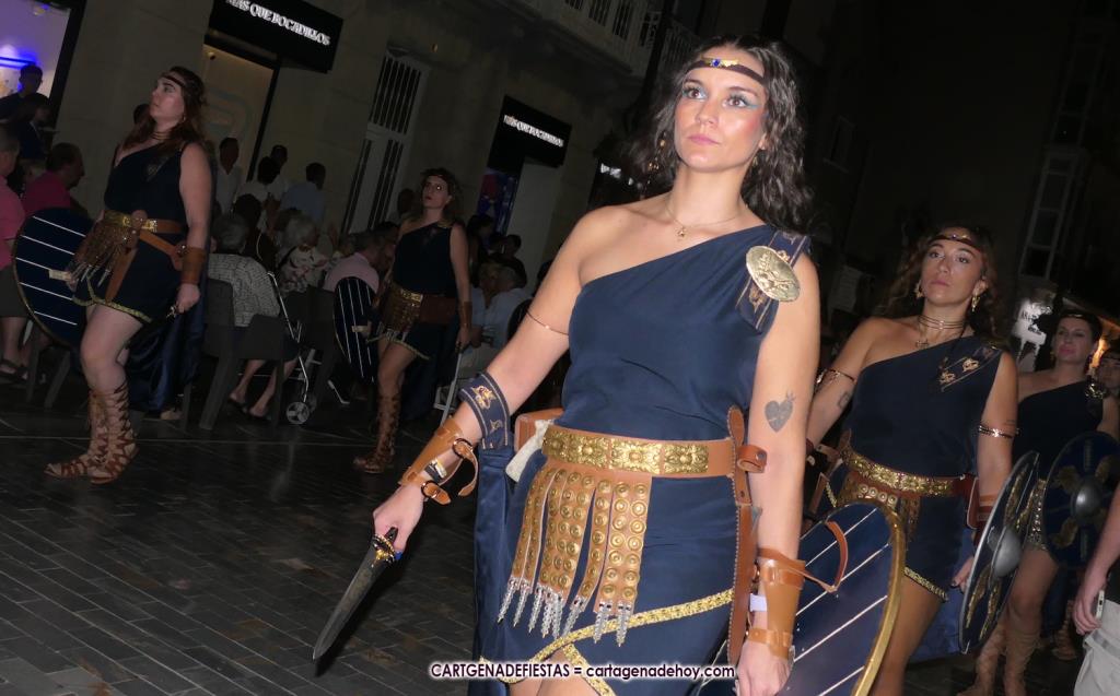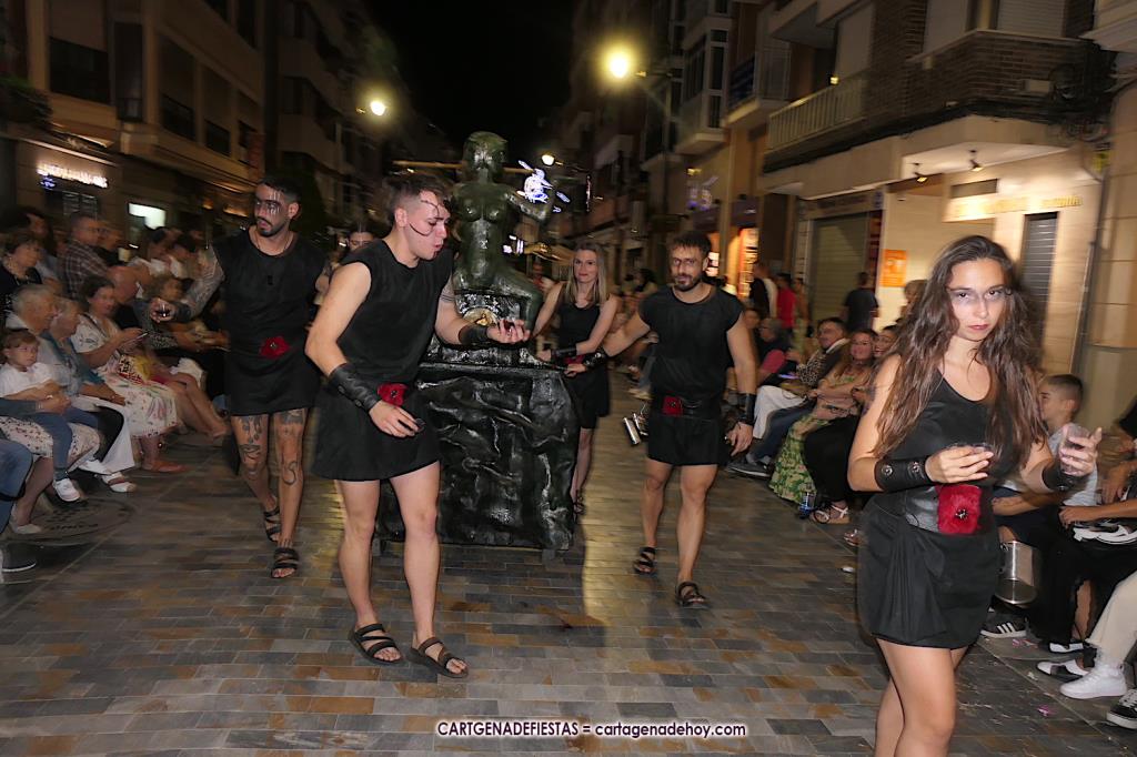 Unas cuatro mil personas (quizás más, pues hay 6.800 festeros) han desfilado por la ciudad con una gran variedad de vestuarios (todos con base histórica) y una amplia representación de personajes históricos y de dioses, unos en carne y hueso y otros a través de figuras que eran llevadas en movimiento. Durante unas tres horas, una infinidad de espectadores han disfrutado de paso de las tropas y legiones de Carthagineses y Romanos, que iban en turnos mezclados y aderezados por algunos grupos de animación. El destino ha sido el campamento.