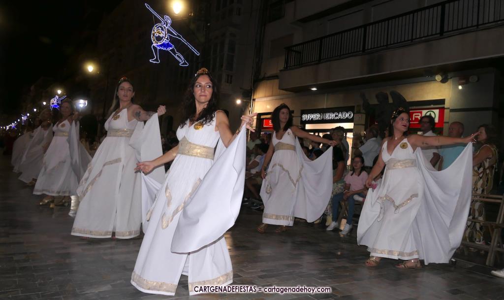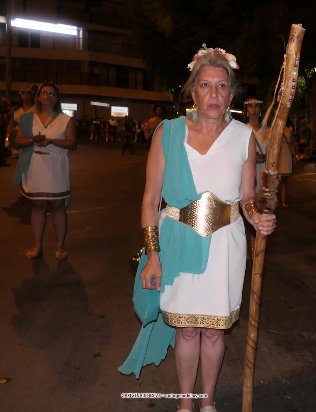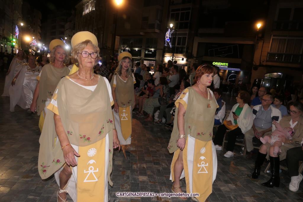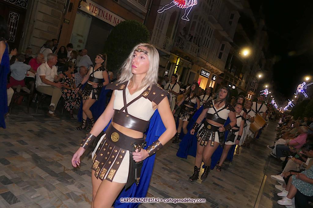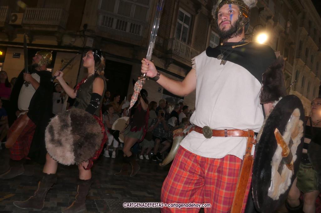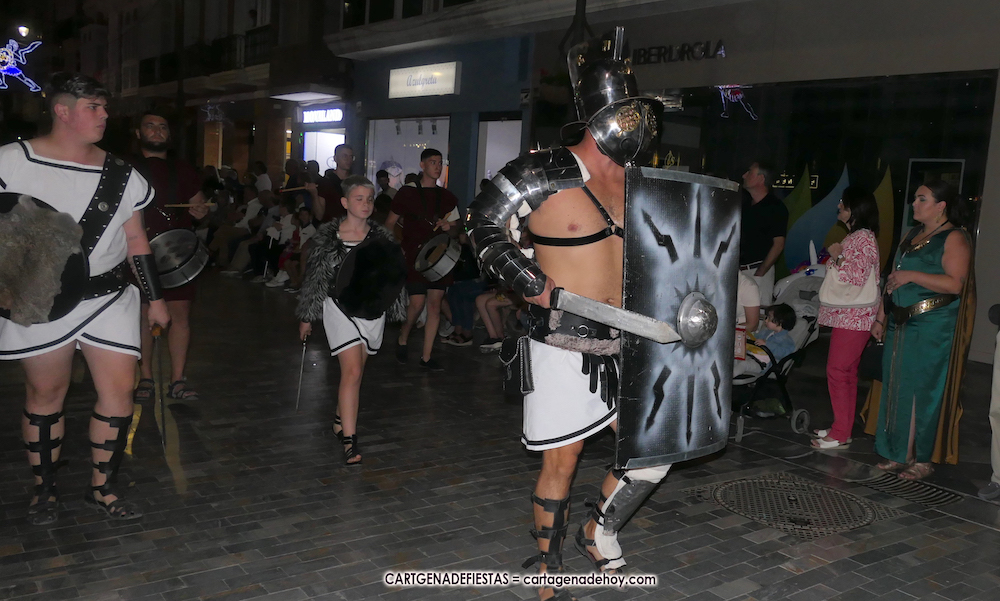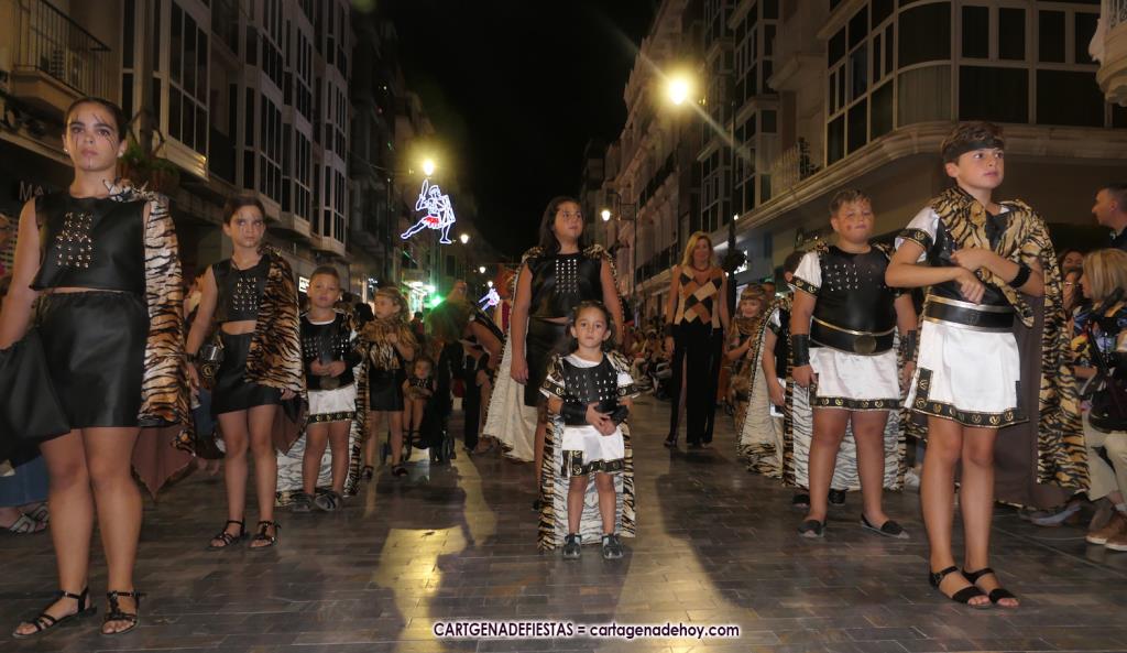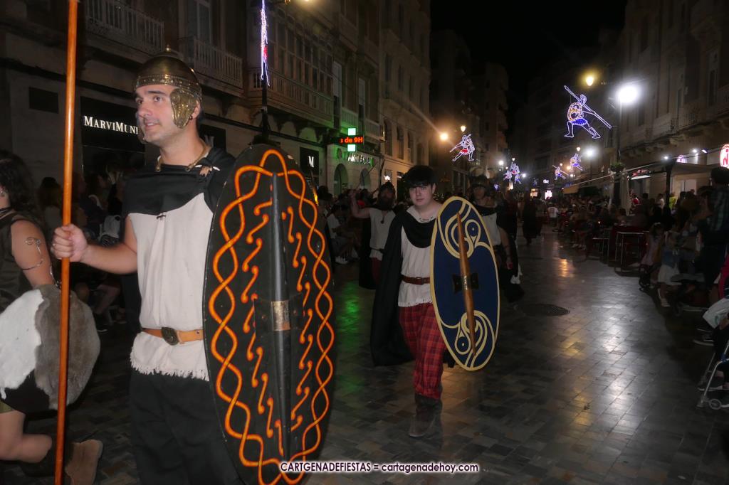 Unas cuatro mil personas (quizás más, pues hay 6.800 festeros) han desfilado por la ciudad con una gran variedad de vestuarios (todos con base histórica) y una amplia representación de personajes históricos y de dioses, unos en carne y hueso y otros a través de figuras que eran llevadas en movimiento. Durante unas tres horas, una infinidad de espectadores han disfrutado de paso de las tropas y legiones de Carthagineses y Romanos, que iban en turnos mezclados y aderezados por algunos grupos de animación. El destino ha sido el campamento.