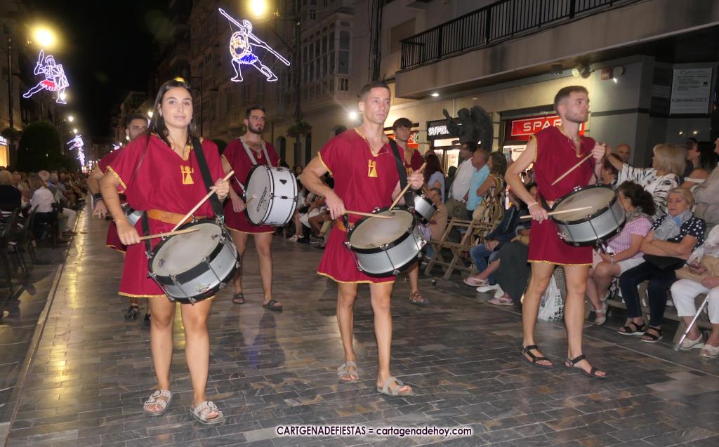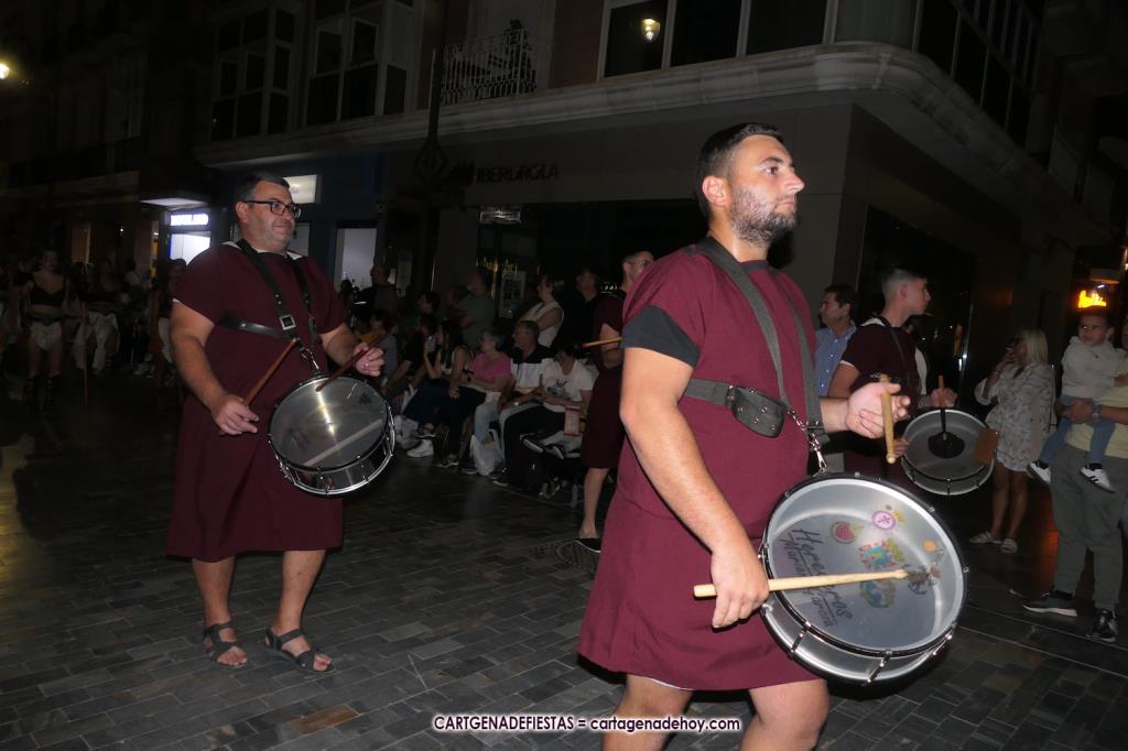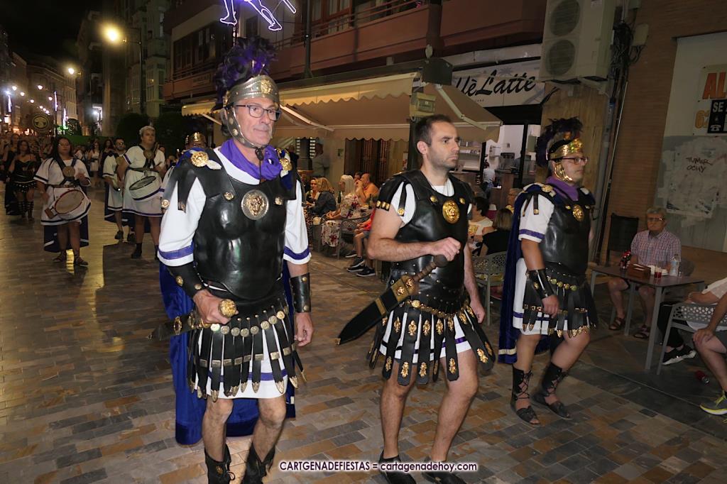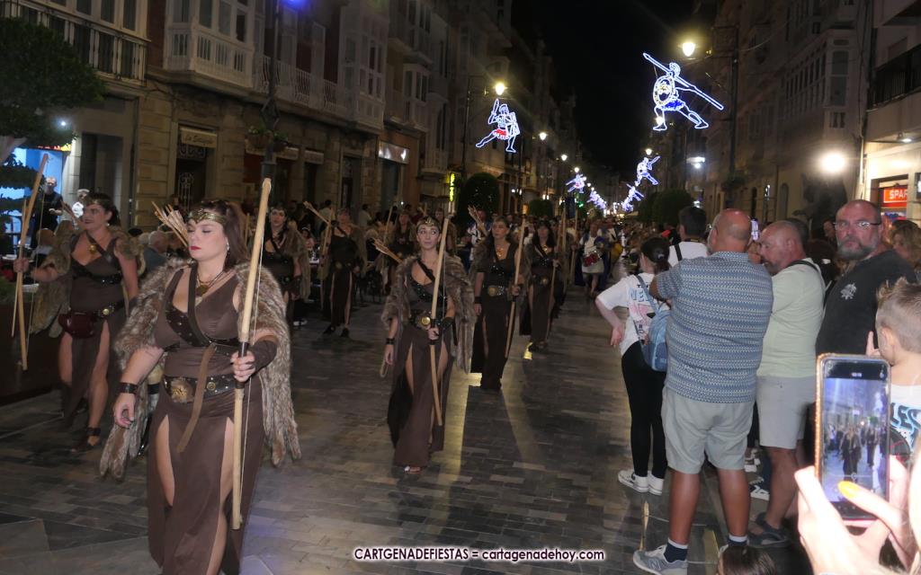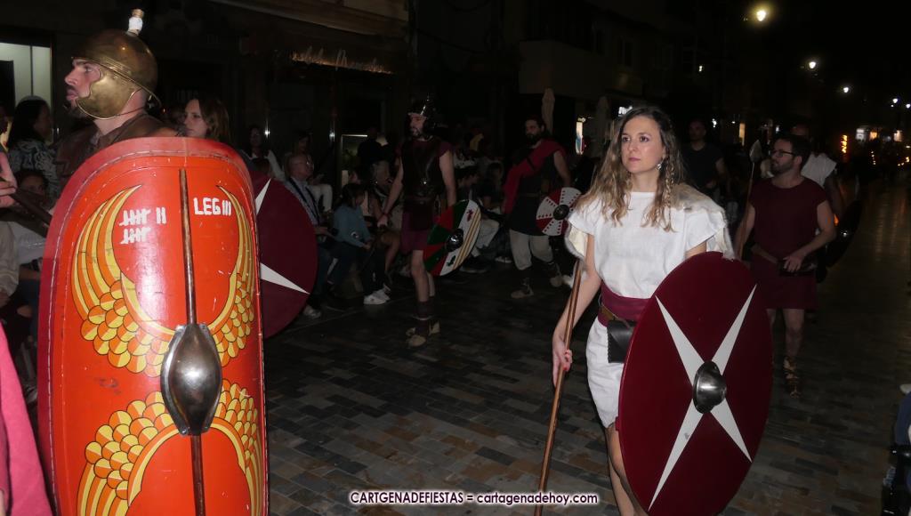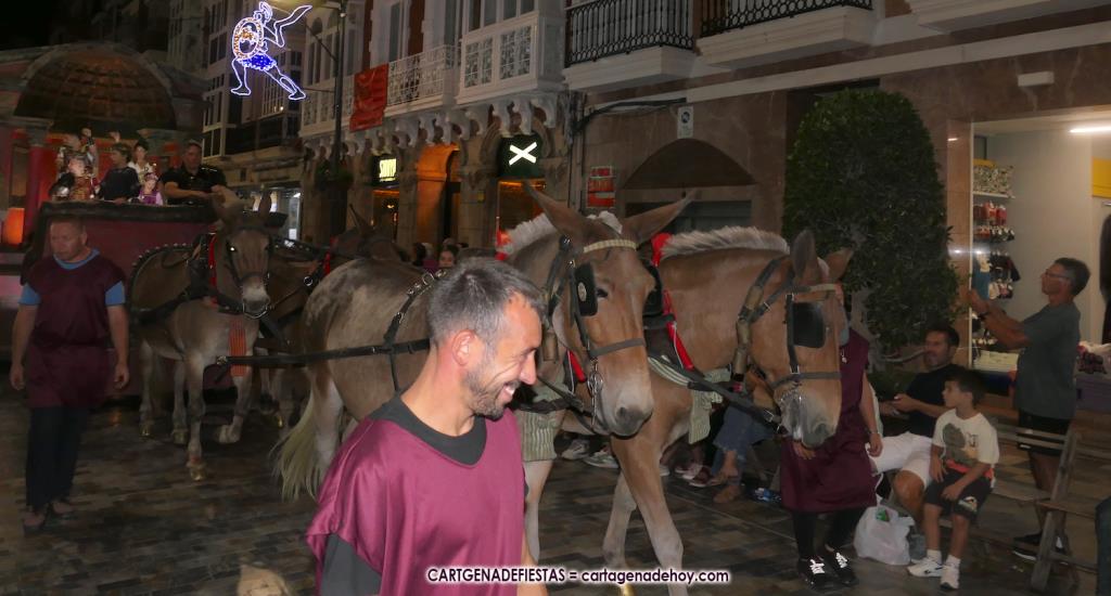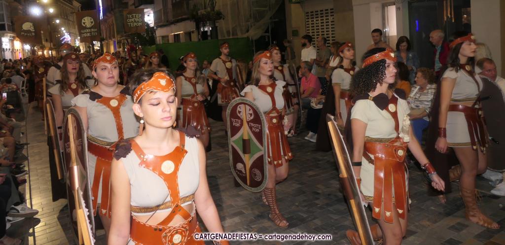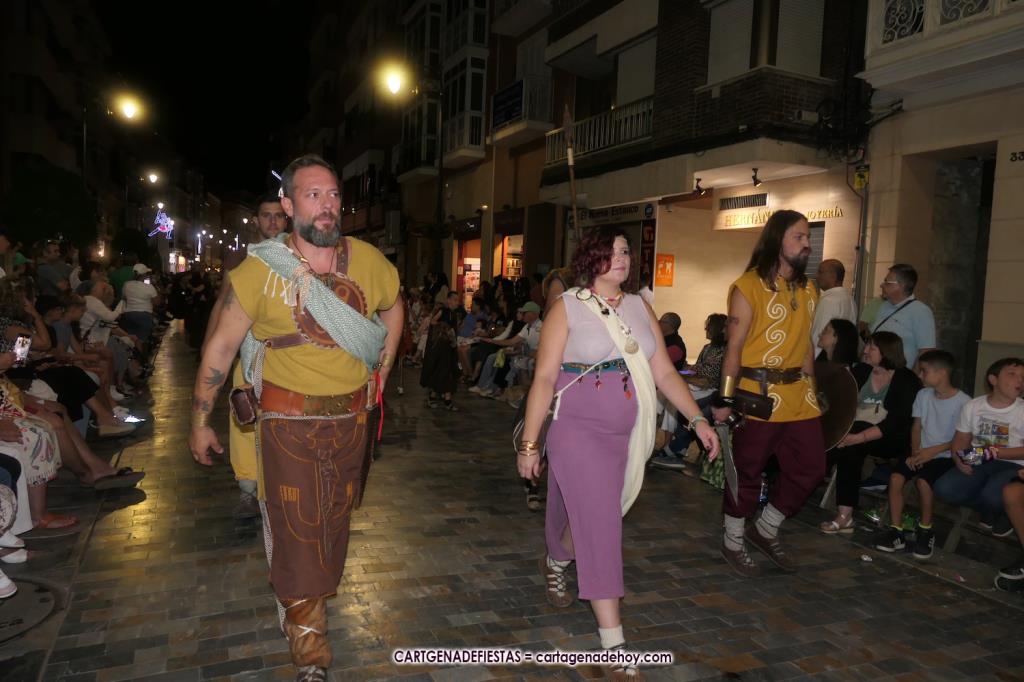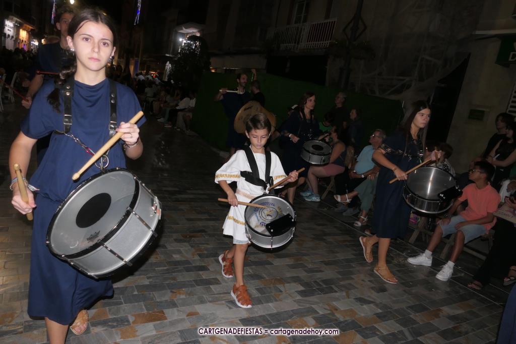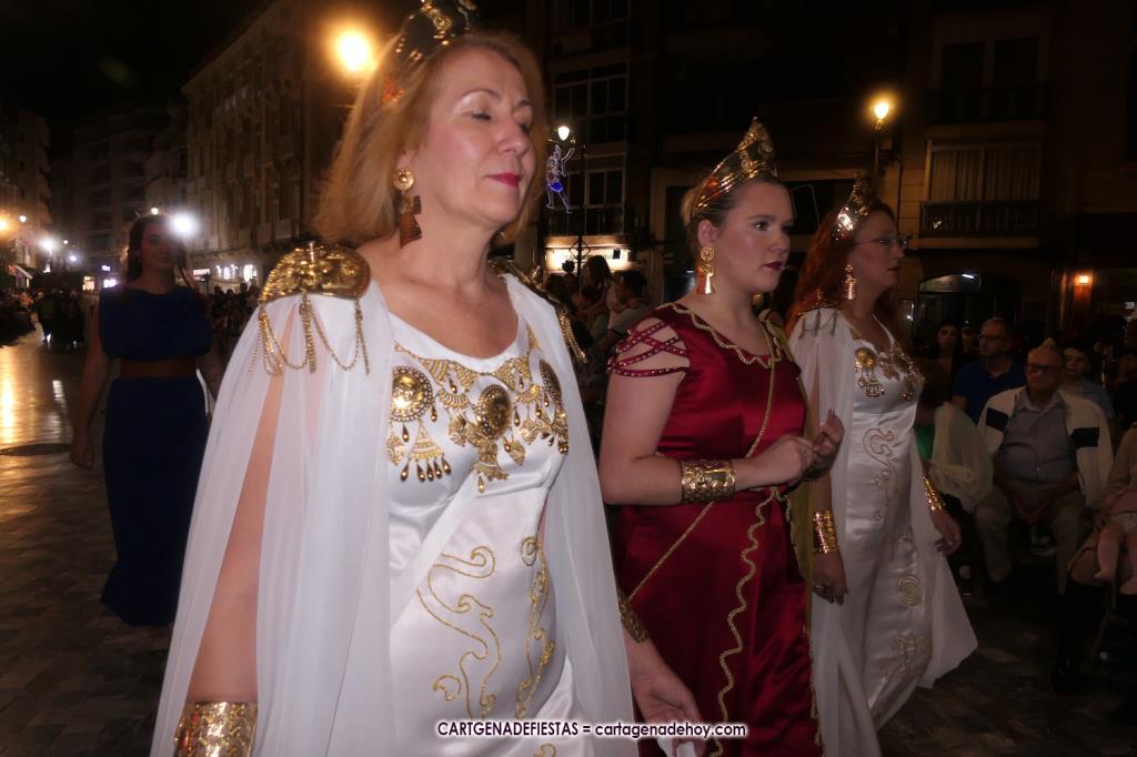 Unas cuatro mil personas (quizás más, pues hay 6.800 festeros) han desfilado por la ciudad con una gran variedad de vestuarios (todos con base histórica) y una amplia representación de personajes históricos y de dioses, unos en carne y hueso y otros a través de figuras que eran llevadas en movimiento. Durante unas tres horas, una infinidad de espectadores han disfrutado de paso de las tropas y legiones de Carthagineses y Romanos, que iban en turnos mezclados y aderezados por algunos grupos de animación. El destino ha sido el campamento.
