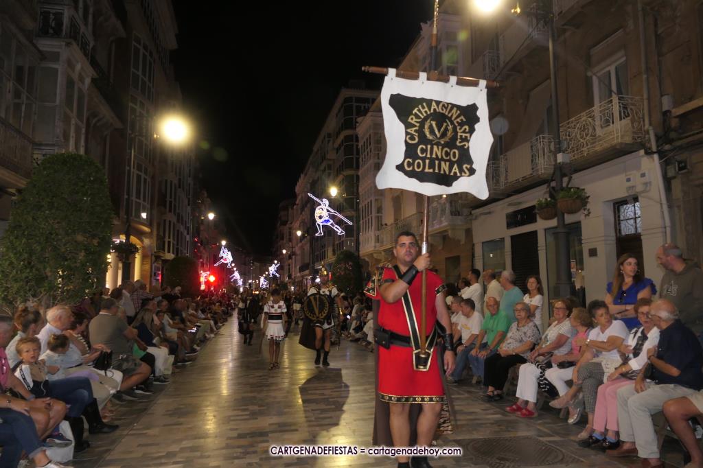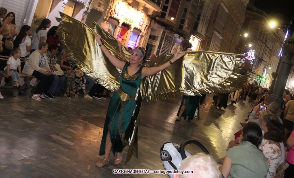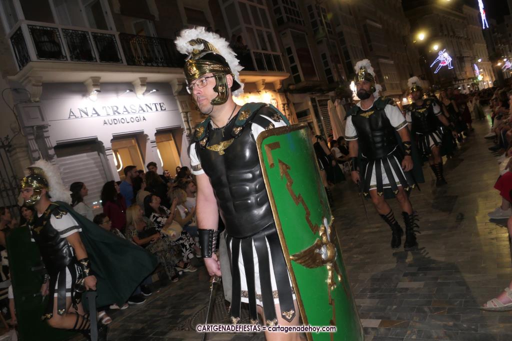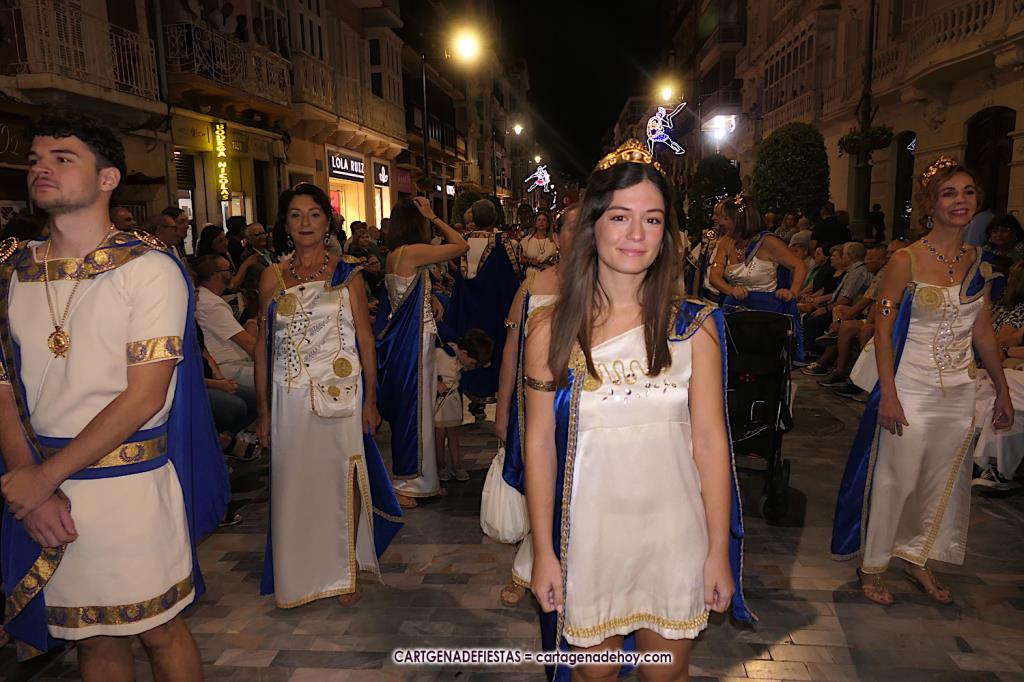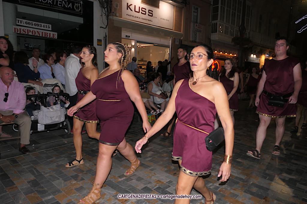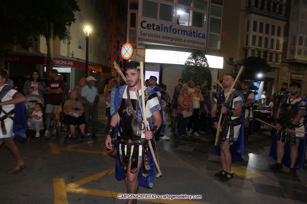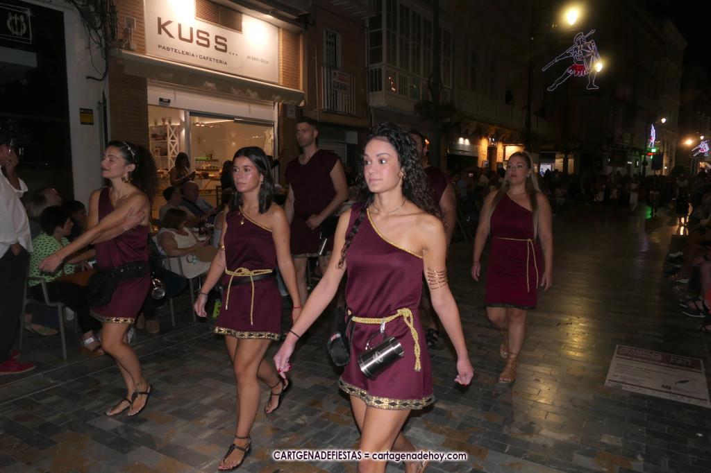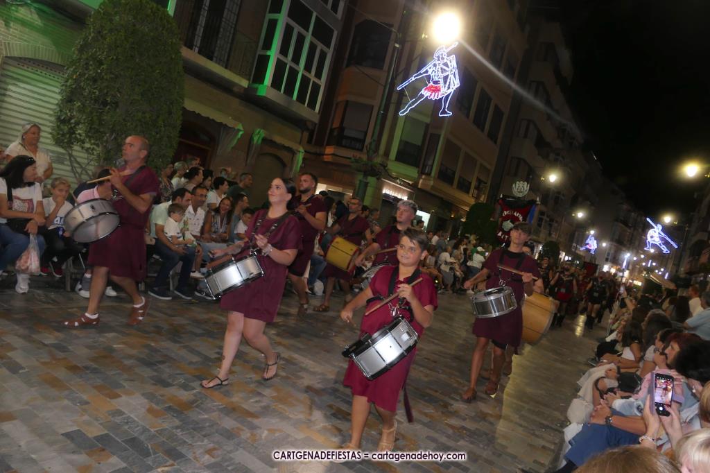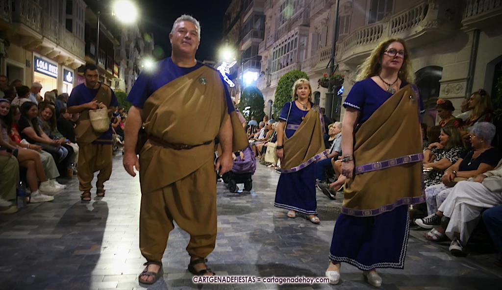 Unas cuatro mil personas (quizás más, pues hay 6.800 festeros) han desfilado por la ciudad con una gran variedad de vestuarios (todos con base histórica) y una amplia representación de personajes históricos y de dioses, unos en carne y hueso y otros a través de figuras que eran llevadas en movimiento. Durante unas tres horas, una infinidad de espectadores han disfrutado de paso de las tropas y legiones de Carthagineses y Romanos, que iban en turnos mezclados y aderezados por algunos grupos de animación. El destino ha sido el campamento.
