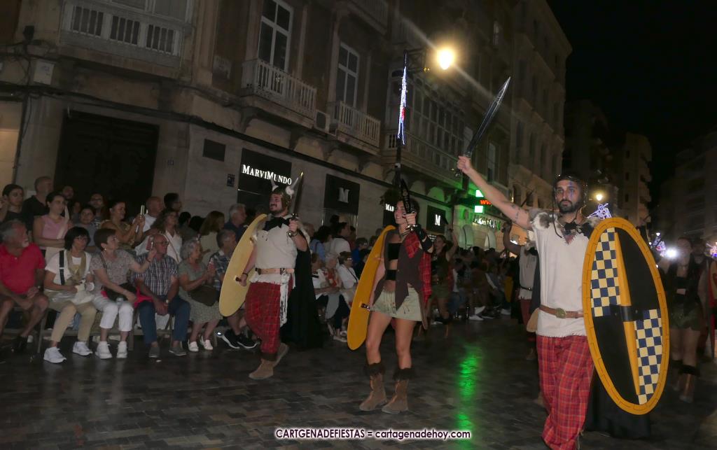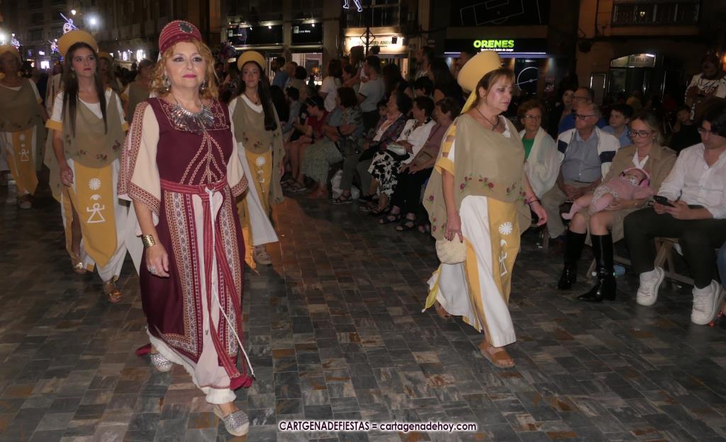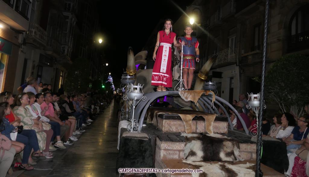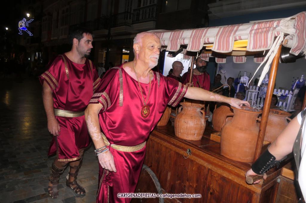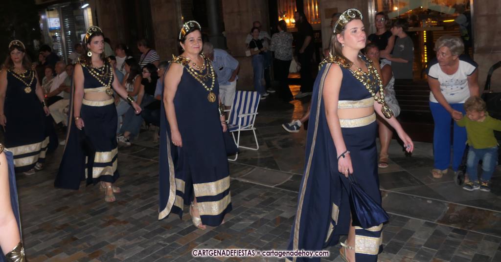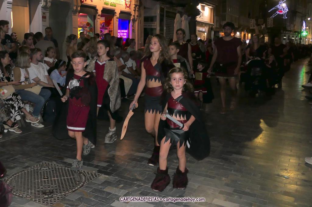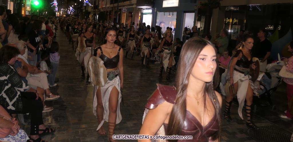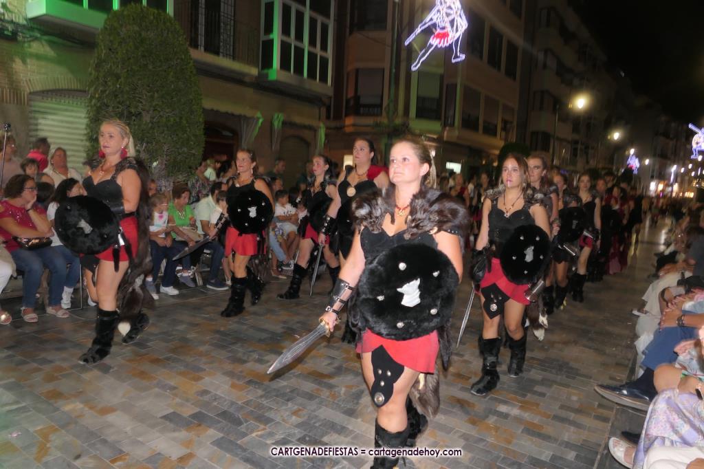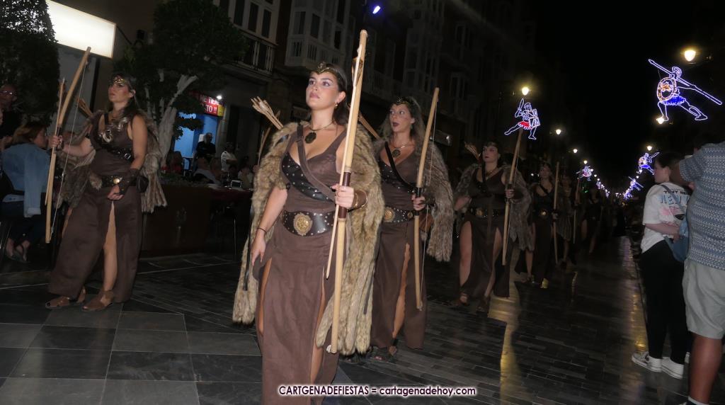 Unas cuatro mil personas (quizás más, pues hay 6.800 festeros) han desfilado por la ciudad con una gran variedad de vestuarios (todos con base histórica) y una amplia representación de personajes históricos y de dioses, unos en carne y hueso y otros a través de figuras que eran llevadas en movimiento. Durante unas tres horas, una infinidad de espectadores han disfrutado de paso de las tropas y legiones de Carthagineses y Romanos, que iban en turnos mezclados y aderezados por algunos grupos de animación. El destino ha sido el campamento.