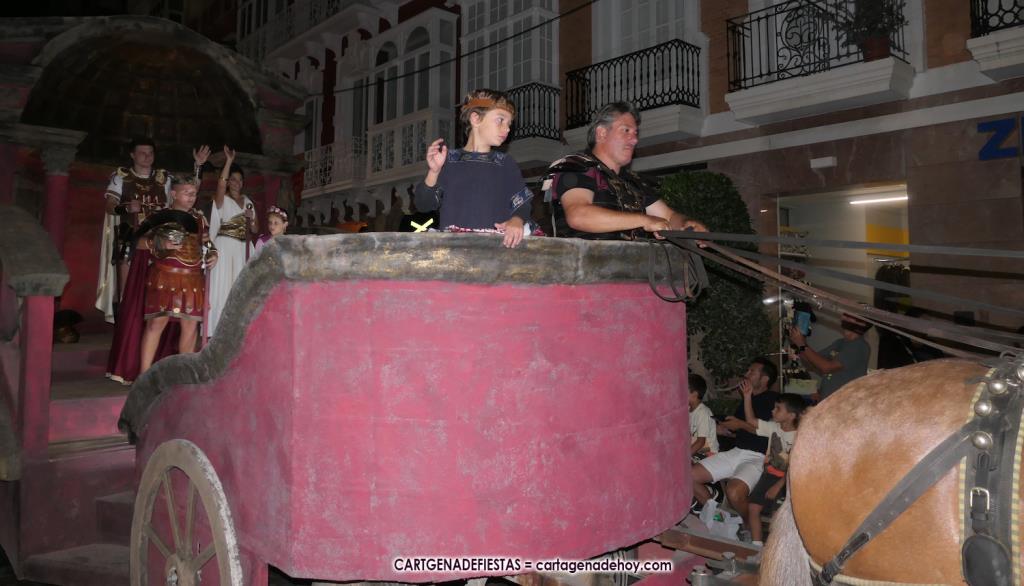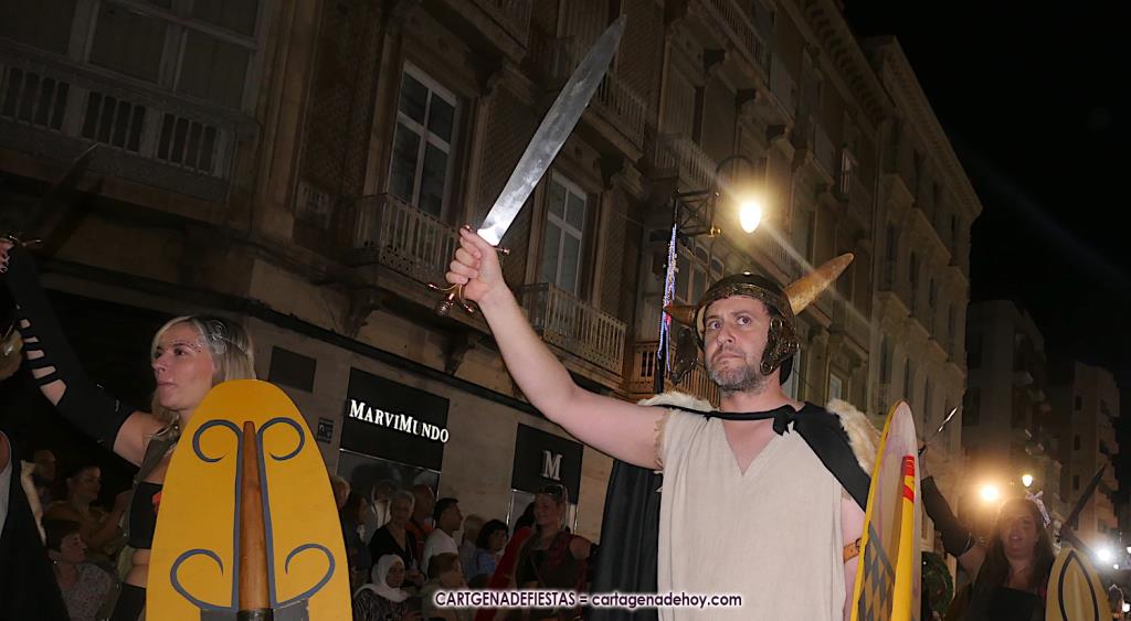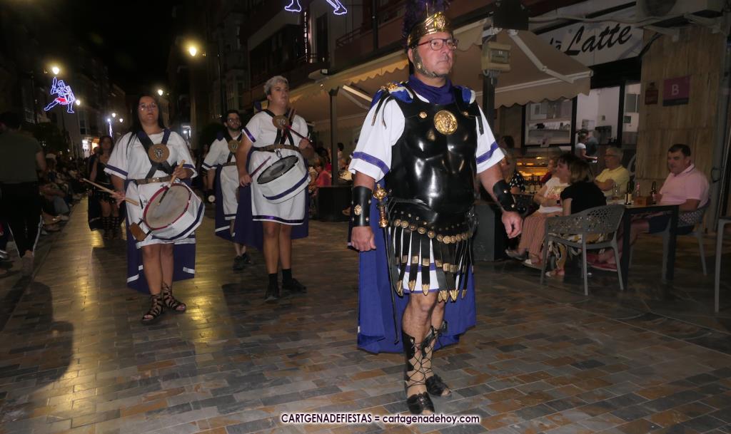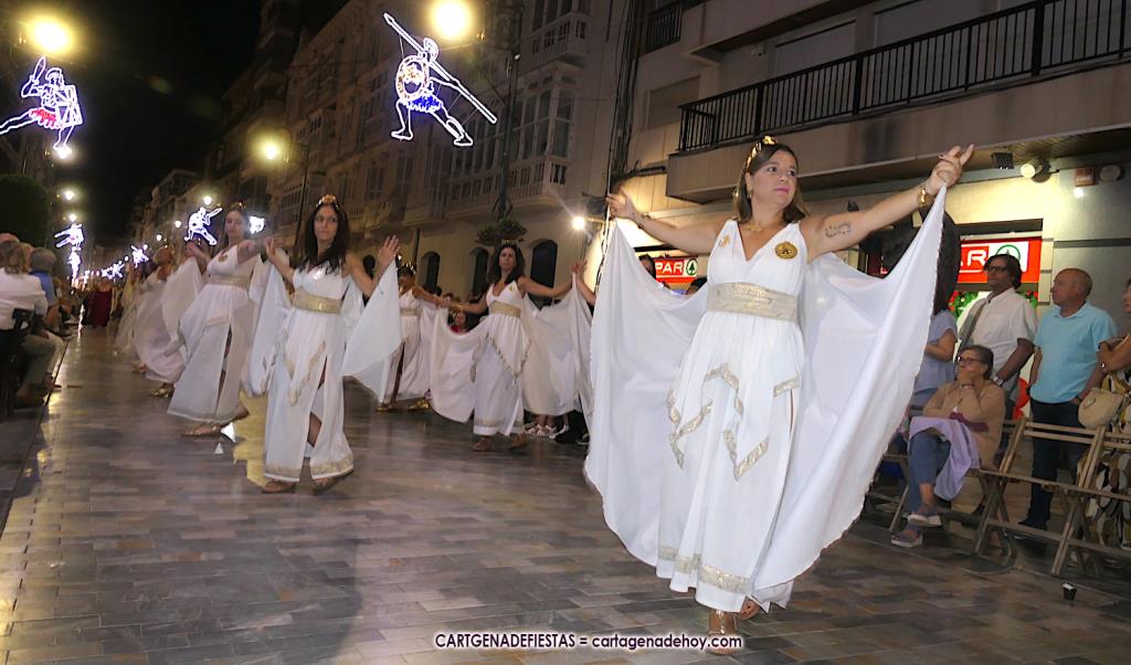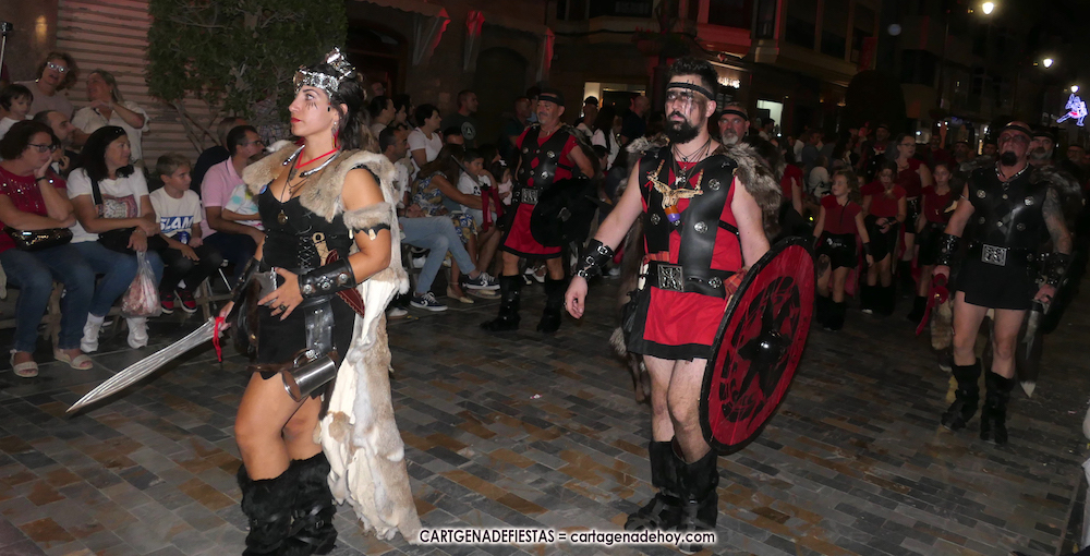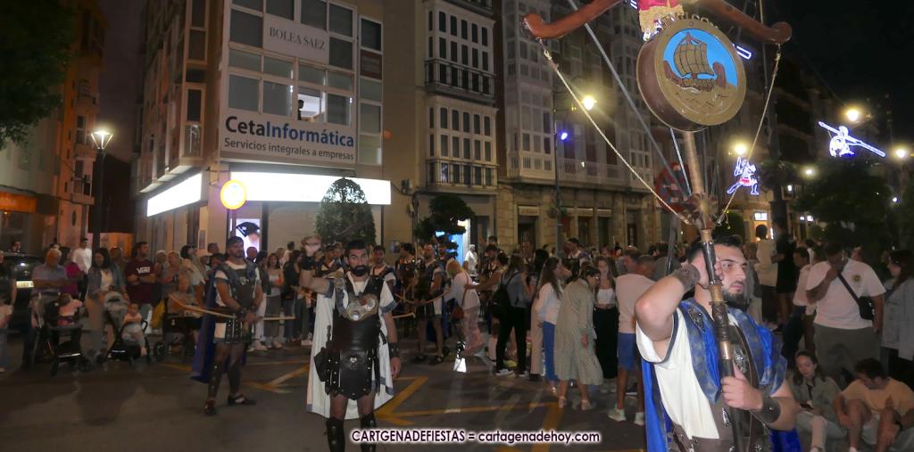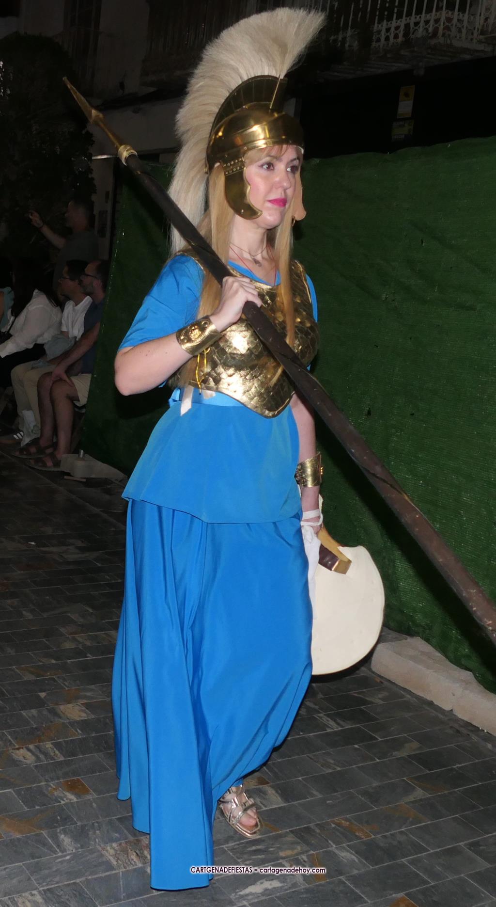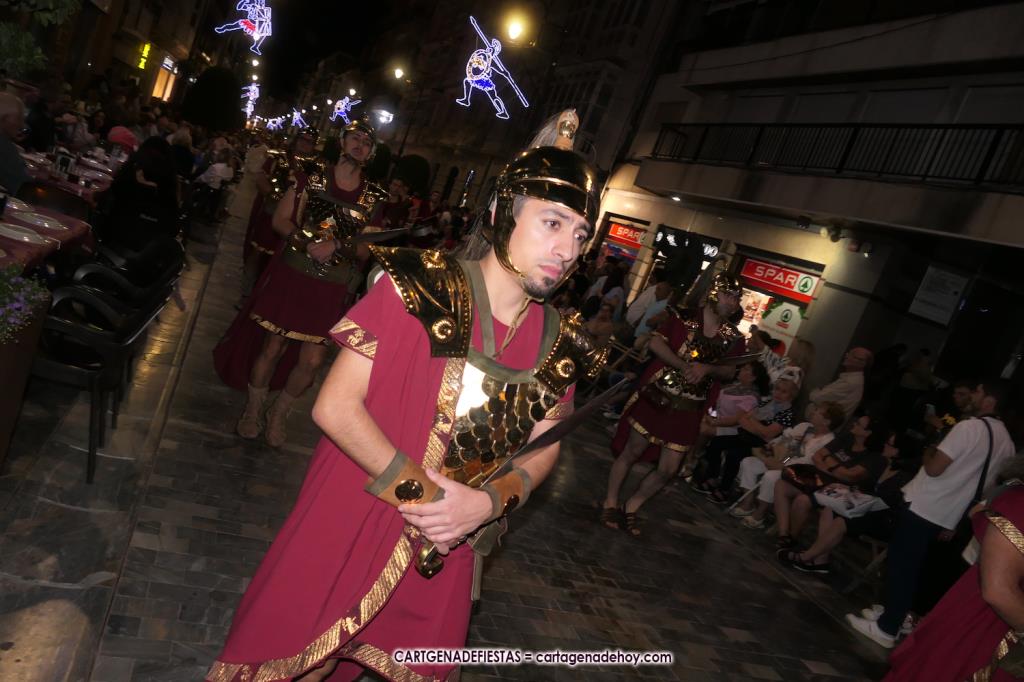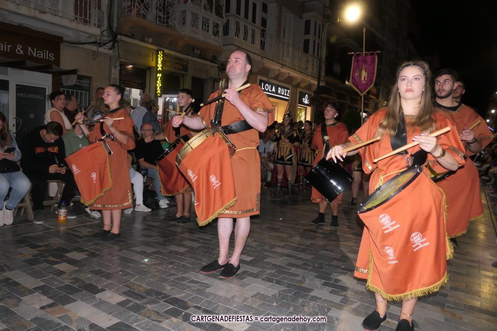 Unas cuatro mil personas (quizás más, pues hay 6.800 festeros) han desfilado por la ciudad con una gran variedad de vestuarios (todos con base histórica) y una amplia representación de personajes históricos y de dioses, unos en carne y hueso y otros a través de figuras que eran llevadas en movimiento. Durante unas tres horas, una infinidad de espectadores han disfrutado de paso de las tropas y legiones de Carthagineses y Romanos, que iban en turnos mezclados y aderezados por algunos grupos de animación. El destino ha sido el campamento.