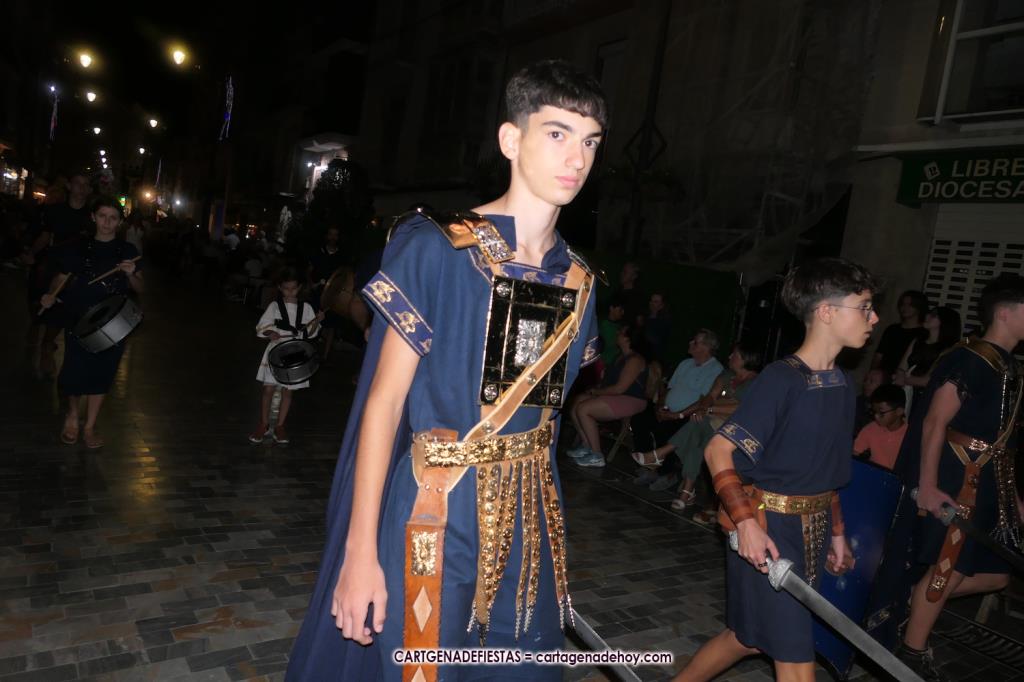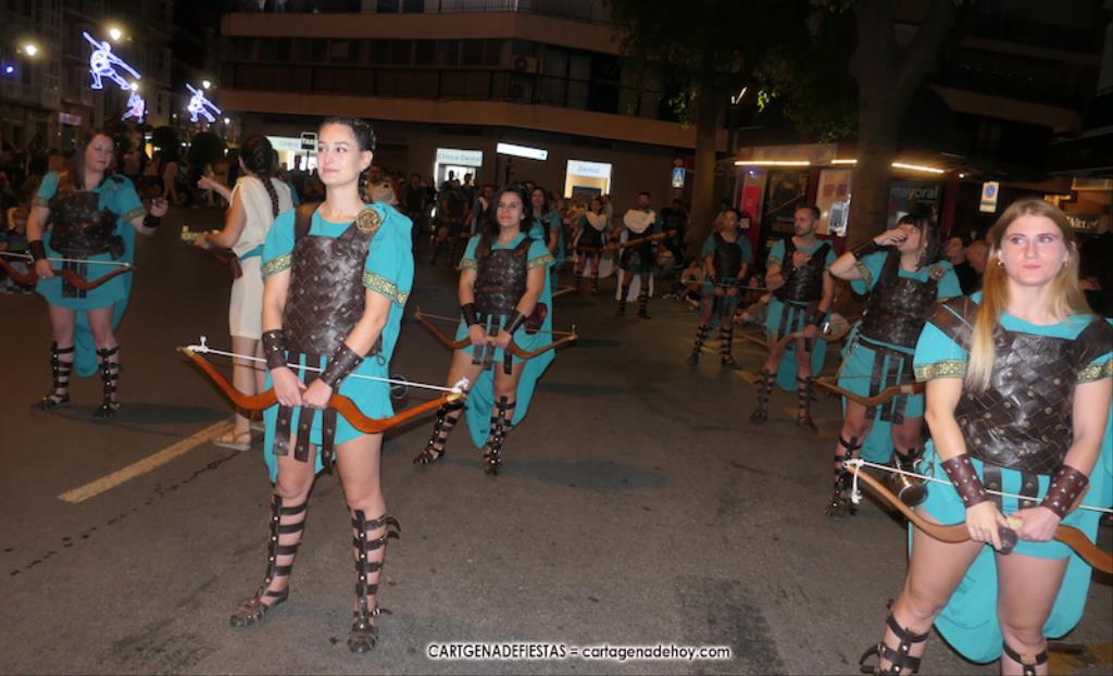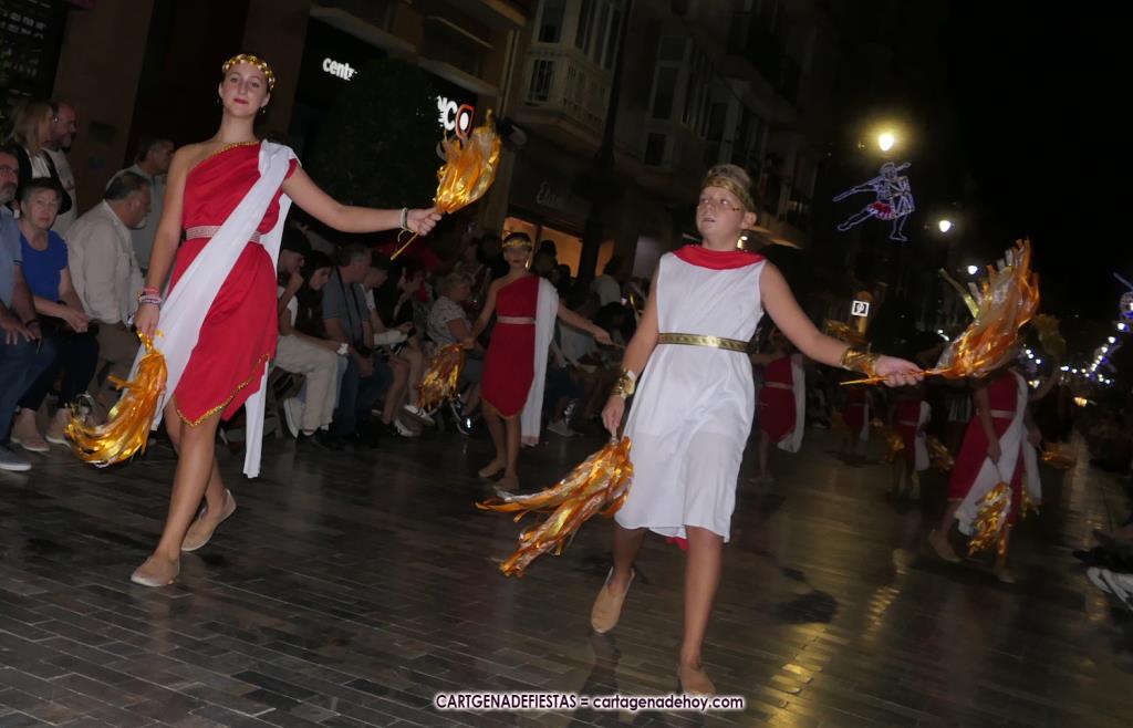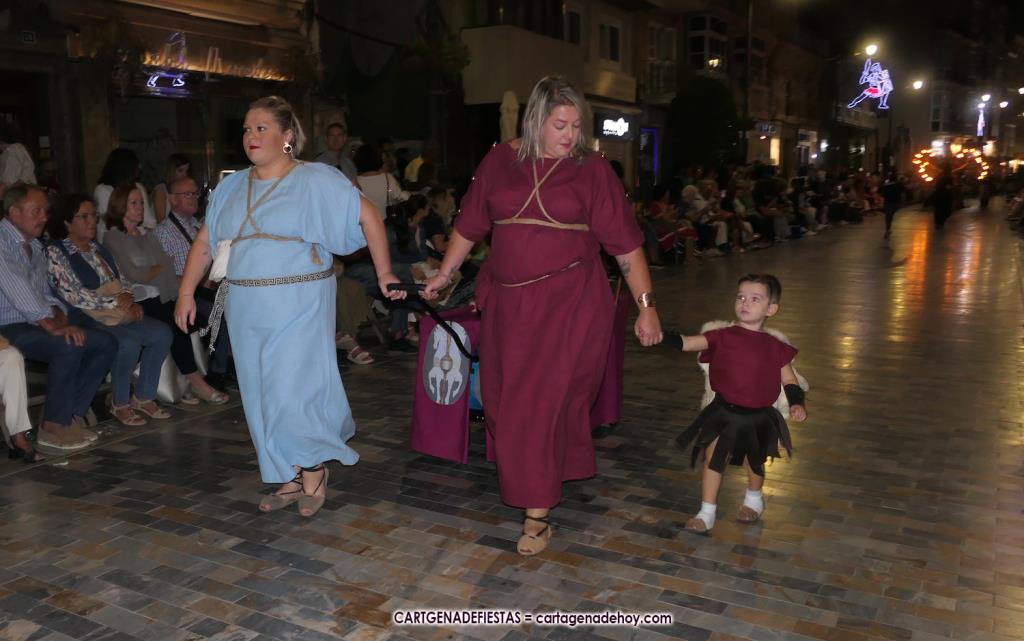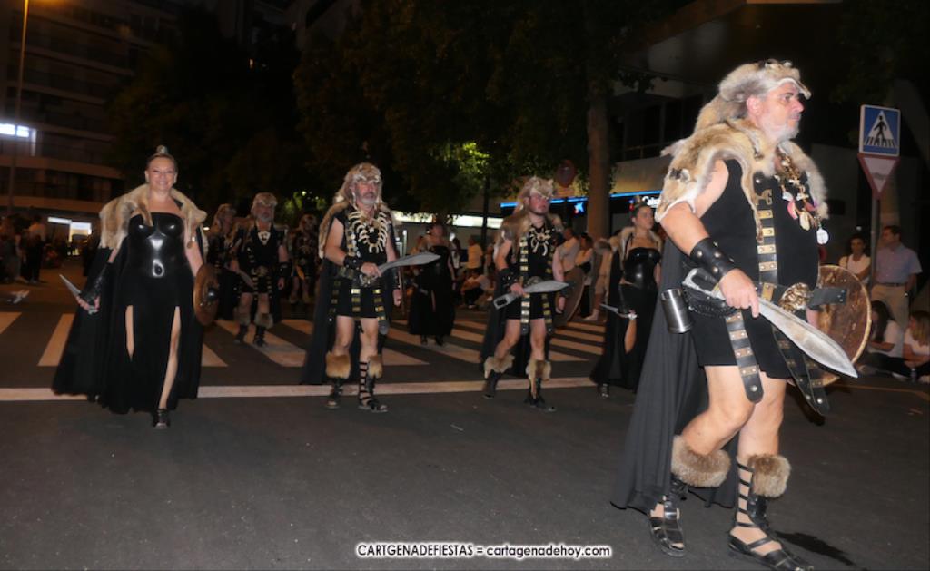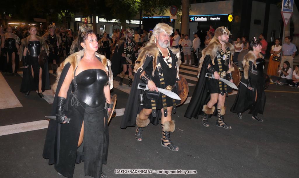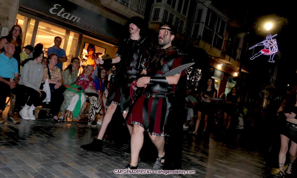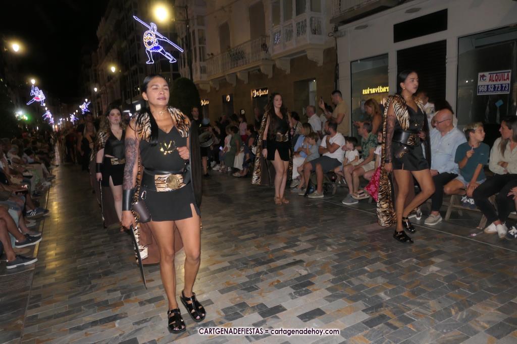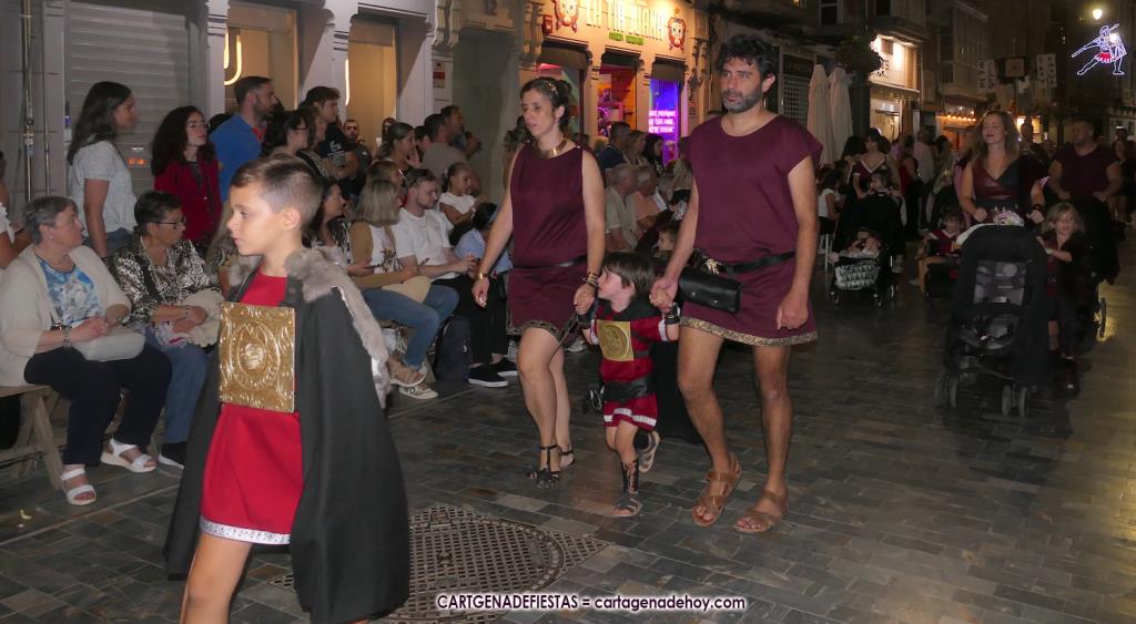Unas cuatro mil personas (quizás más, pues hay 6.800 festeros) han desfilado por la ciudad con una gran variedad de vestuarios (todos con base histórica) y una amplia representación de personajes históricos y de dioses, unos en carne y hueso y otros a través de figuras que eran llevadas en movimiento. Durante unas tres horas, una infinidad de espectadores han disfrutado de paso de las tropas y legiones de Carthagineses y Romanos, que iban en turnos mezclados y aderezados por algunos grupos de animación. El destino ha sido el campamento.