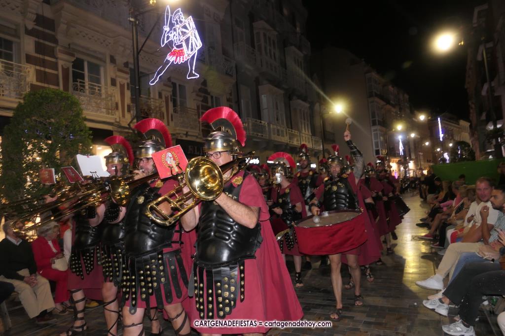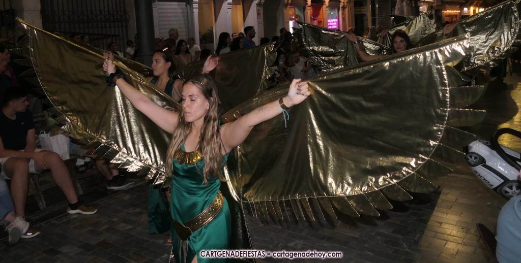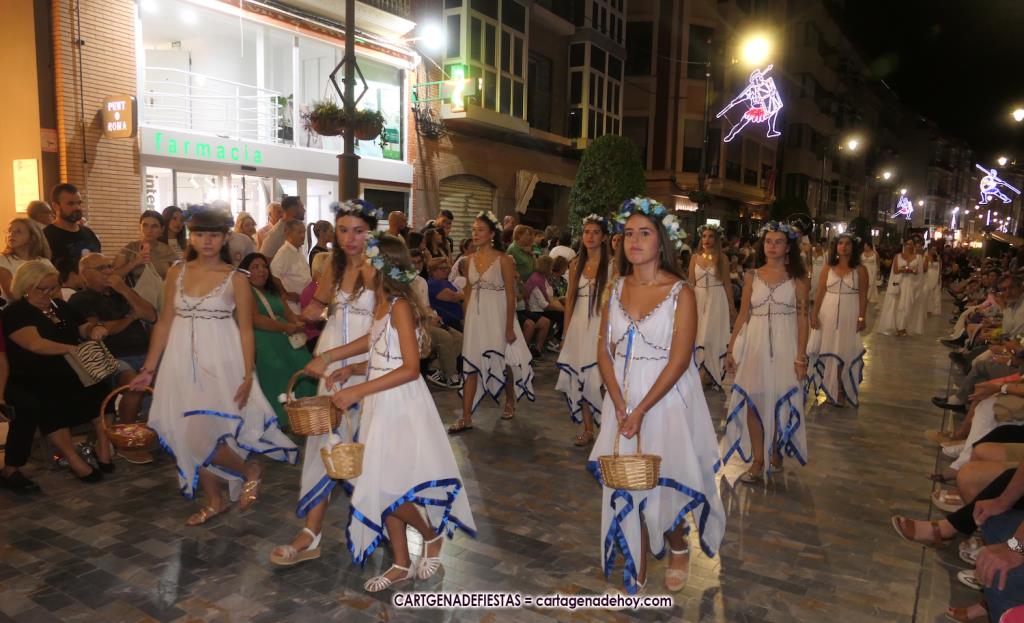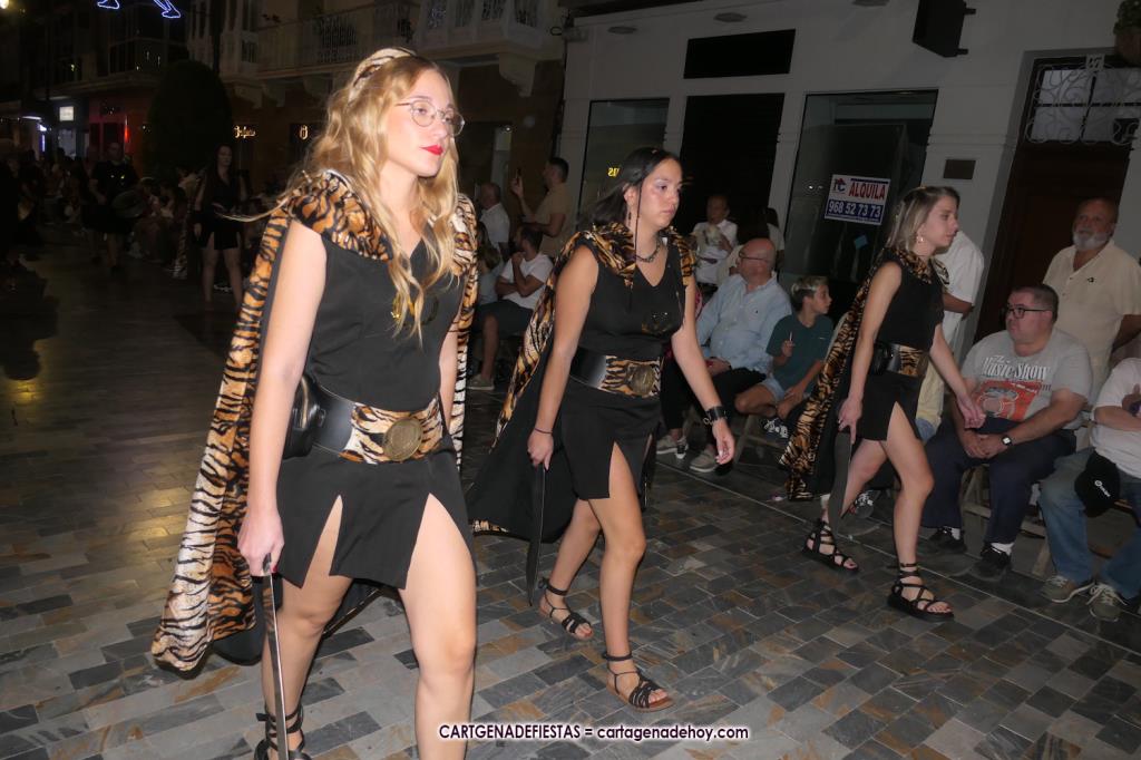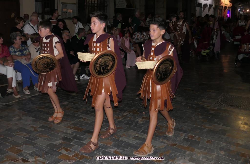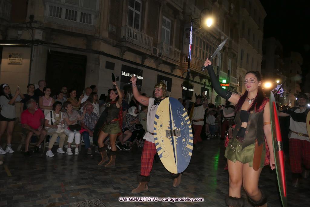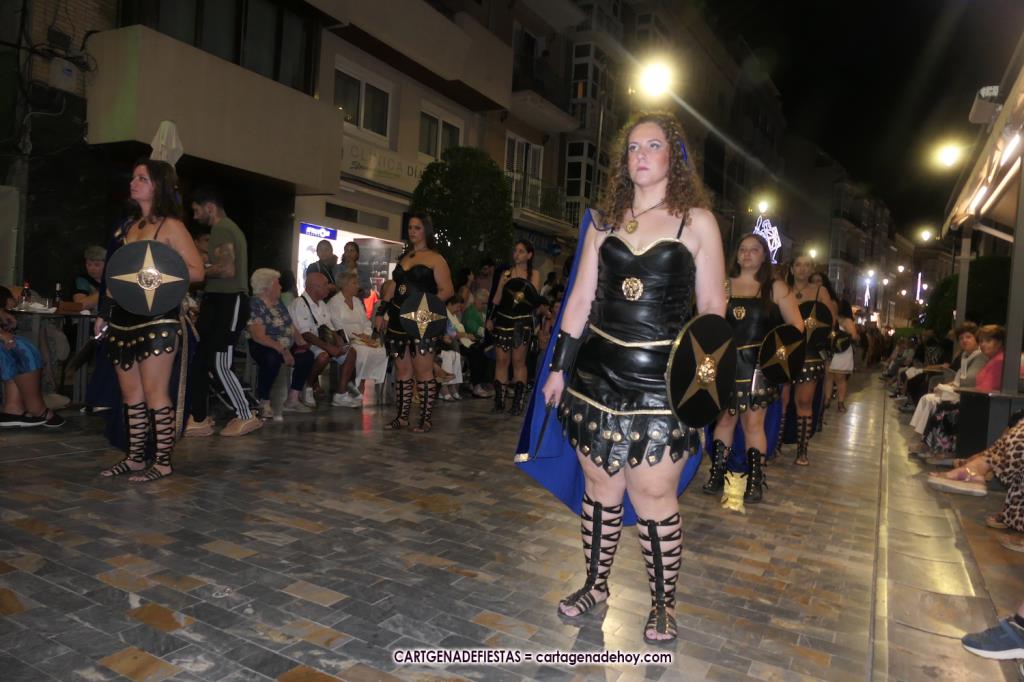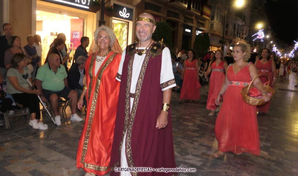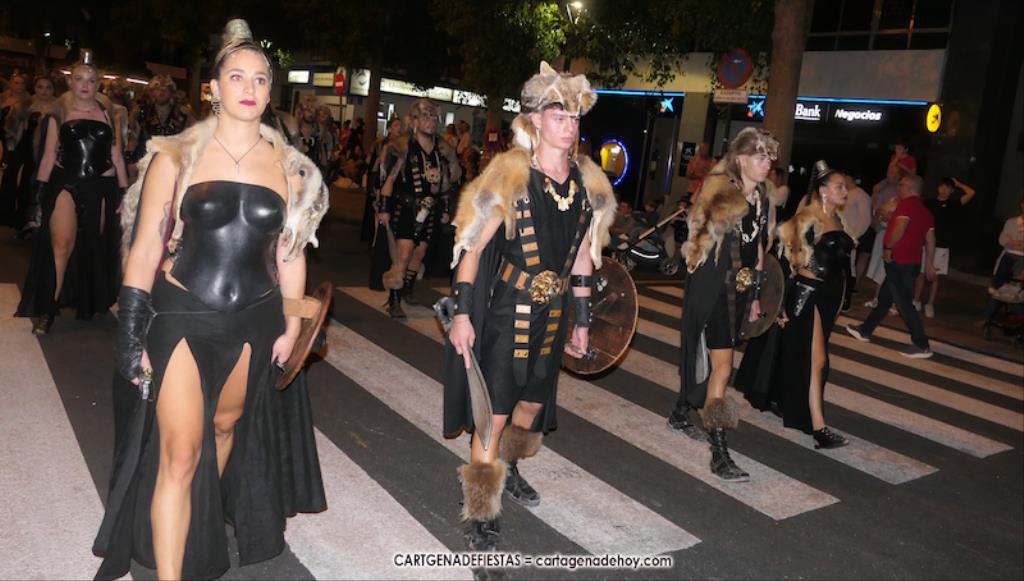 Unas cuatro mil personas (quizás más, pues hay 6.800 festeros) han desfilado por la ciudad con una gran variedad de vestuarios (todos con base histórica) y una amplia representación de personajes históricos y de dioses, unos en carne y hueso y otros a través de figuras que eran llevadas en movimiento. Durante unas tres horas, una infinidad de espectadores han disfrutado de paso de las tropas y legiones de Carthagineses y Romanos, que iban en turnos mezclados y aderezados por algunos grupos de animación. El destino ha sido el campamento.