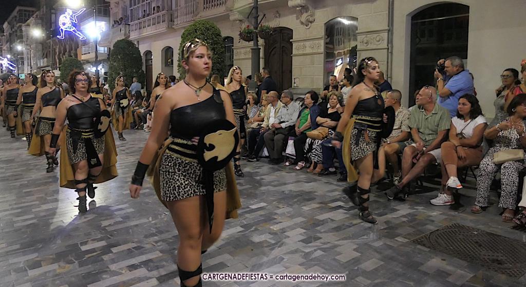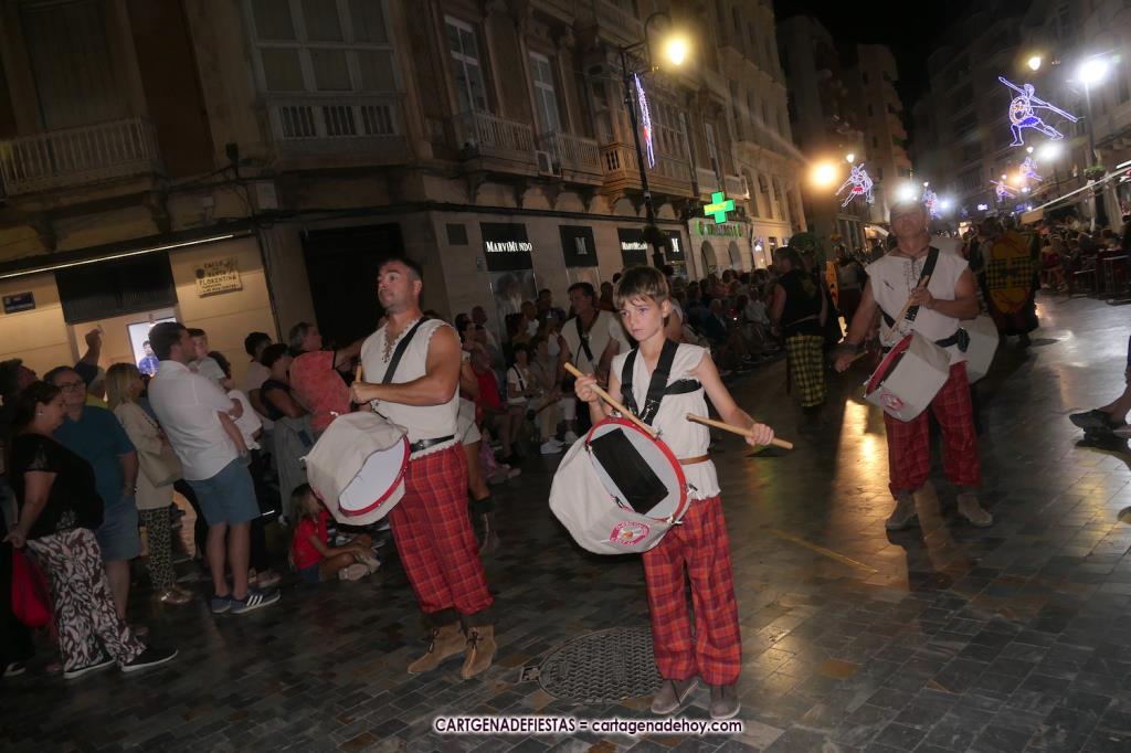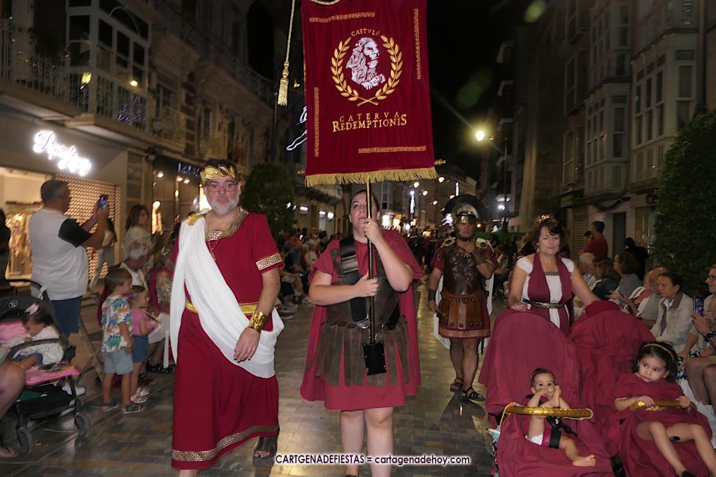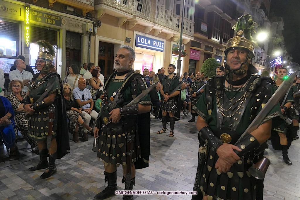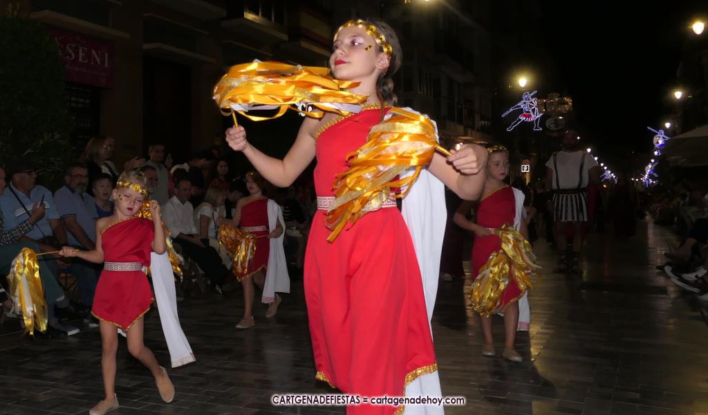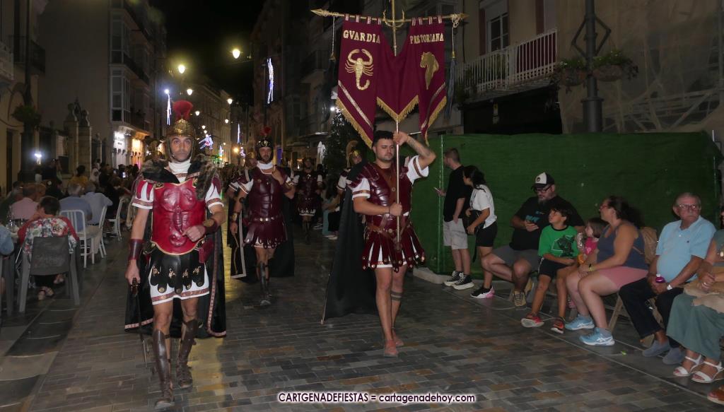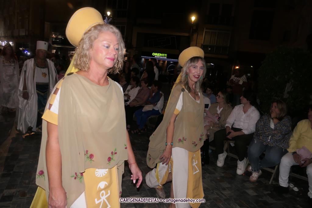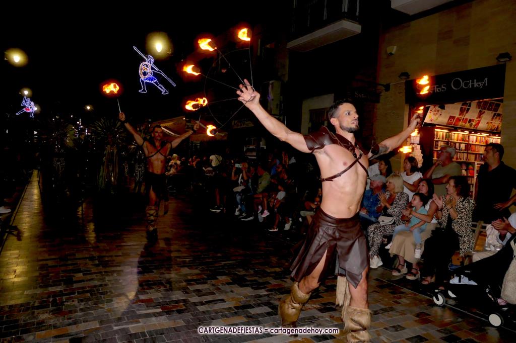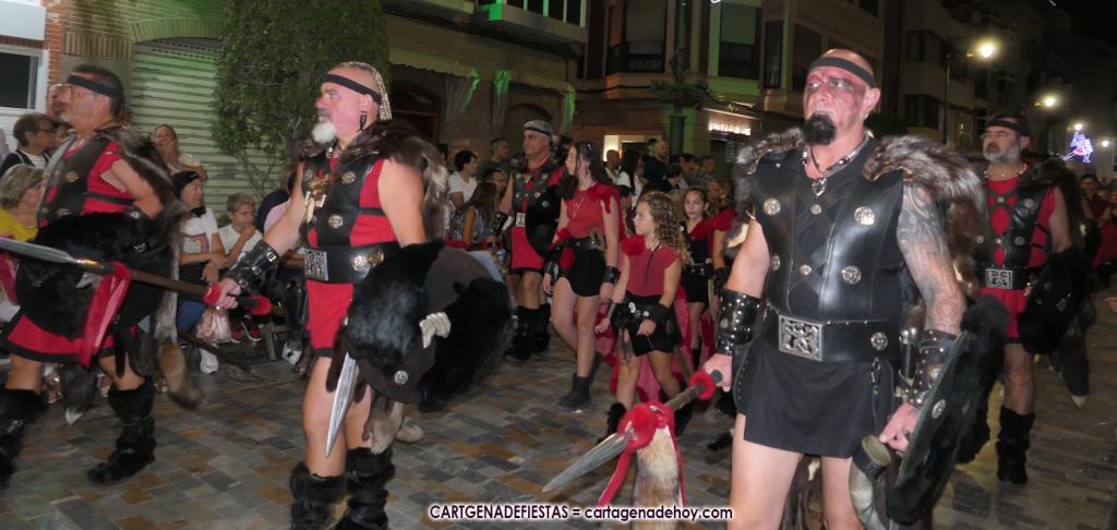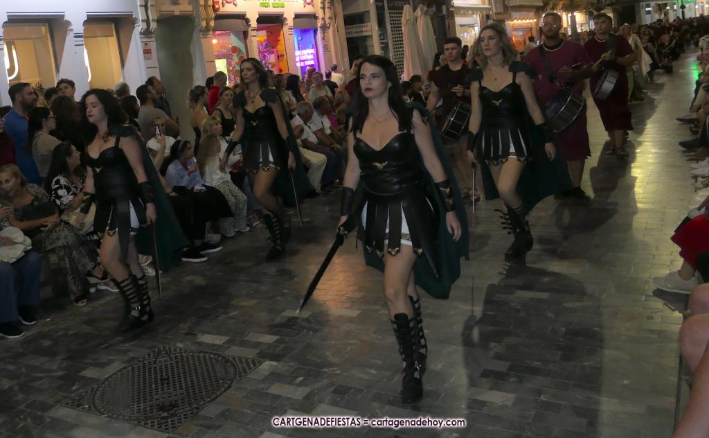 Unas cuatro mil personas (quizás más, pues hay 6.800 festeros) han desfilado por la ciudad con una gran variedad de vestuarios (todos con base histórica) y una amplia representación de personajes históricos y de dioses, unos en carne y hueso y otros a través de figuras que eran llevadas en movimiento. Durante unas tres horas, una infinidad de espectadores han disfrutado de paso de las tropas y legiones de Carthagineses y Romanos, que iban en turnos mezclados y aderezados por algunos grupos de animación. El destino ha sido el campamento.