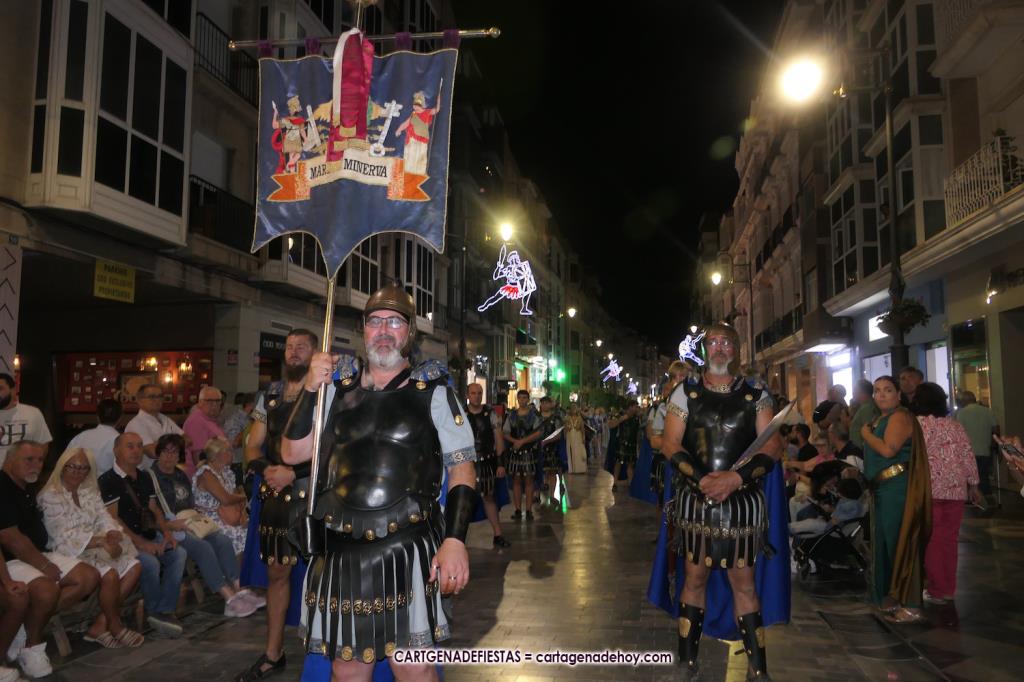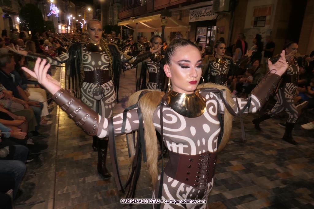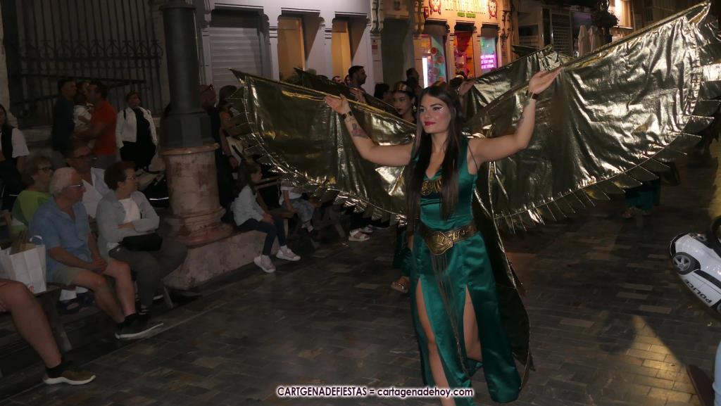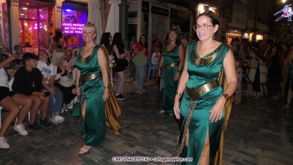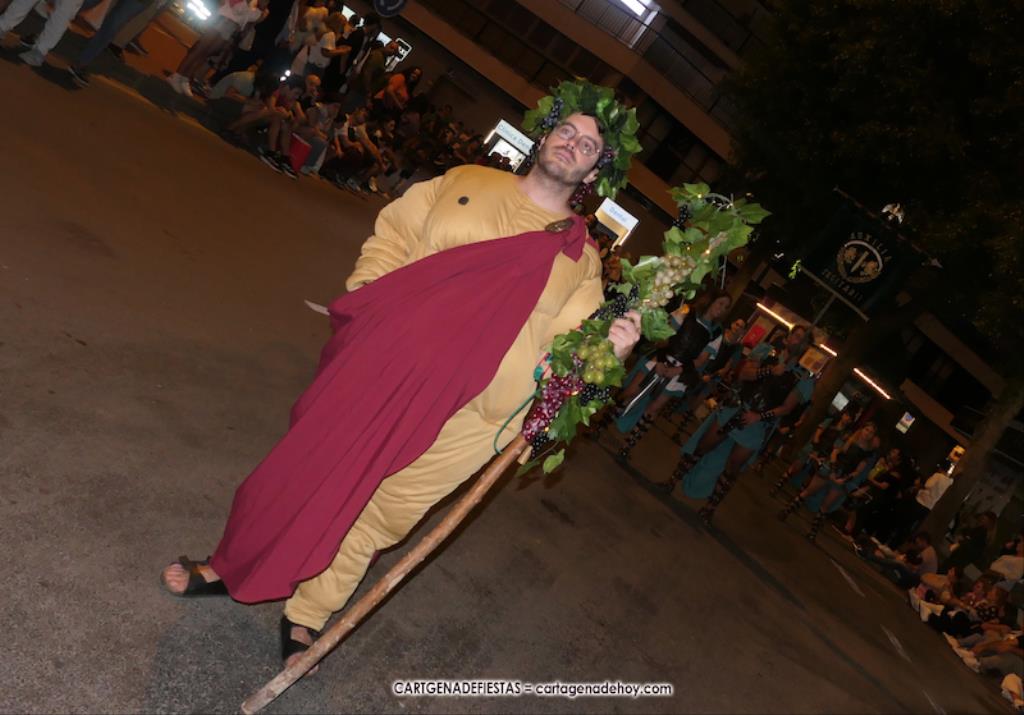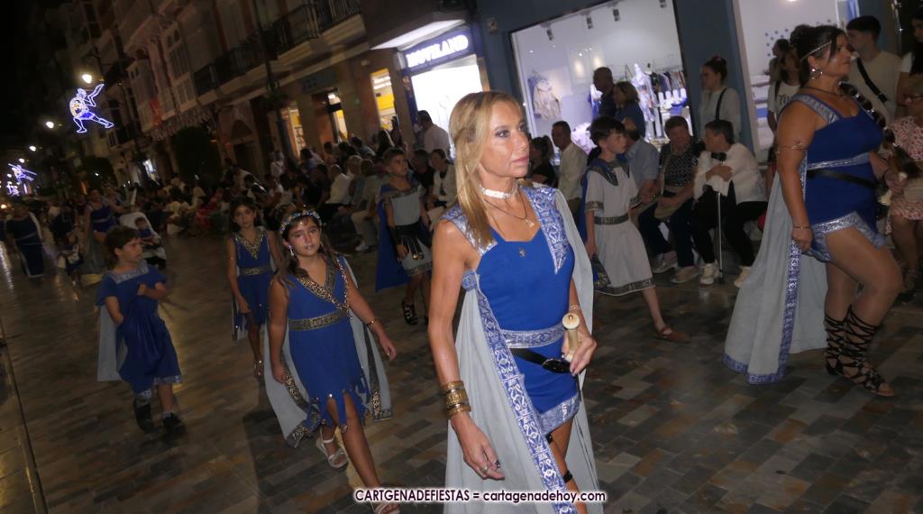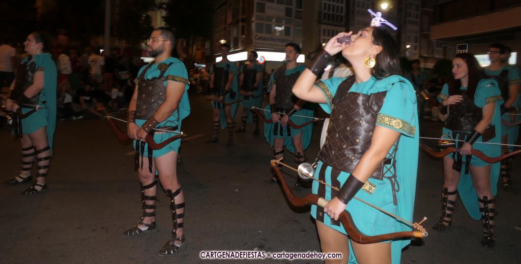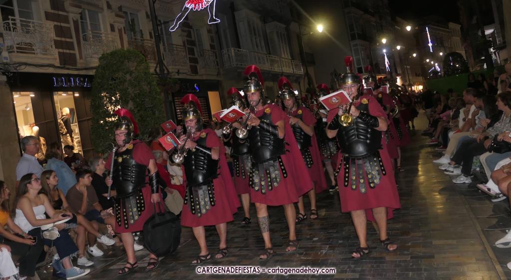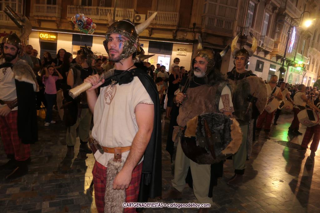 Unas cuatro mil personas (quizás más, pues hay 6.800 festeros) han desfilado por la ciudad con una gran variedad de vestuarios (todos con base histórica) y una amplia representación de personajes históricos y de dioses, unos en carne y hueso y otros a través de figuras que eran llevadas en movimiento. Durante unas tres horas, una infinidad de espectadores han disfrutado de paso de las tropas y legiones de Carthagineses y Romanos, que iban en turnos mezclados y aderezados por algunos grupos de animación. El destino ha sido el campamento.