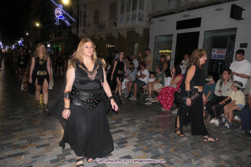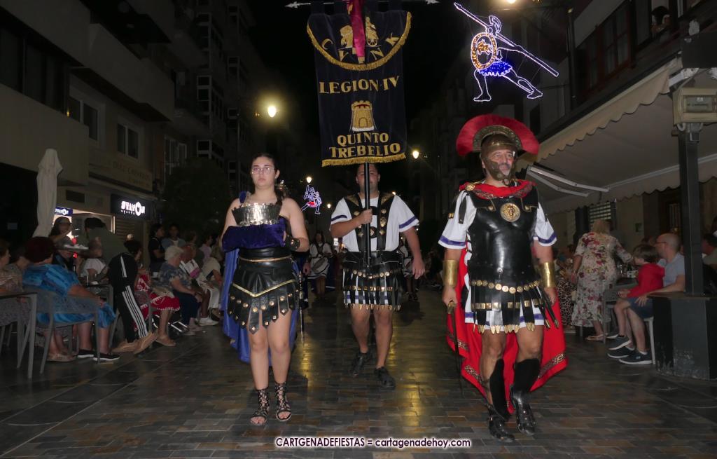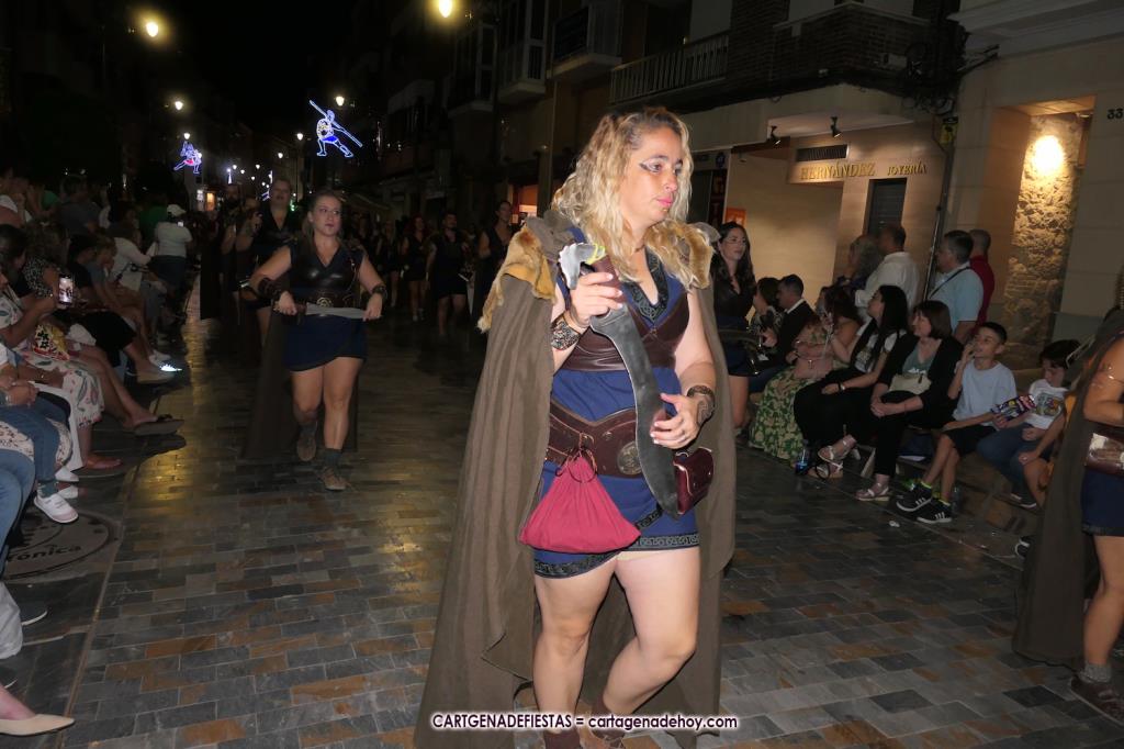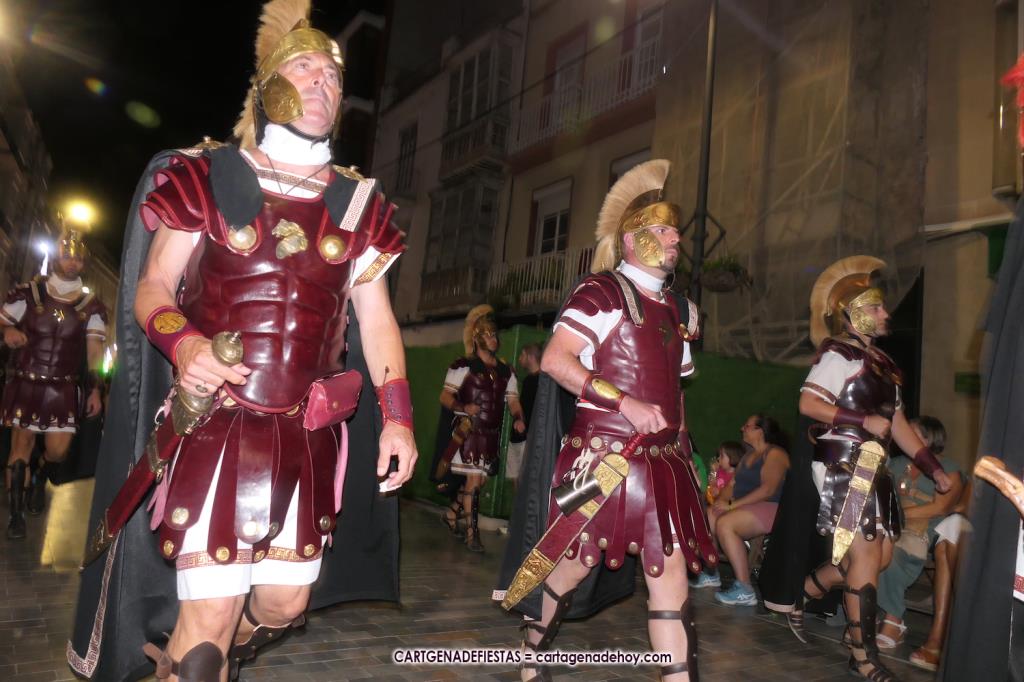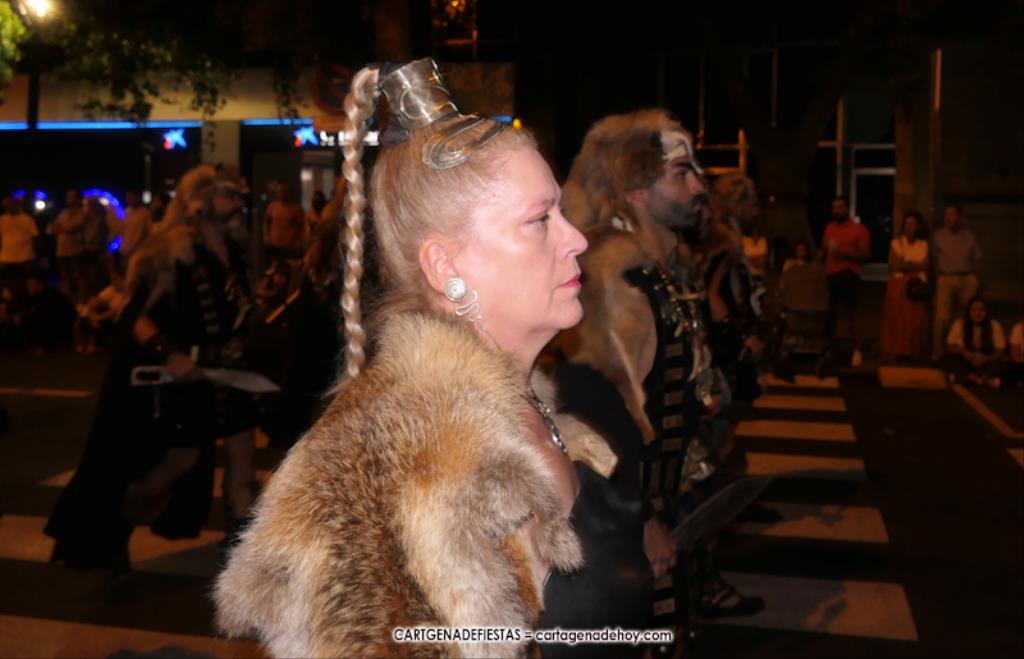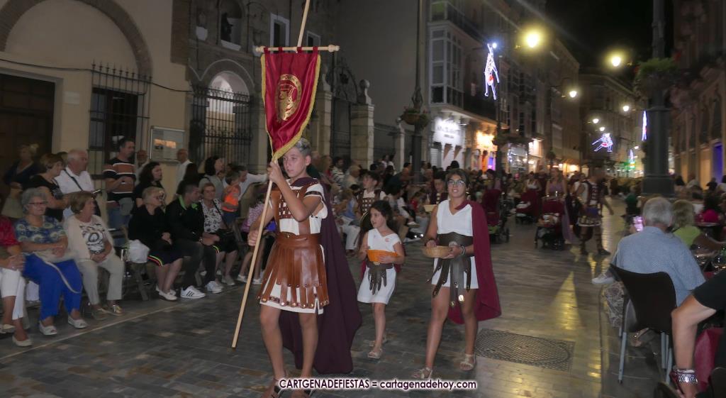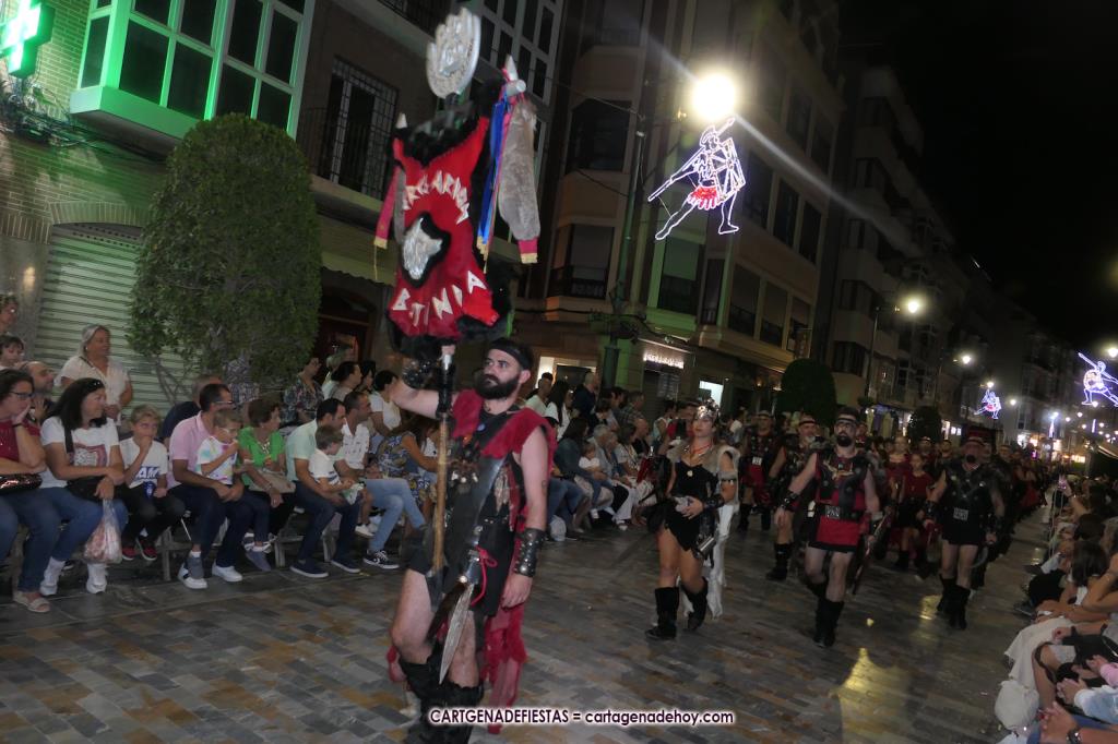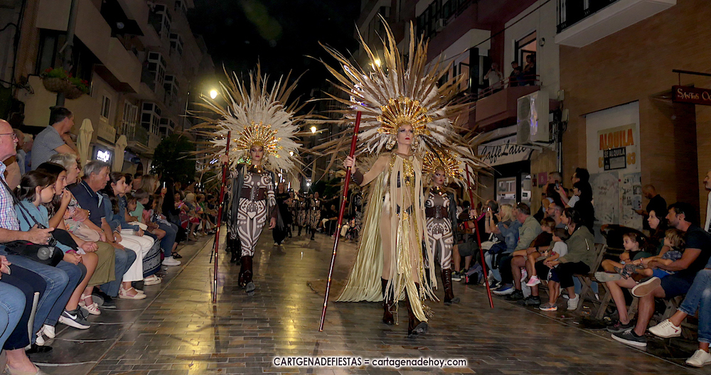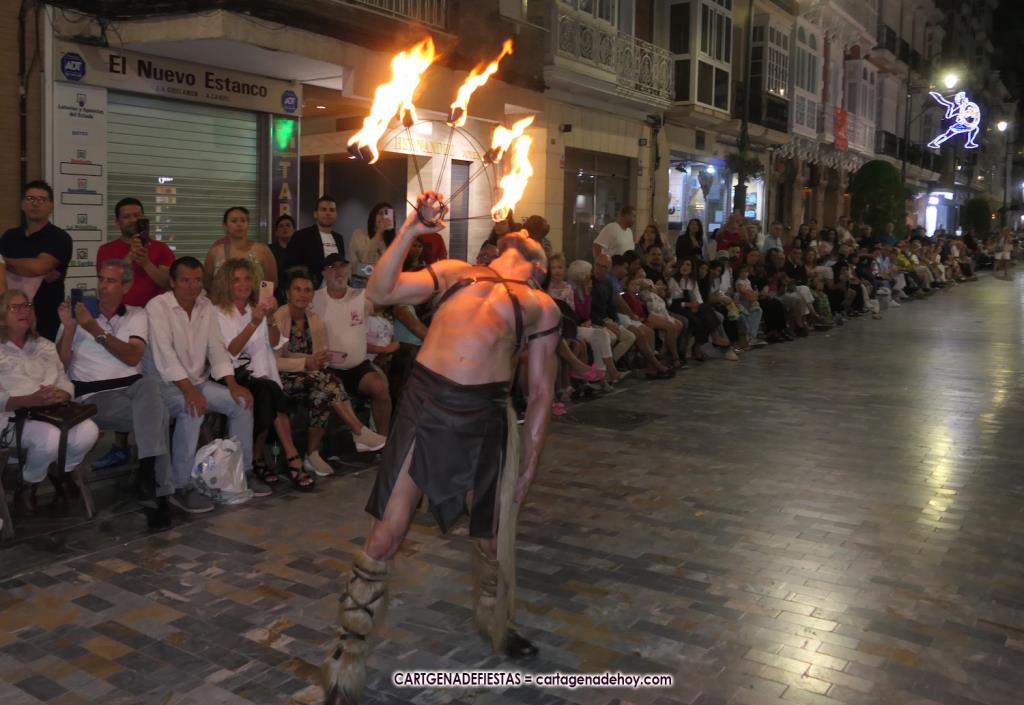 Unas cuatro mil personas (quizás más, pues hay 6.800 festeros) han desfilado por la ciudad con una gran variedad de vestuarios (todos con base histórica) y una amplia representación de personajes históricos y de dioses, unos en carne y hueso y otros a través de figuras que eran llevadas en movimiento. Durante unas tres horas, una infinidad de espectadores han disfrutado de paso de las tropas y legiones de Carthagineses y Romanos, que iban en turnos mezclados y aderezados por algunos grupos de animación. El destino ha sido el campamento.